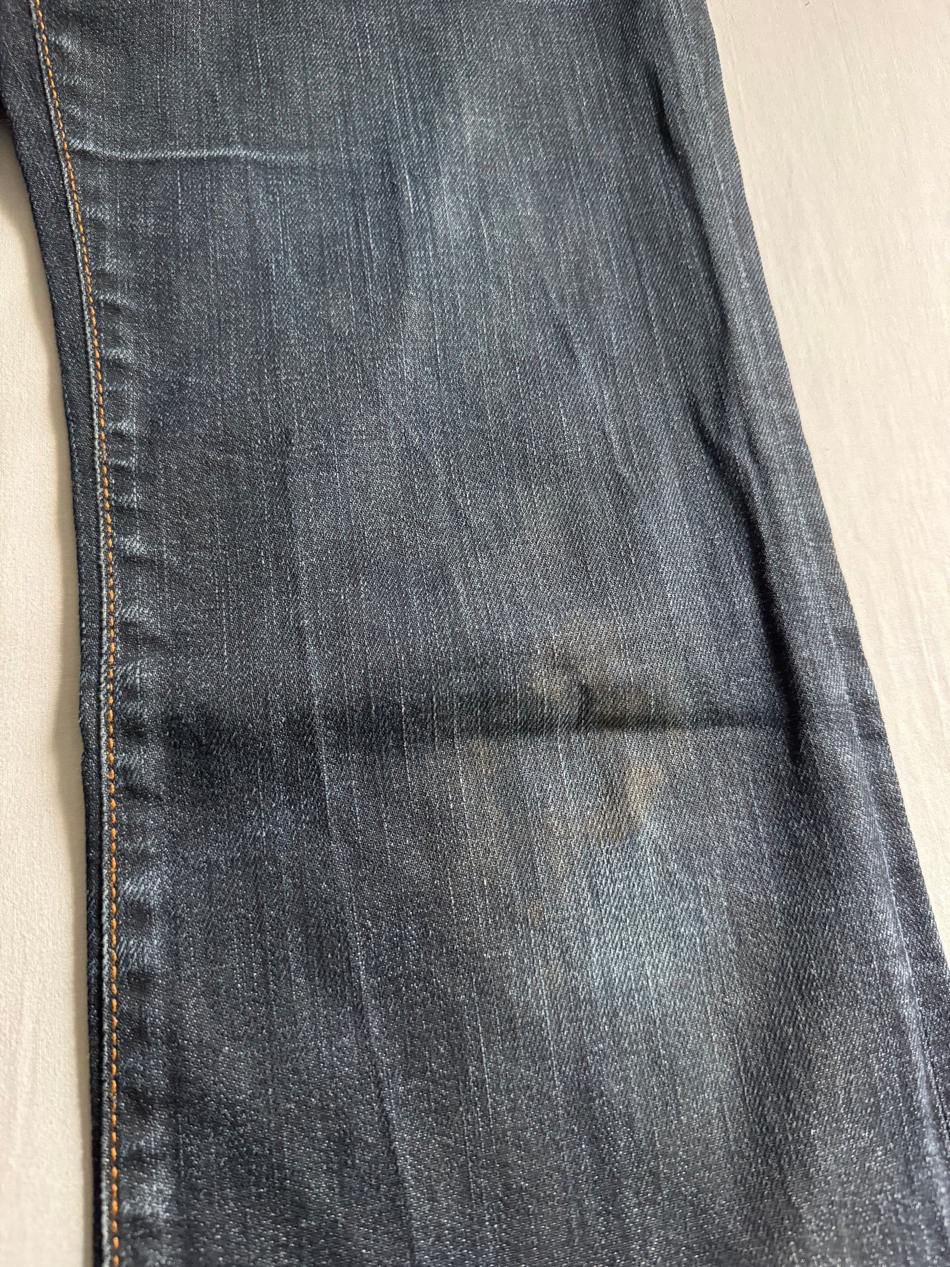 Jeans Y2K Diesel, model Ronhar, cu croială bootcut și talie medie, concepuți pentru femei. Realizați în Italia din denim de calitate superioară, oferă un look feminin și autentic, specific începutului anilor 2000. Prezintă pete discrete simetrice la genunchi, posibil parte a designului, dar nu afectează purtabilitatea. Se află în stare foarte bună.