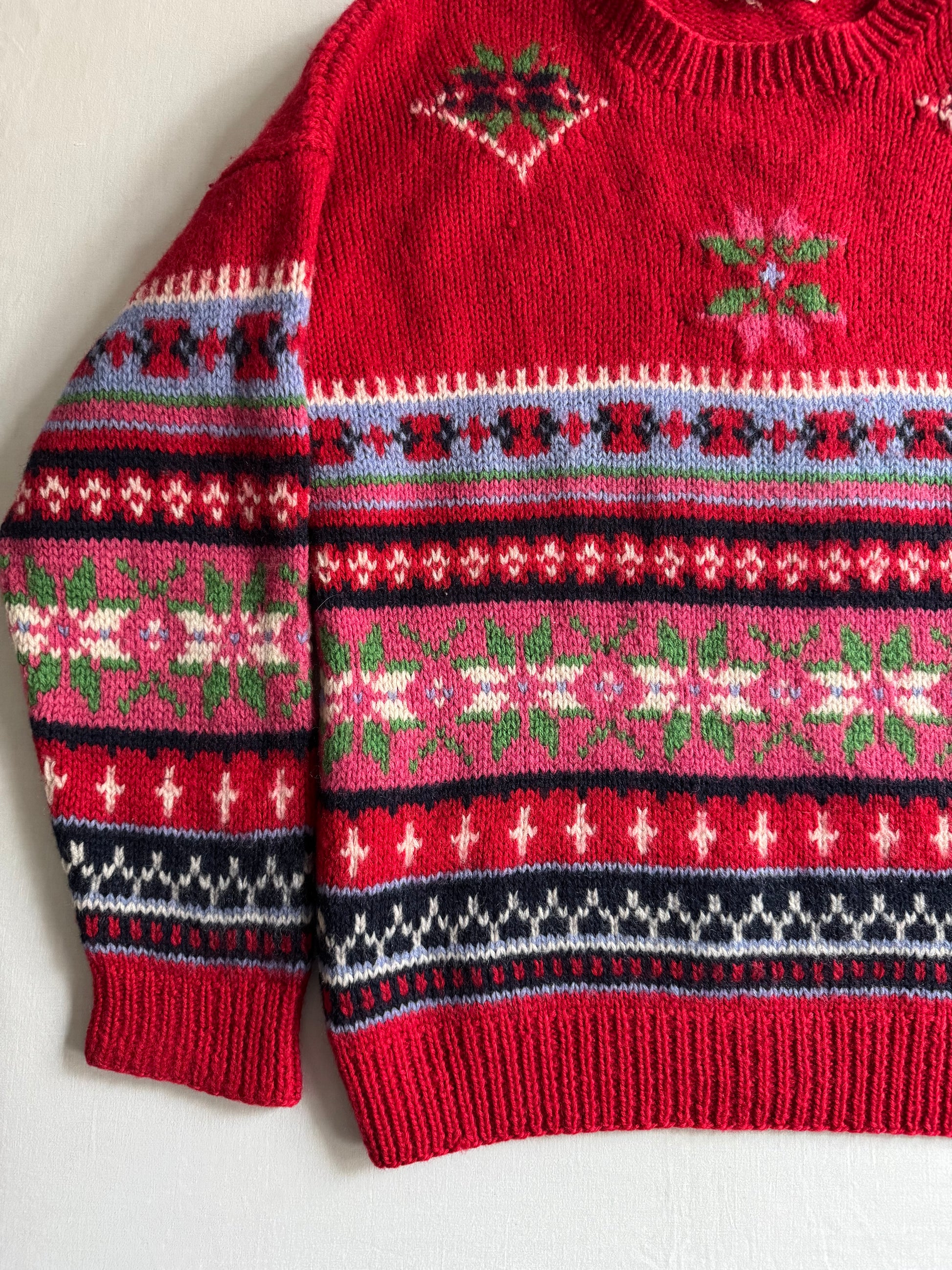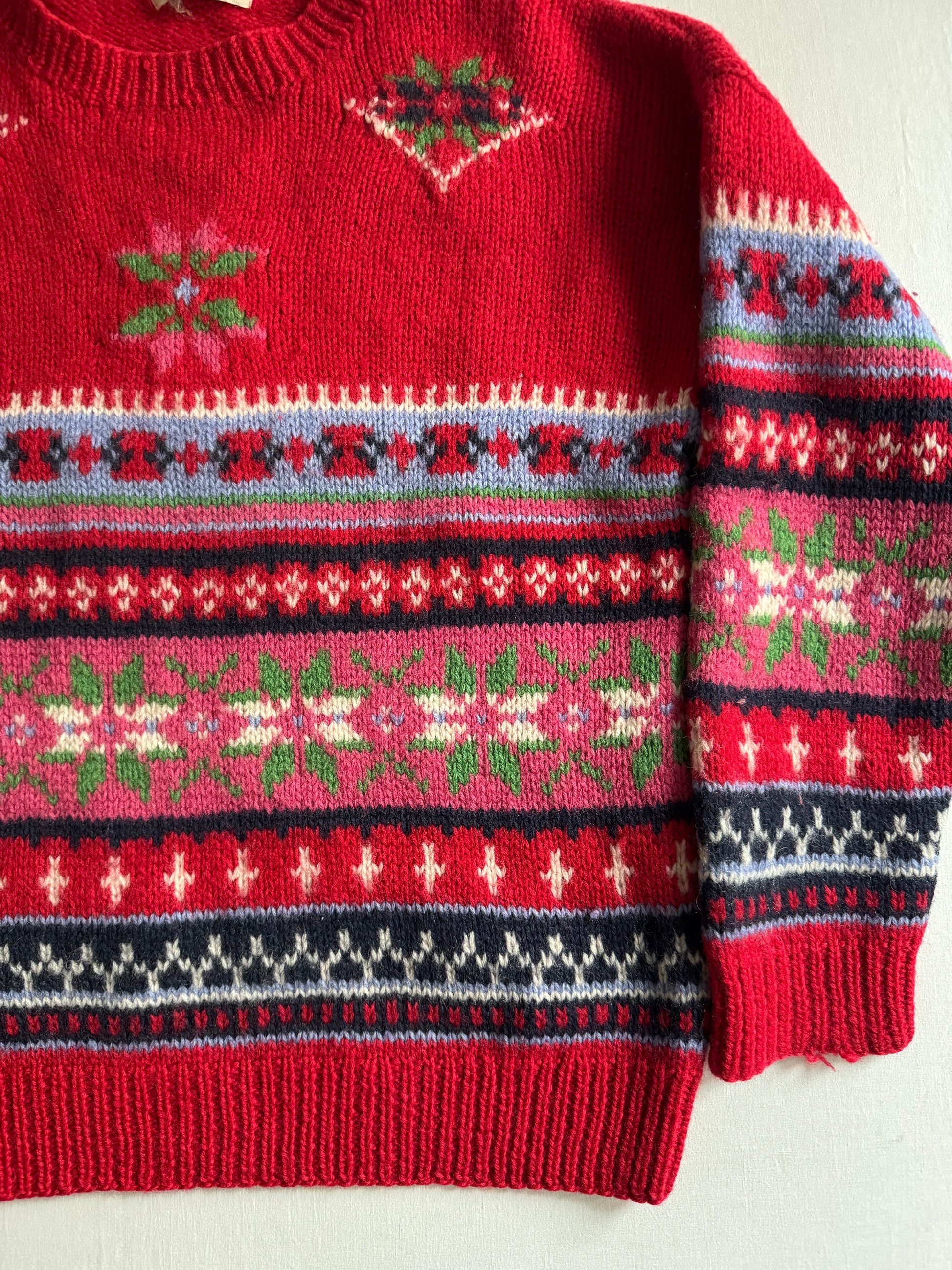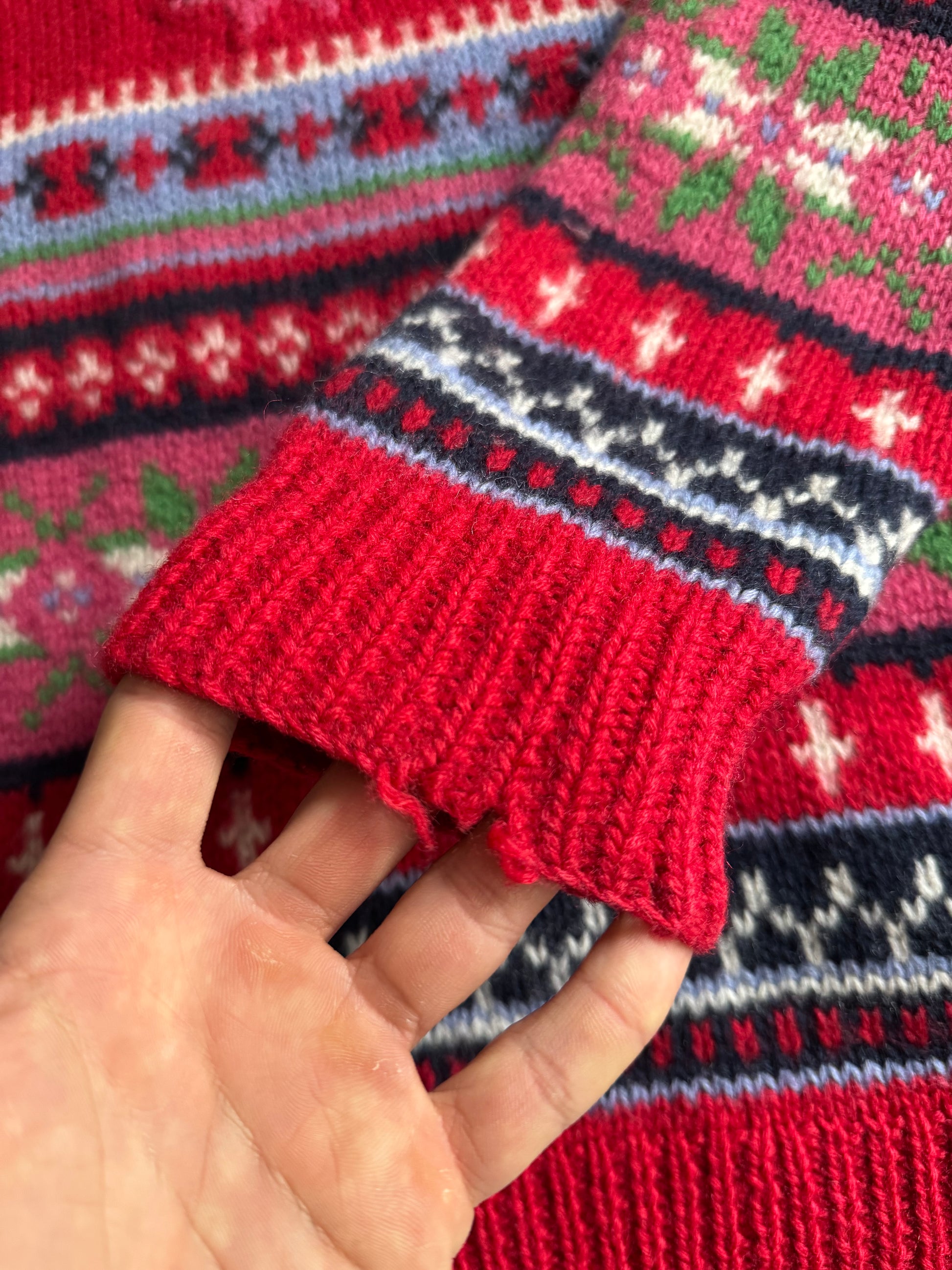 ❤️ Pulover Vintage Roșu cu Model Festiv – 100% Lână – Mărime M