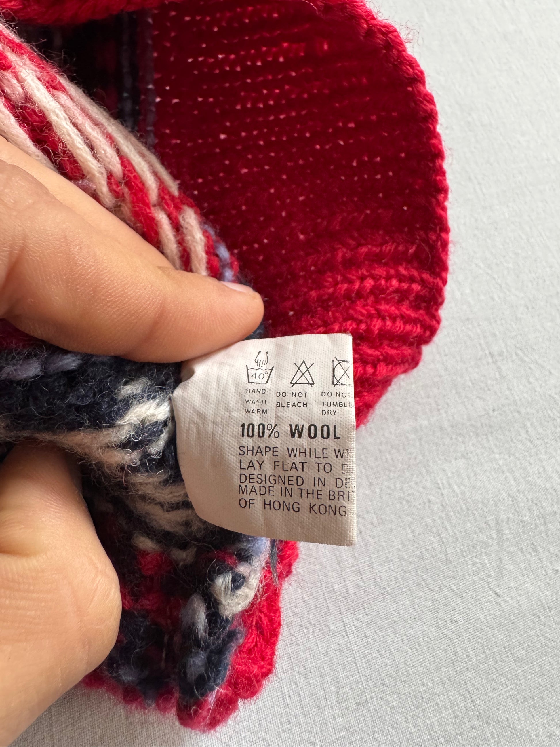 Pulover vintage cu model festiv în nuanțe de roșu, realizat din 100% lână naturală, ideal pentru sezonul rece. Țesătură densă, călduroasă și confortabilă, potrivită pentru ținute casual sau de iarnă cu aer retro.