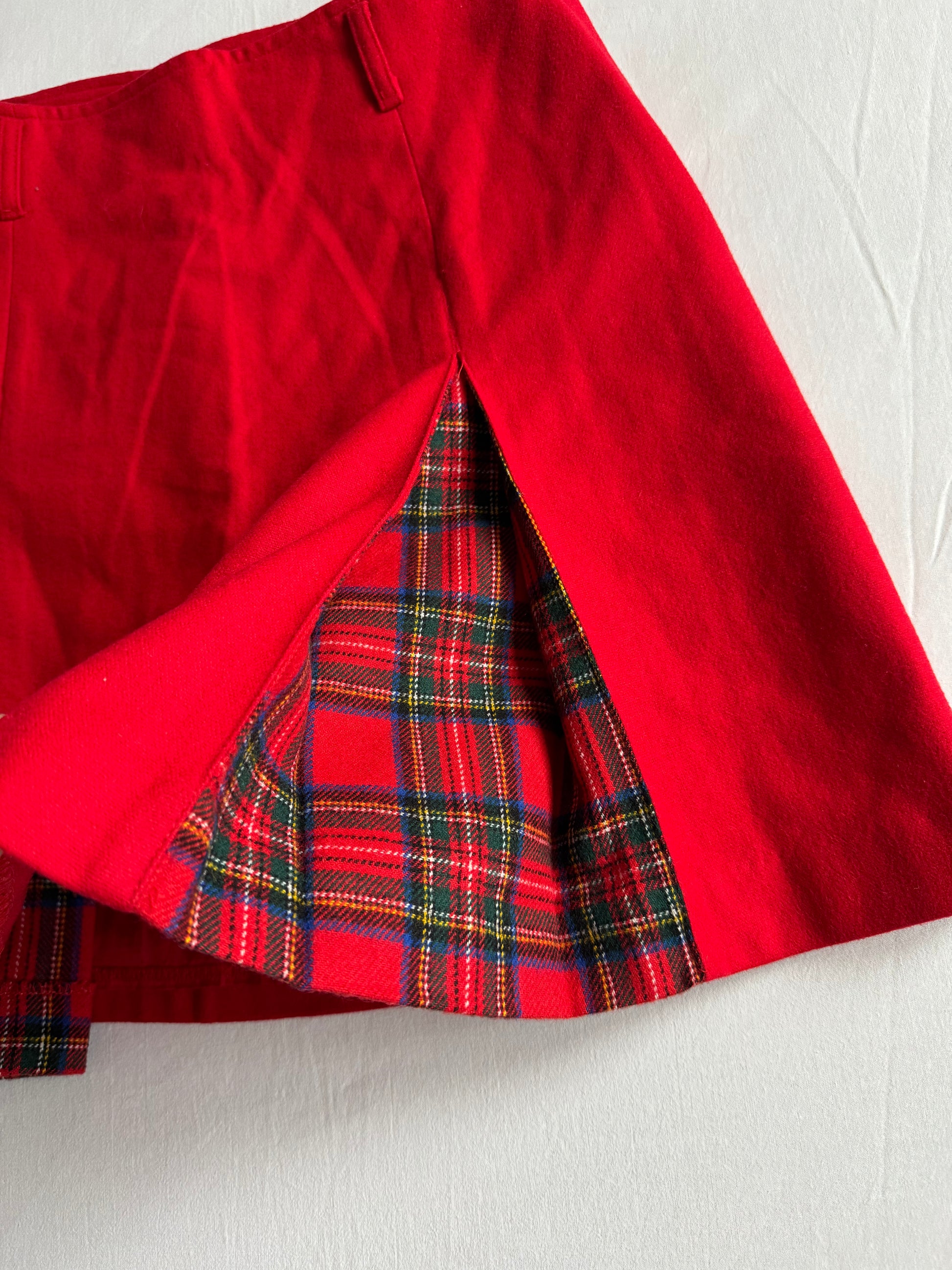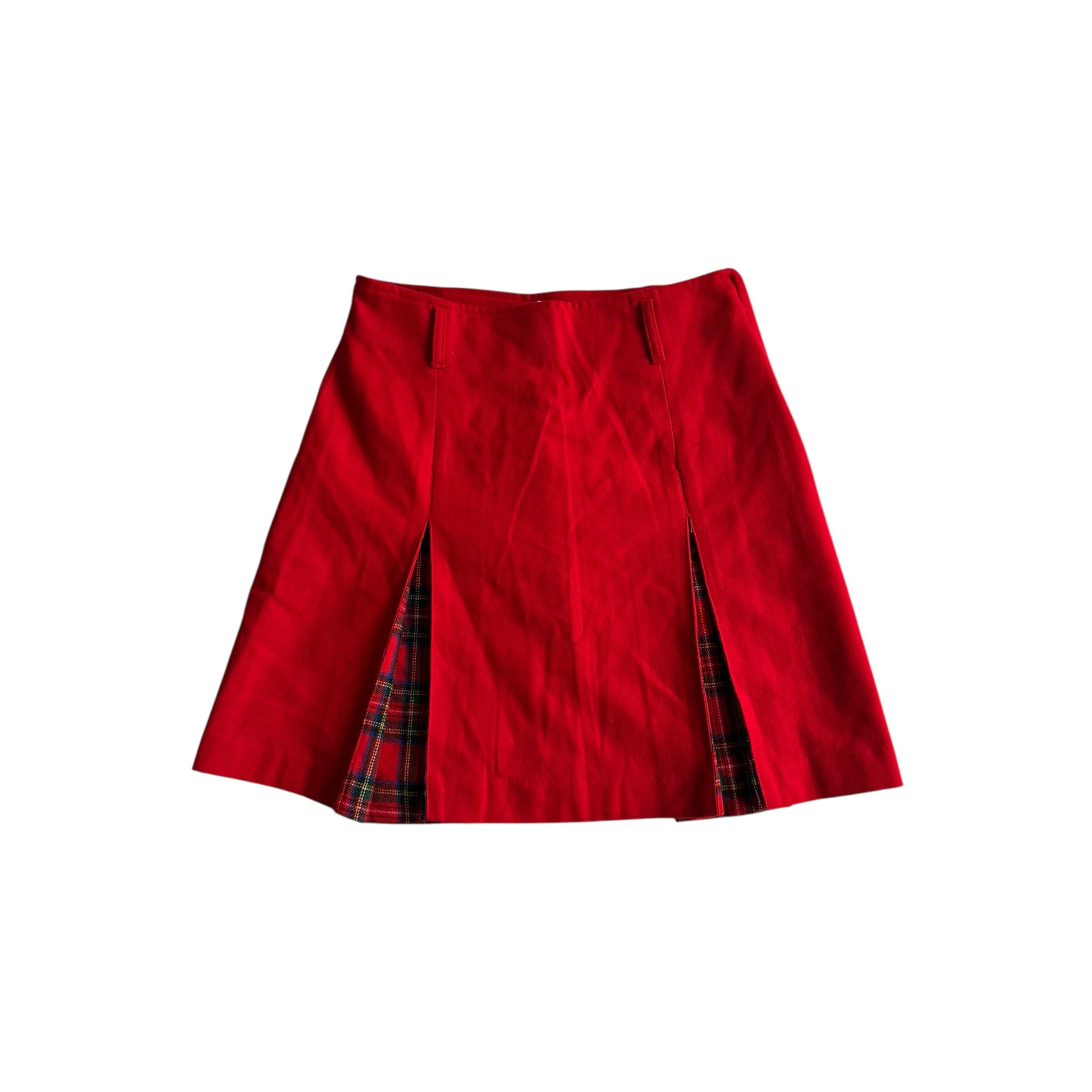 FustÄ vintage pentru femei, realizatÄ din 80% lĆ¢nÄ, de culoare roČie, cu design plisat Či inserČiiĀ tartan decorative, oferind un look clasic Či elegant. CroialÄ potrivitÄ pentru un M damÄ (etichetÄ IT 44). FabricatÄ Ć®n Italia Či pÄstratÄ Ć®n stare foarte bunÄ.
