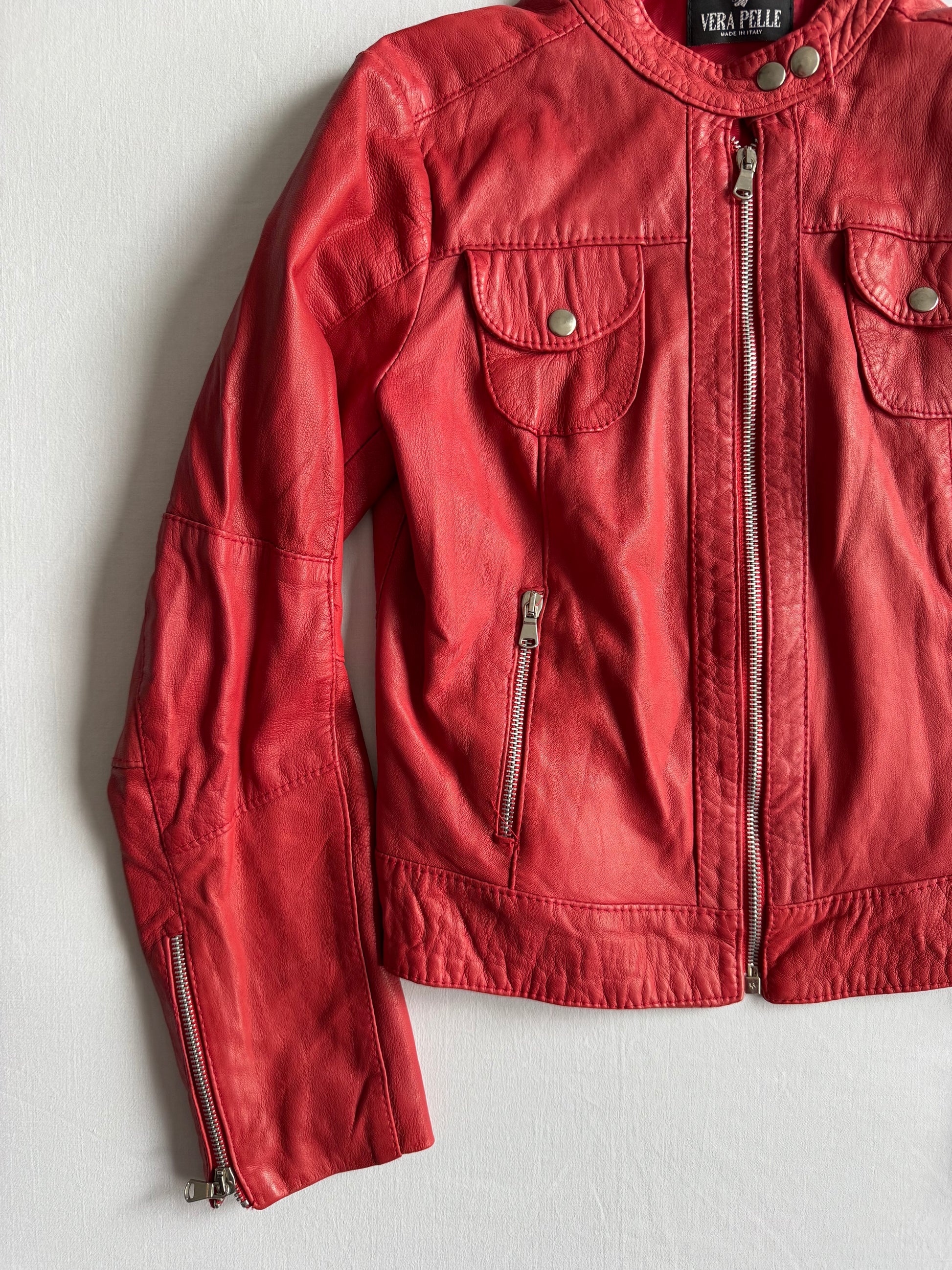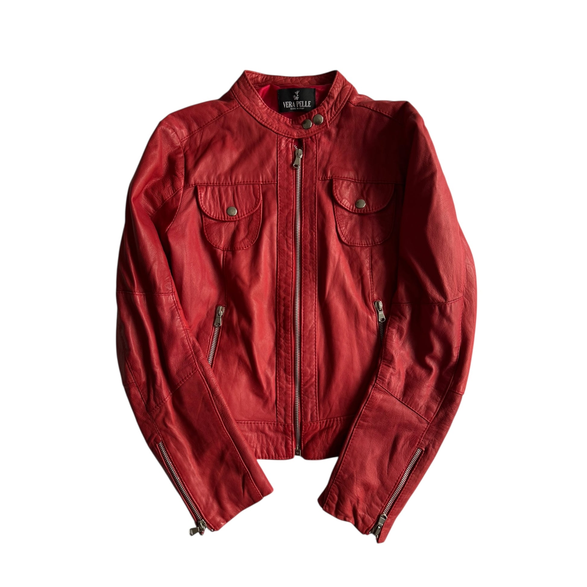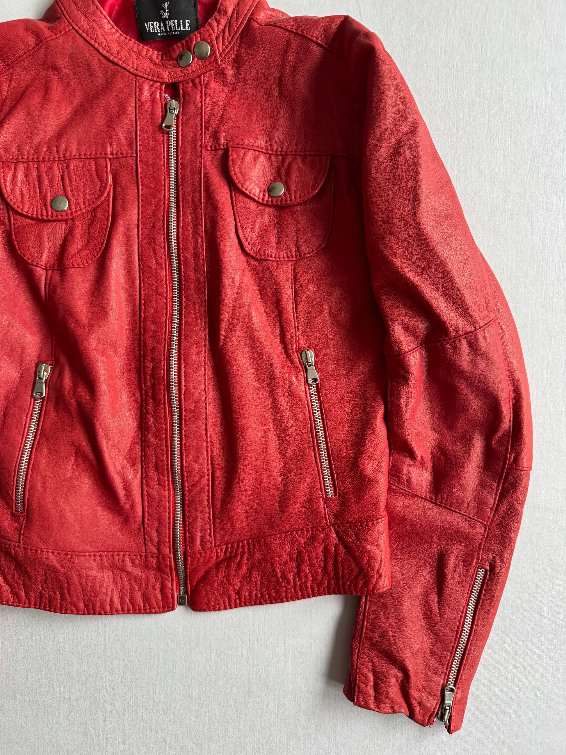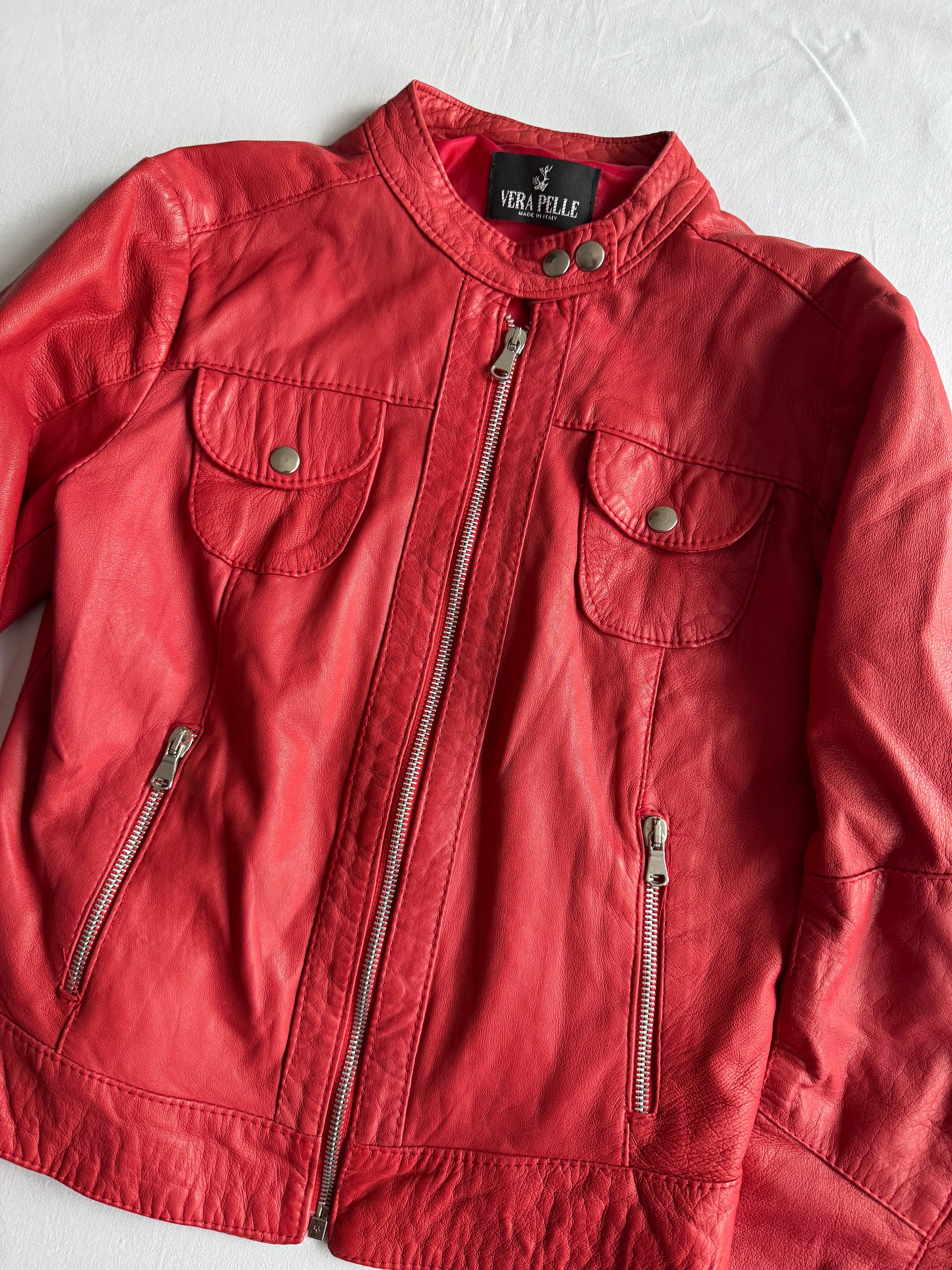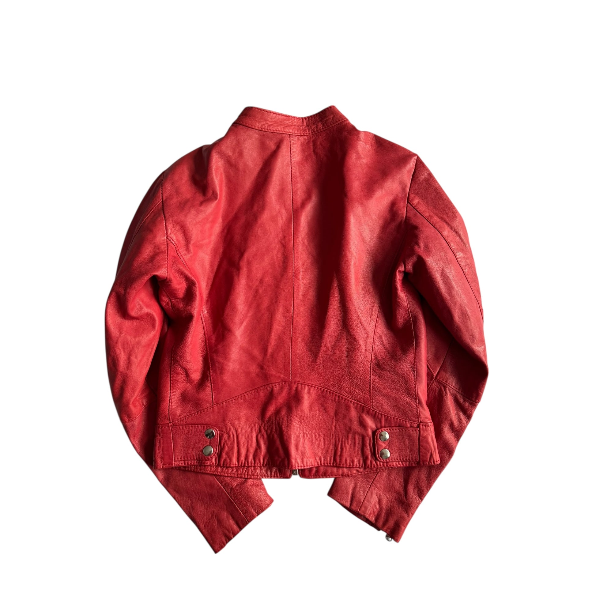 Jachetă Y2K stil cafe racer, realizată din piele naturală într-o nuanță intensă de roșu. Design minimalist, siluetă feminină și detalii curate, specifice esteticii anilor 2000. Fabricată în Italia, piele moale și de calitate. Stare foarte bună, fără defecte notabile.