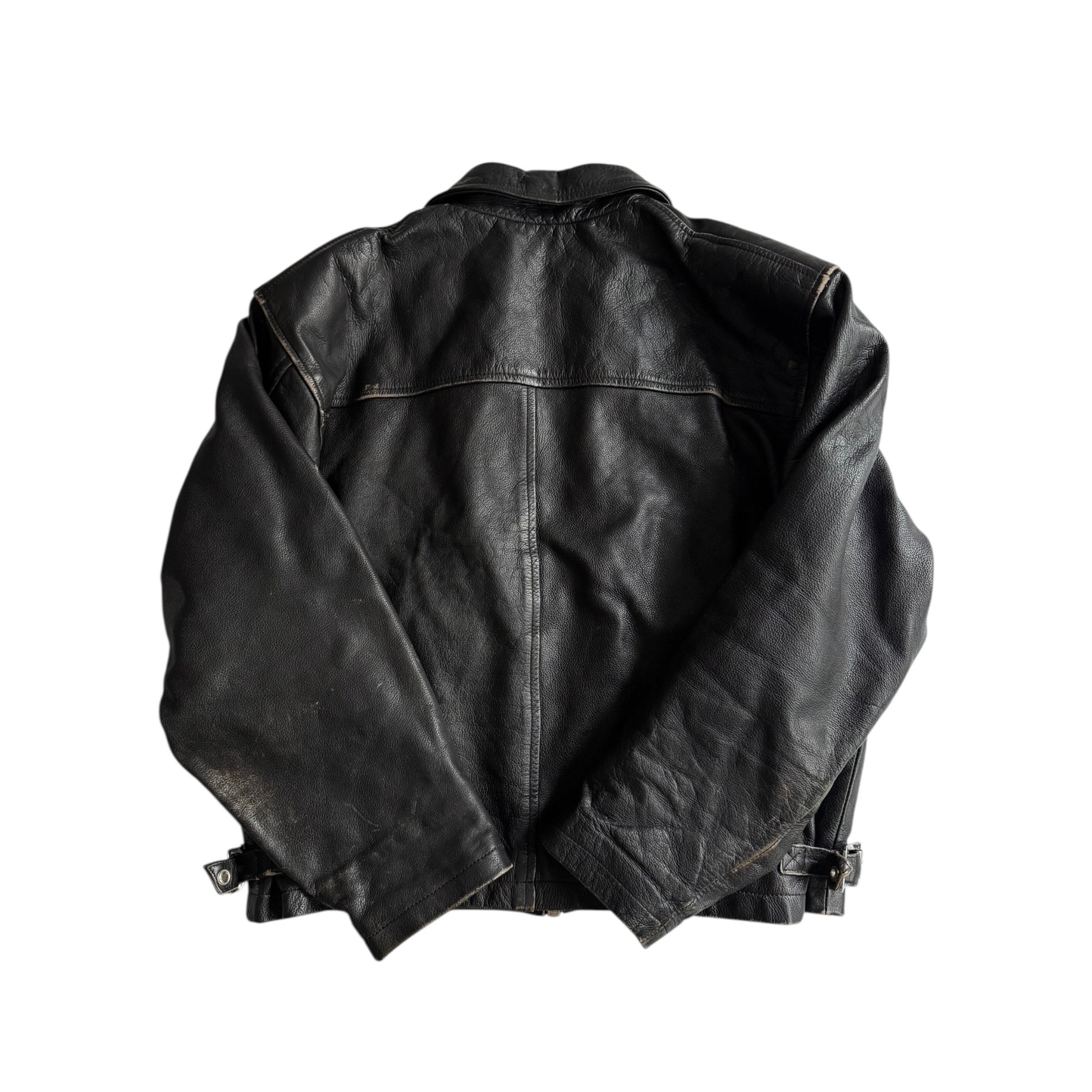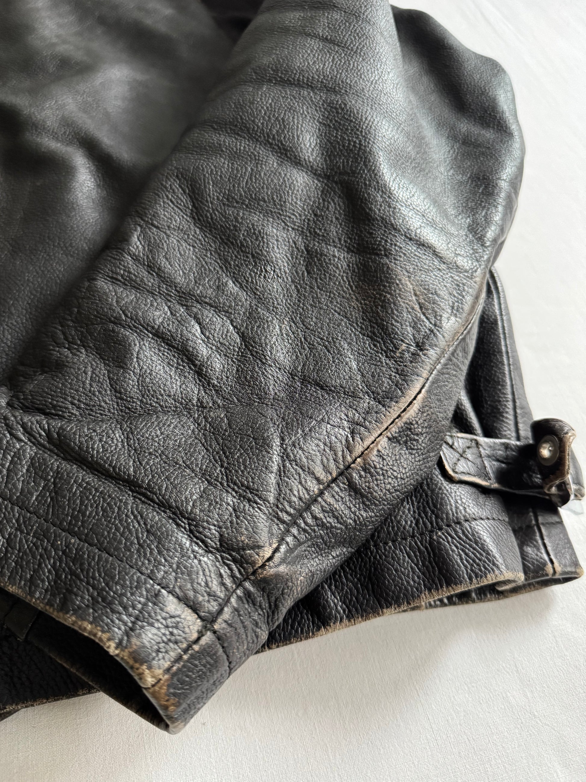 Geacă vintage din piele naturală neagră, cu o croială cropped perfect proporționată, ce oferă un look modern și masculin. Pielea are o patină frumoasă, cu urme fine de purtare ce adaugă caracter și autenticitate piesei.