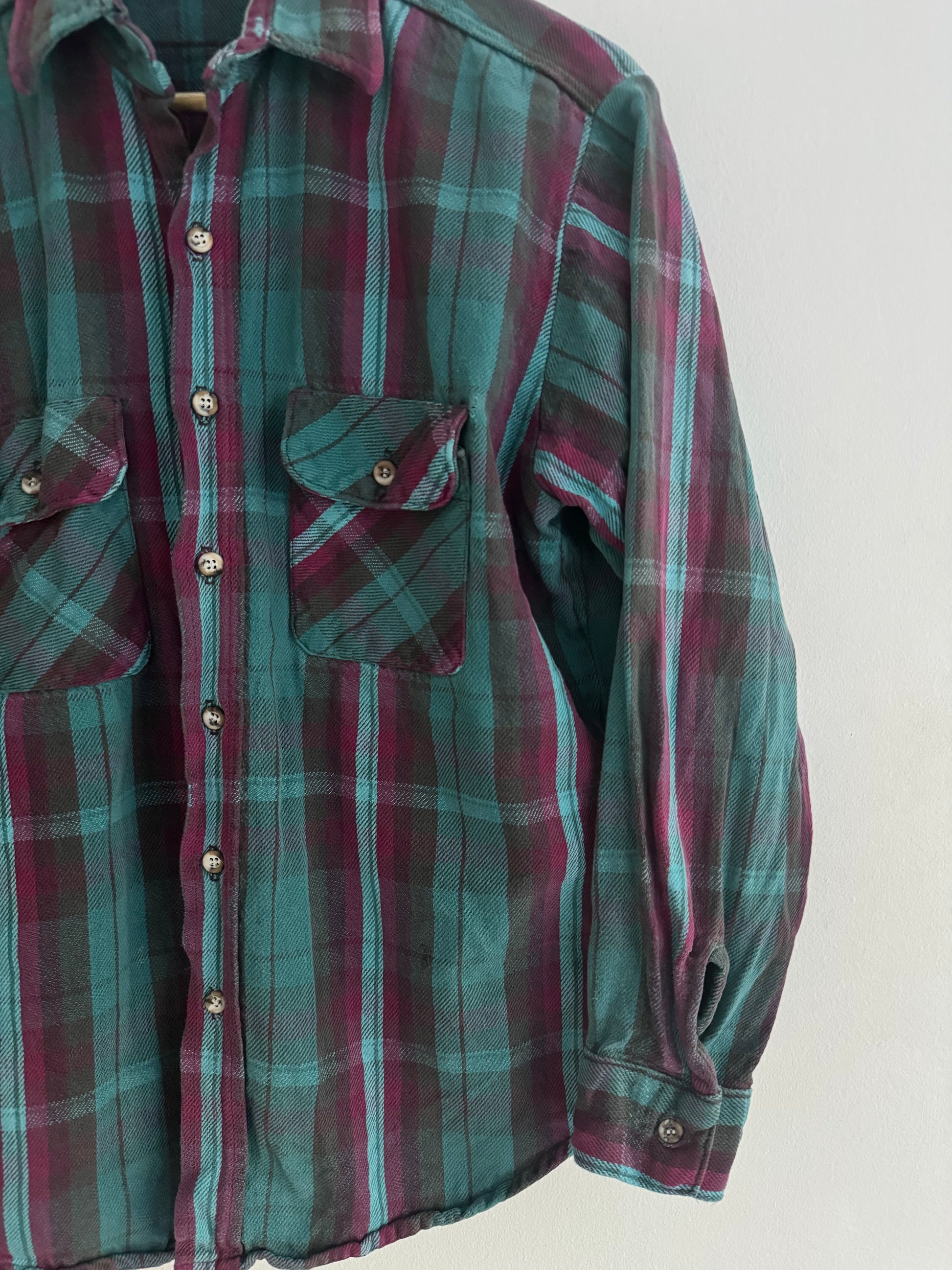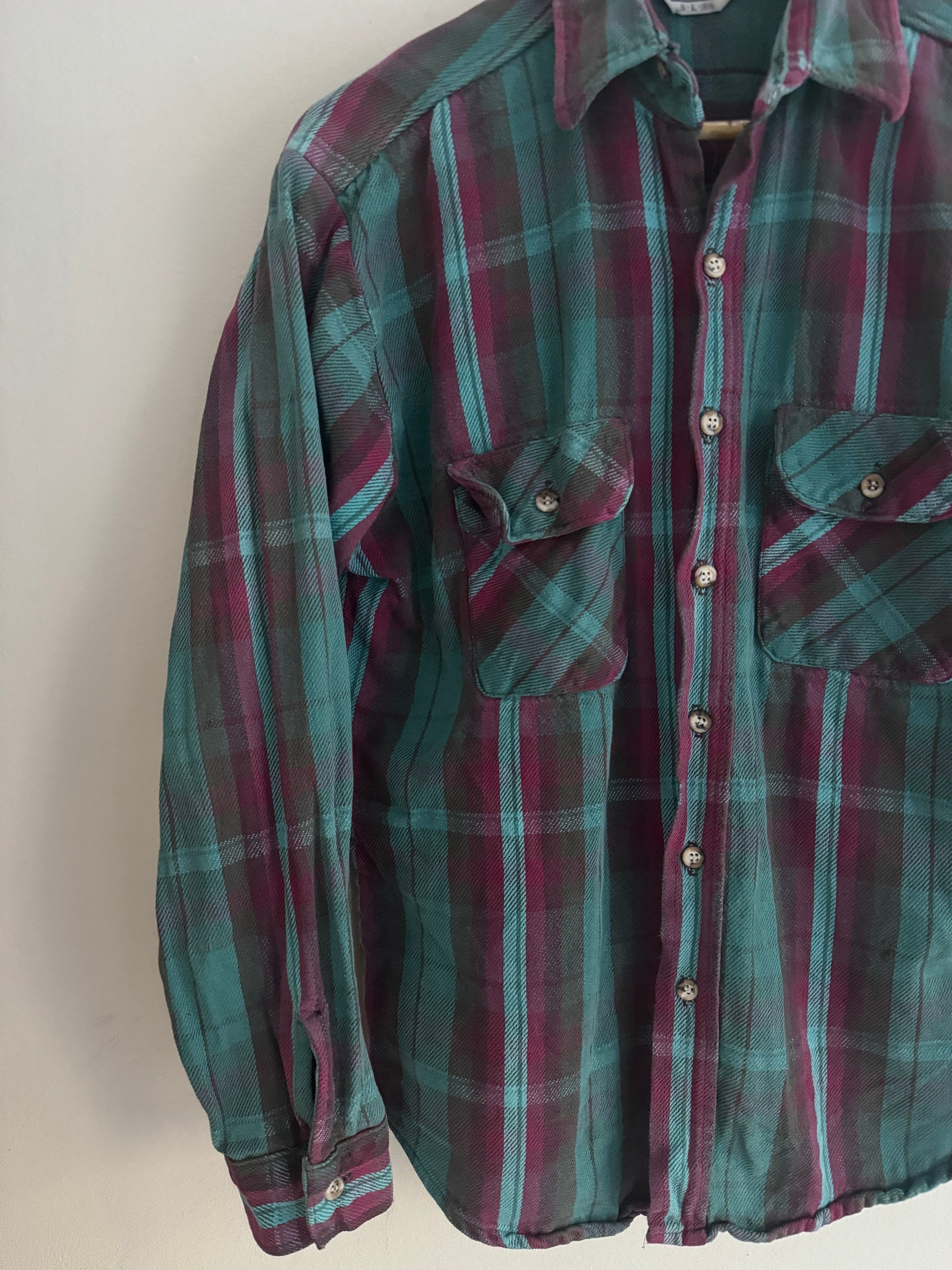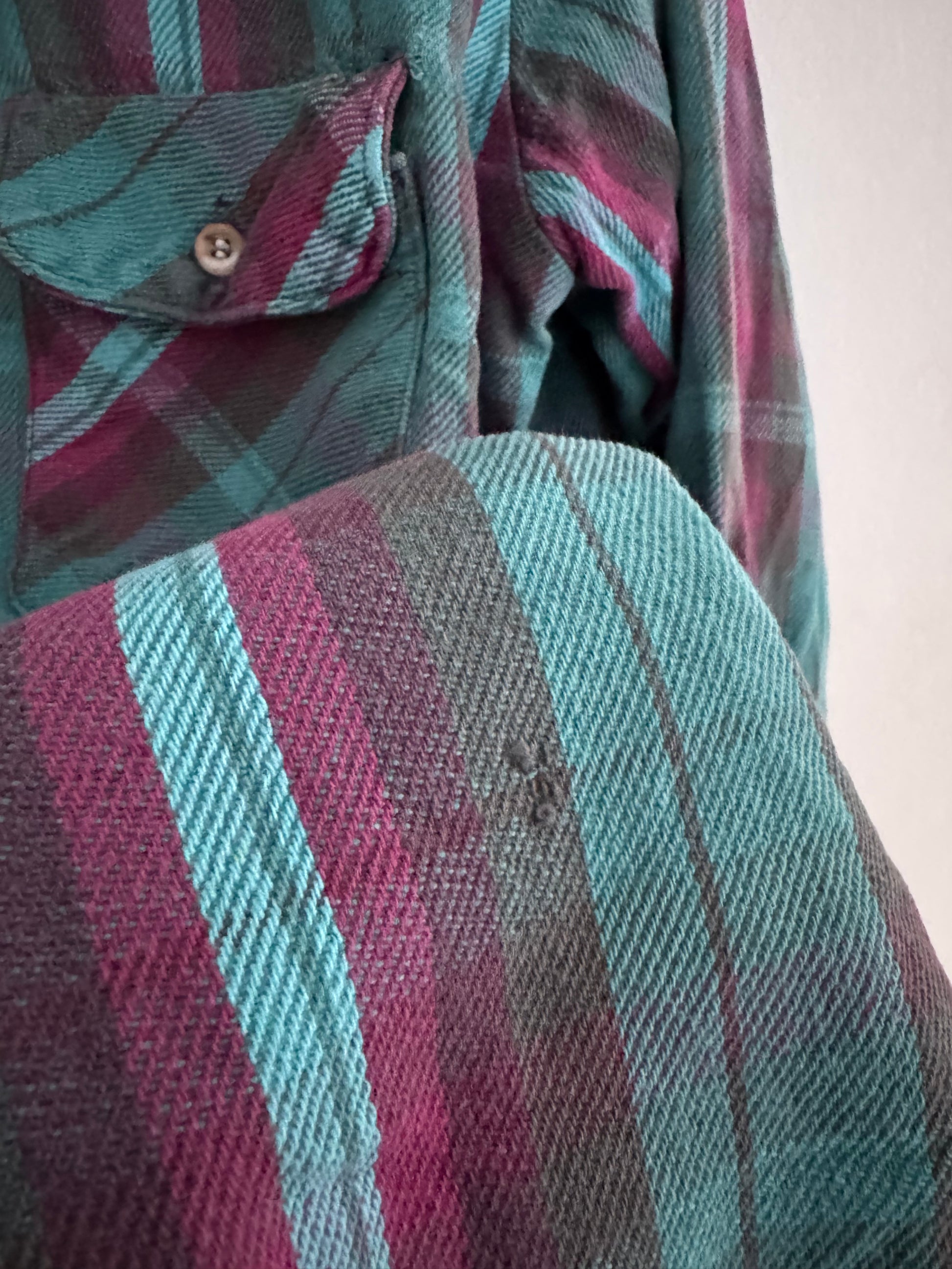 Cămașă flannel vintage Five Brother din anii ’70, fabricată în SUA, un model clasic workwear american. Material gros și rezistent, cu croială autentică. Deși este etichetată mărimea L, se potrivește mai bine unui M. Stare bună per total, cu câteva mici imperfecțiuni vizibile în poze, normale pentru vârsta piesei.