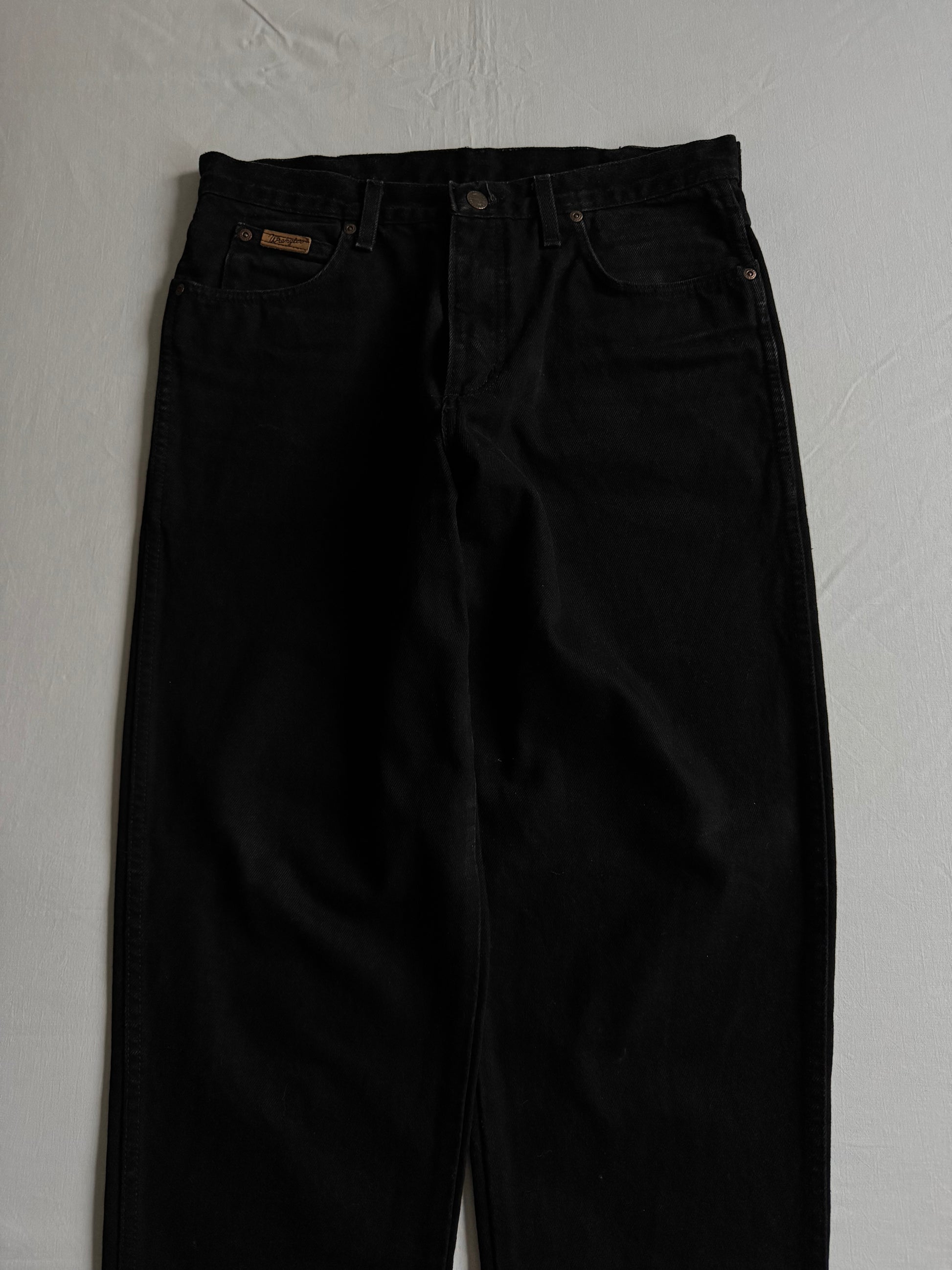 Blugi Wrangler model Ohio, fabricați în Marea Britanie, într-o nuanță neagră clasică. Croială regular fit, denim rezistent și siluetă timeless. Stare foarte bună, fără defecte.