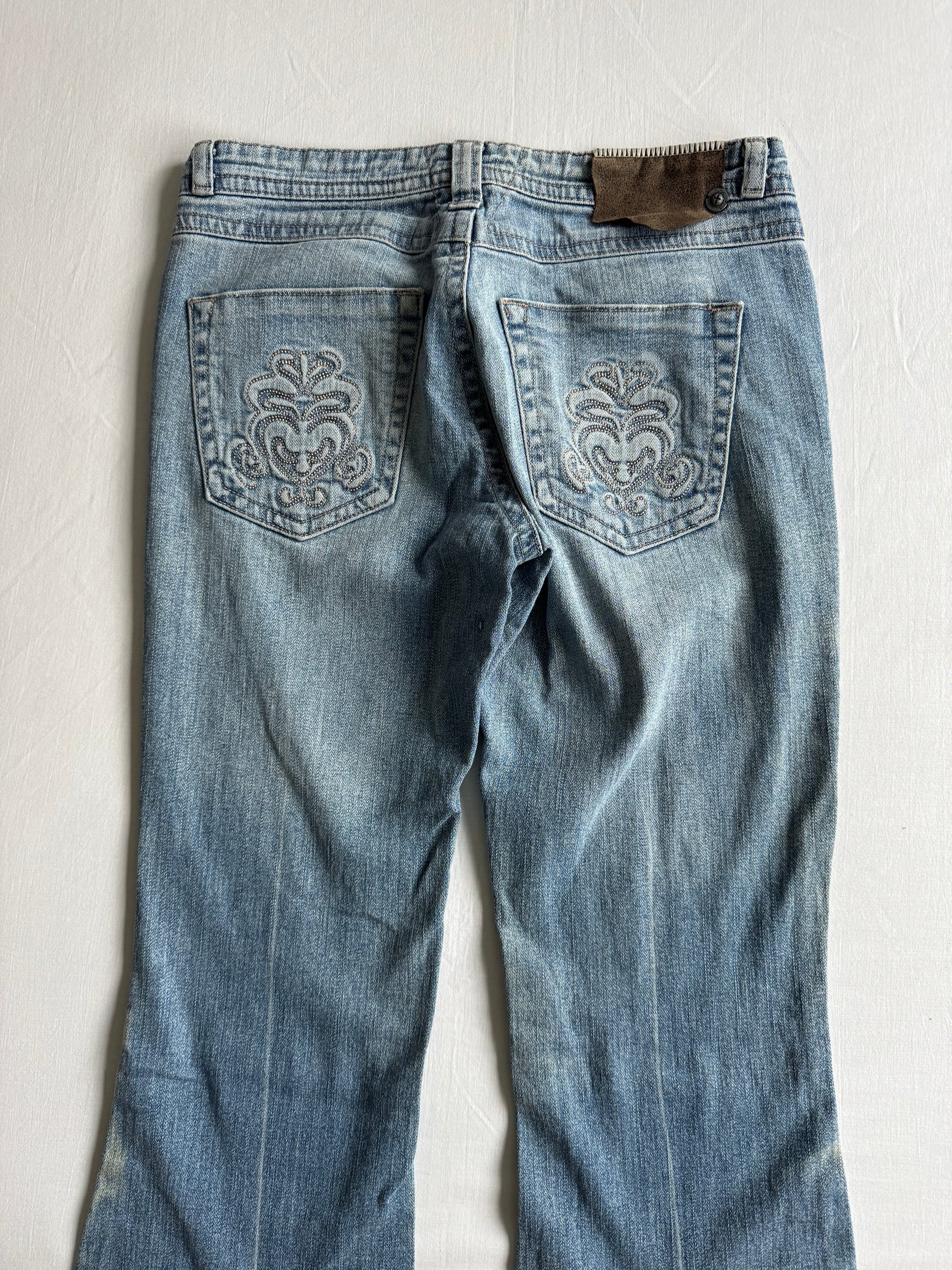 Blugi Y2K semnați Industrial Cotton, cu croială bootcut specifică începutului anilor 2000. Design curat, versatil, ușor de integrat în ținute casual sau Y2K-inspired. Stare bună, fără defecte majore.