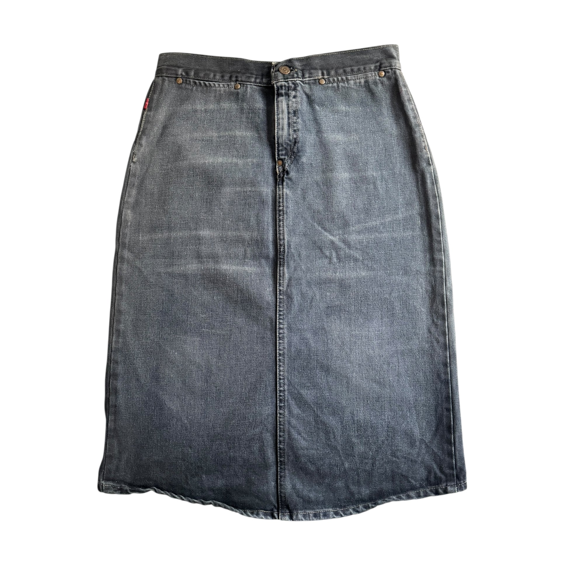 Fustă vintage Levi’s din 1994, confecționată din denim cerat (waxed cotton), cu buckle back reglabil în talie și croială tip pencil. O piesă unică, realizată în Malta, ce combină estetica utilitară cu silueta feminină. Materialul are o textură densă și lucioasă, tipică finisajelor cerate Levi’s din anii ’90.