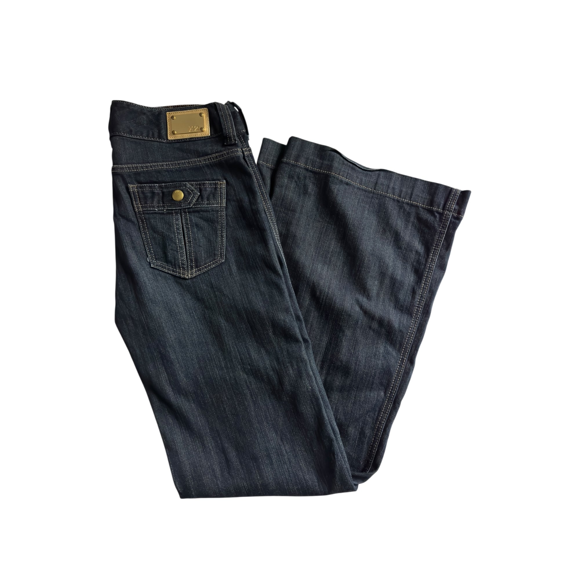 Jeans Y2K X2 din denim închis la culoare, cu croială evazată și talie medie. O piesă autentică din anii 2000, ideală pentru outfituri casual cu aer retro. Confecționați din denim de calitate, oferă o potrivire feminină și confortabilă.