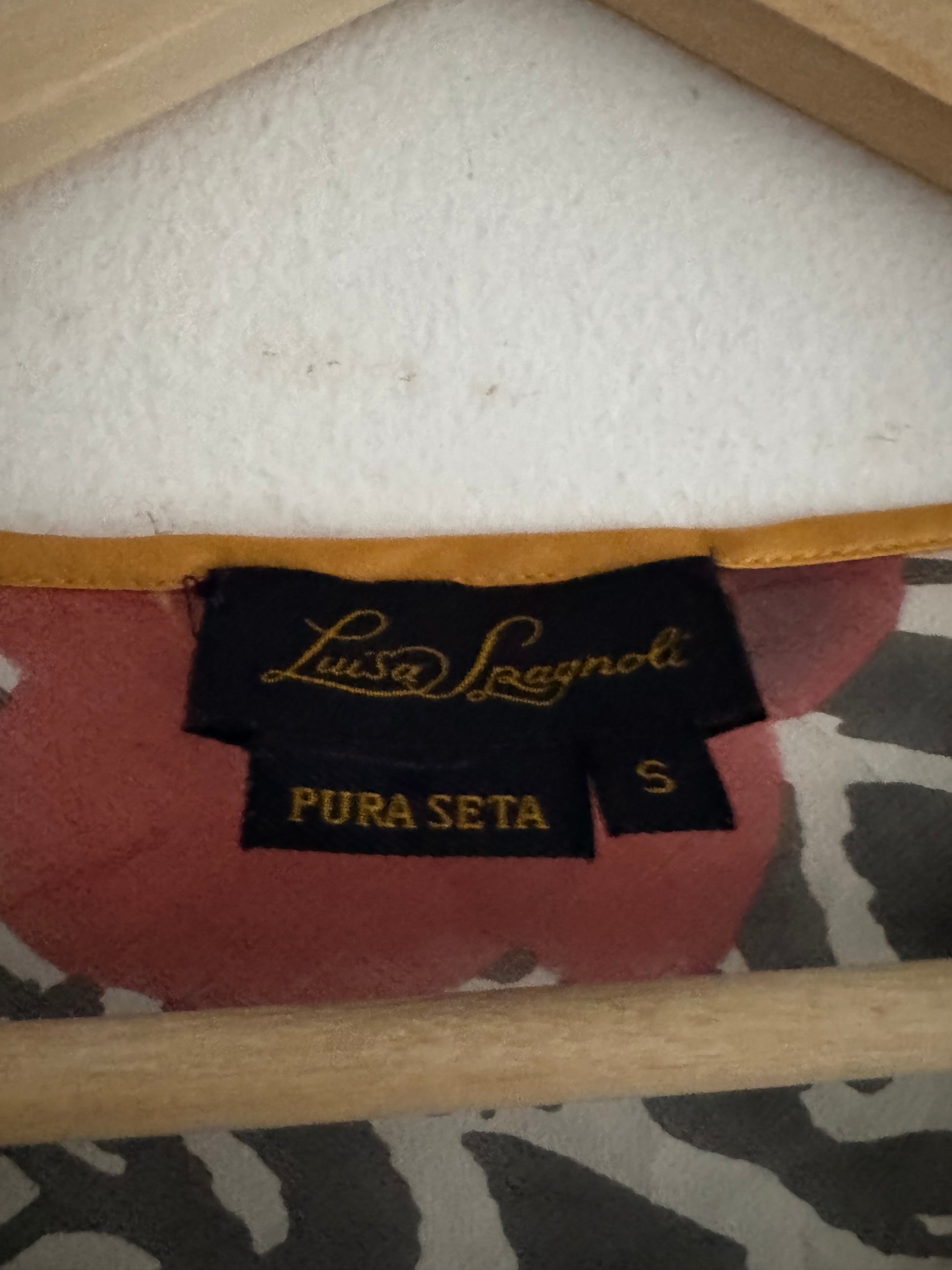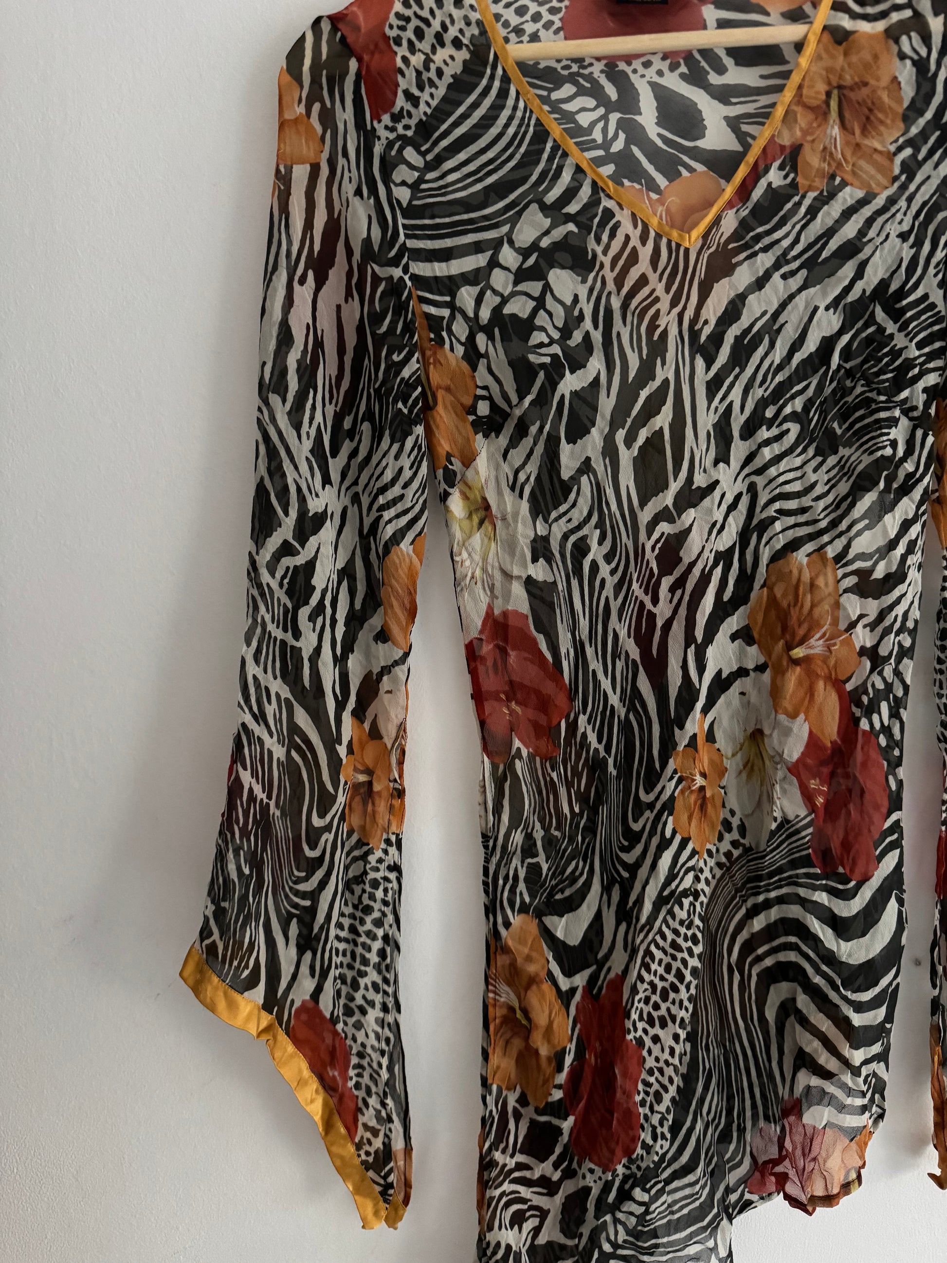 Top Y2K pentru femei, semnat Luisa Spagnoli, realizat din 100% mătase, cu imprimeu combinat animal și floral și croială lungă, cu ciucure la terminatie. Etichetat S damă, păstrat în stare foarte bună.