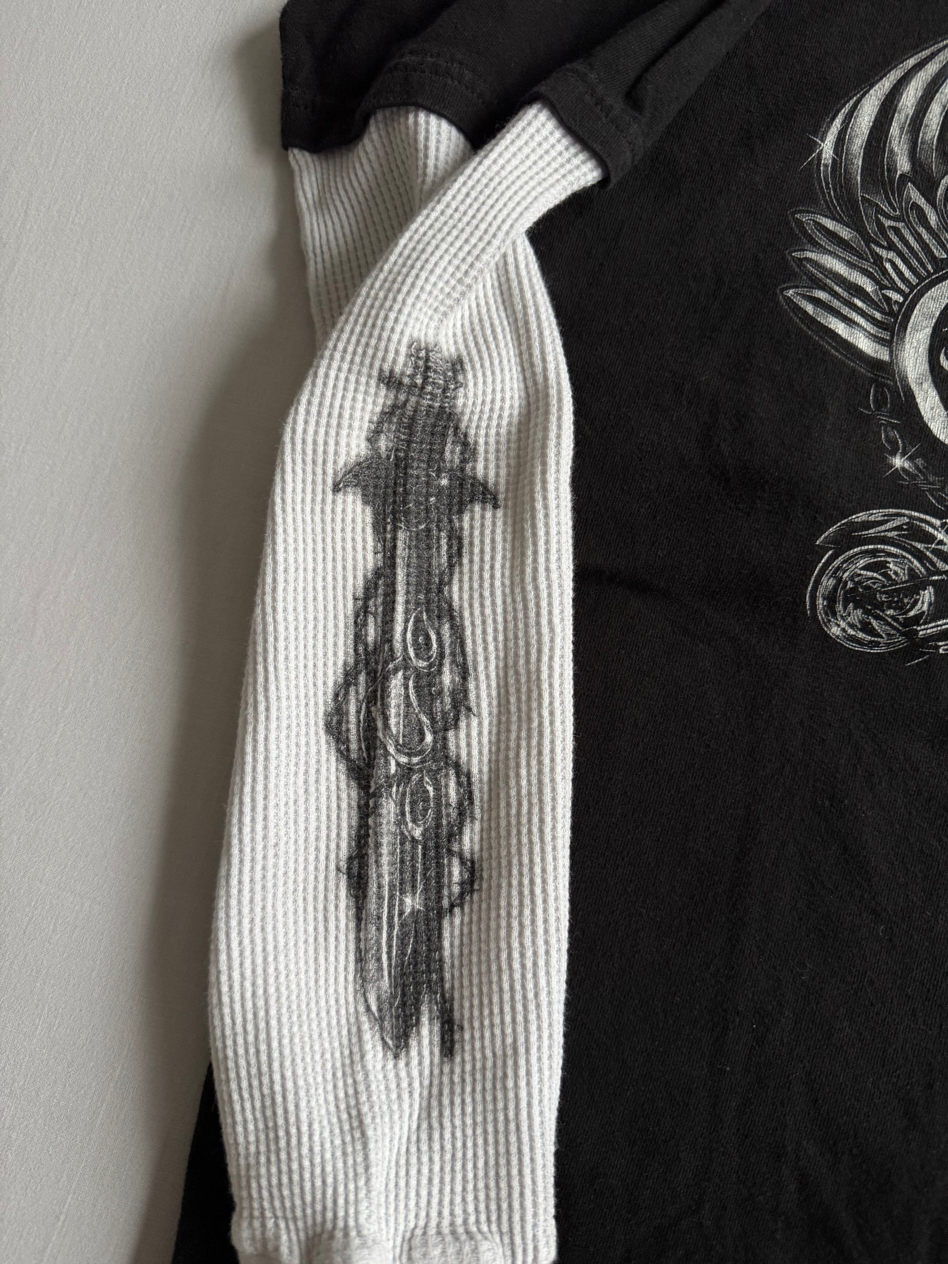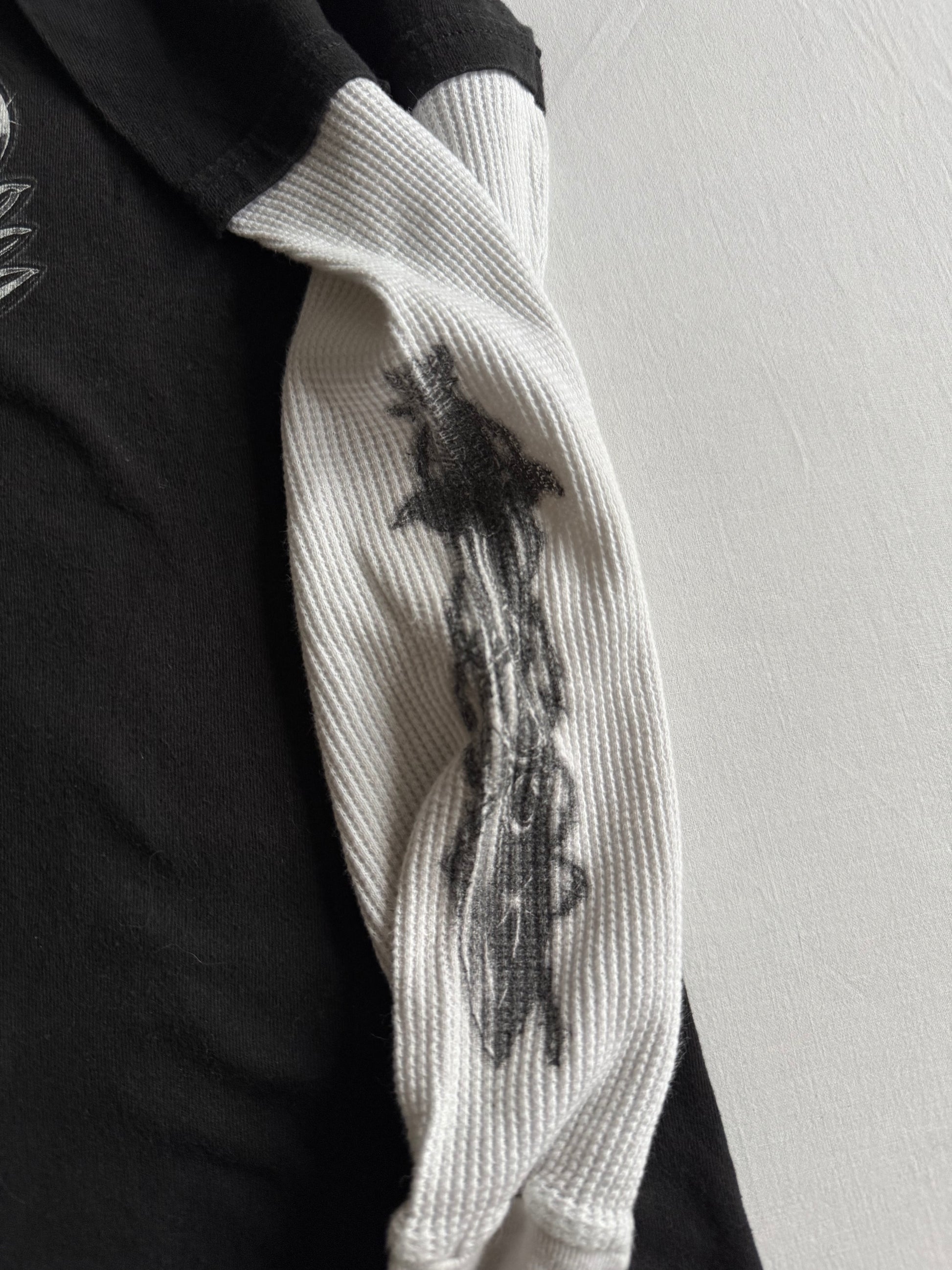 Bluză Y2K pentru bărbați, model layered style, cu corp negru și mâneci albe thermal waffle, oferind un look autentic streetwear 2000s. Croială potrivită pentru un M (etichetă M). Fabricată în Mexic și păstrată în stare foarte bună.