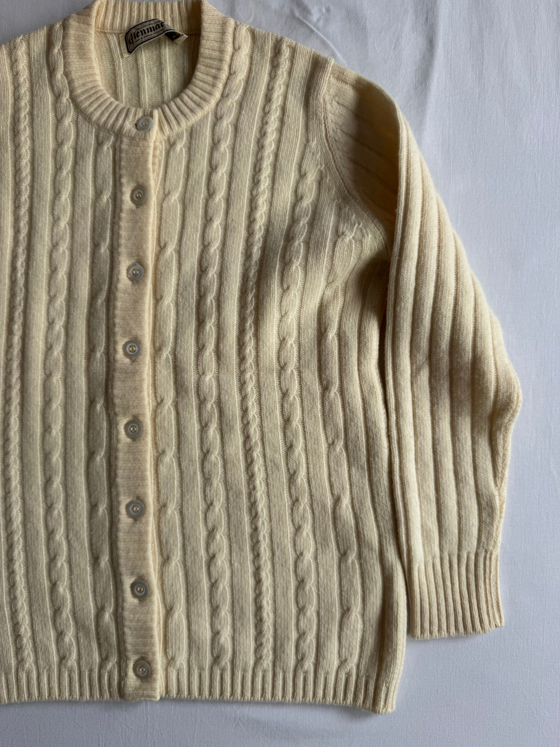 Cardigan vintage pentru femei, realizat din Geelong lambswool, o lână fină și moale, apreciată pentru confort și căldură. Nuanță alb natural, croială clasică și feminină, ușor de integrat în ținute casual sau layering. Fabricat în Scoția și păstrat în stare foarte bună. Nu are etichetă de mărime; conform măsurătorilor, se potrivește aproximativ unui S / M damă.