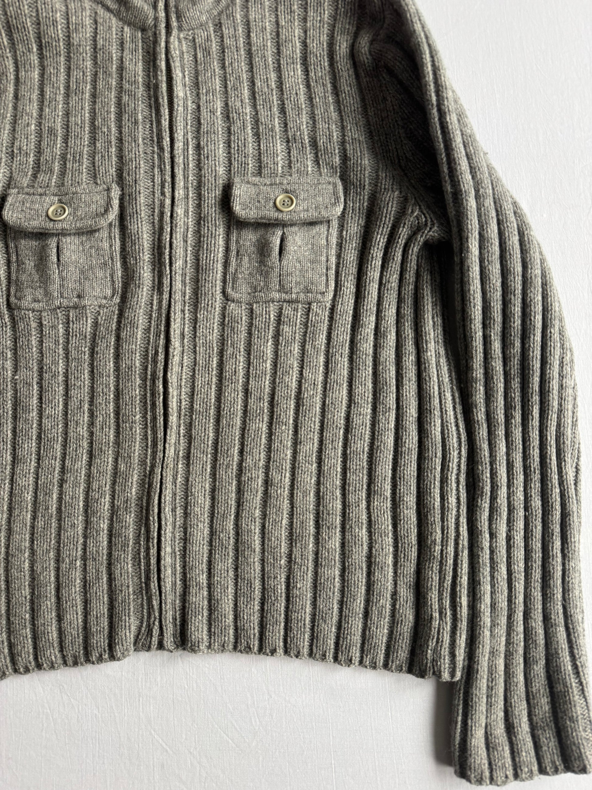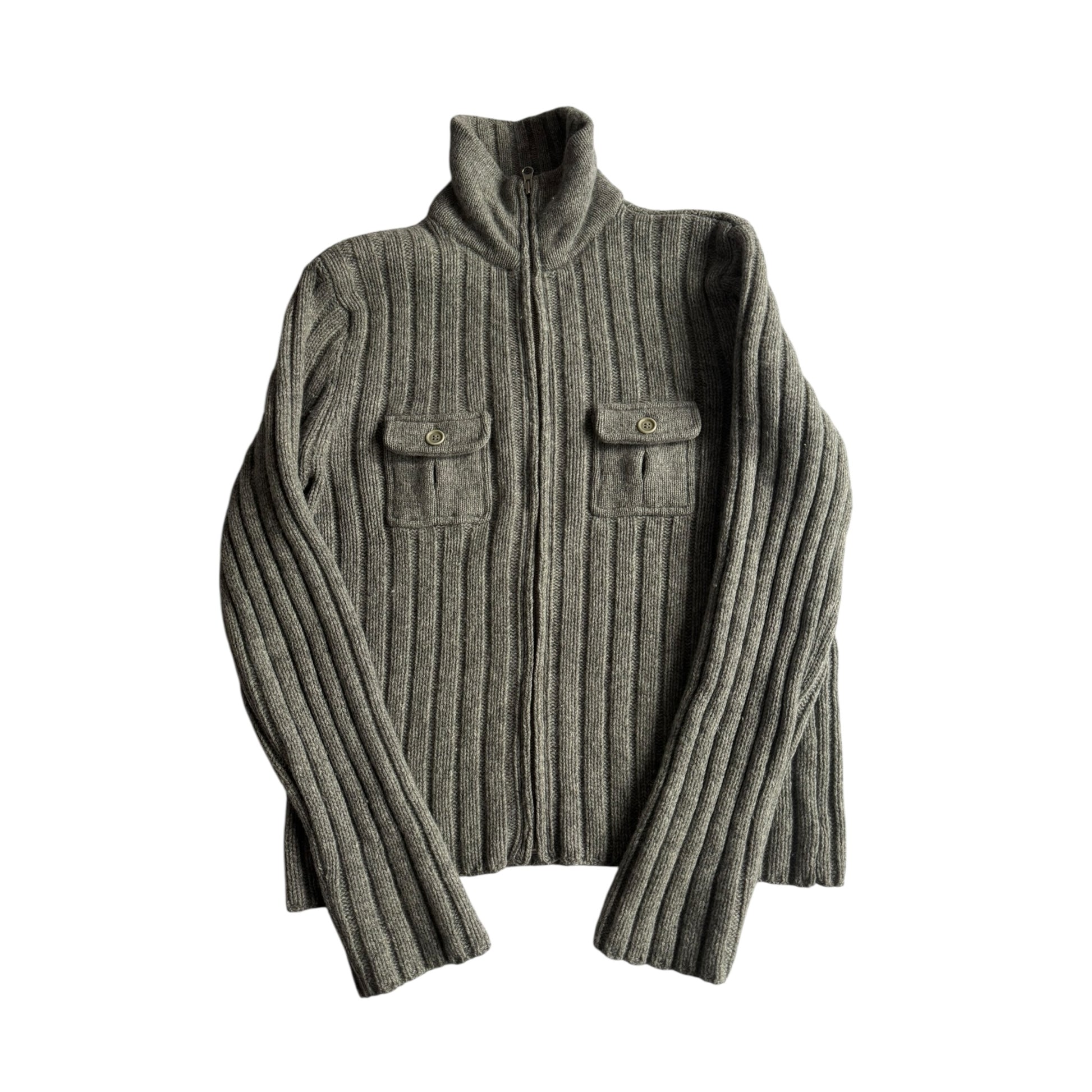 Cardigan Y2K pentru bărbați, realizat din 100% lambswool, în nuanță gri, cu design clasic și închidere cu fermoar, ideal pentru layering și ținute casual sau smart-casual. Etichetat L bărbați, piesă păstrată în stare foarte bună.