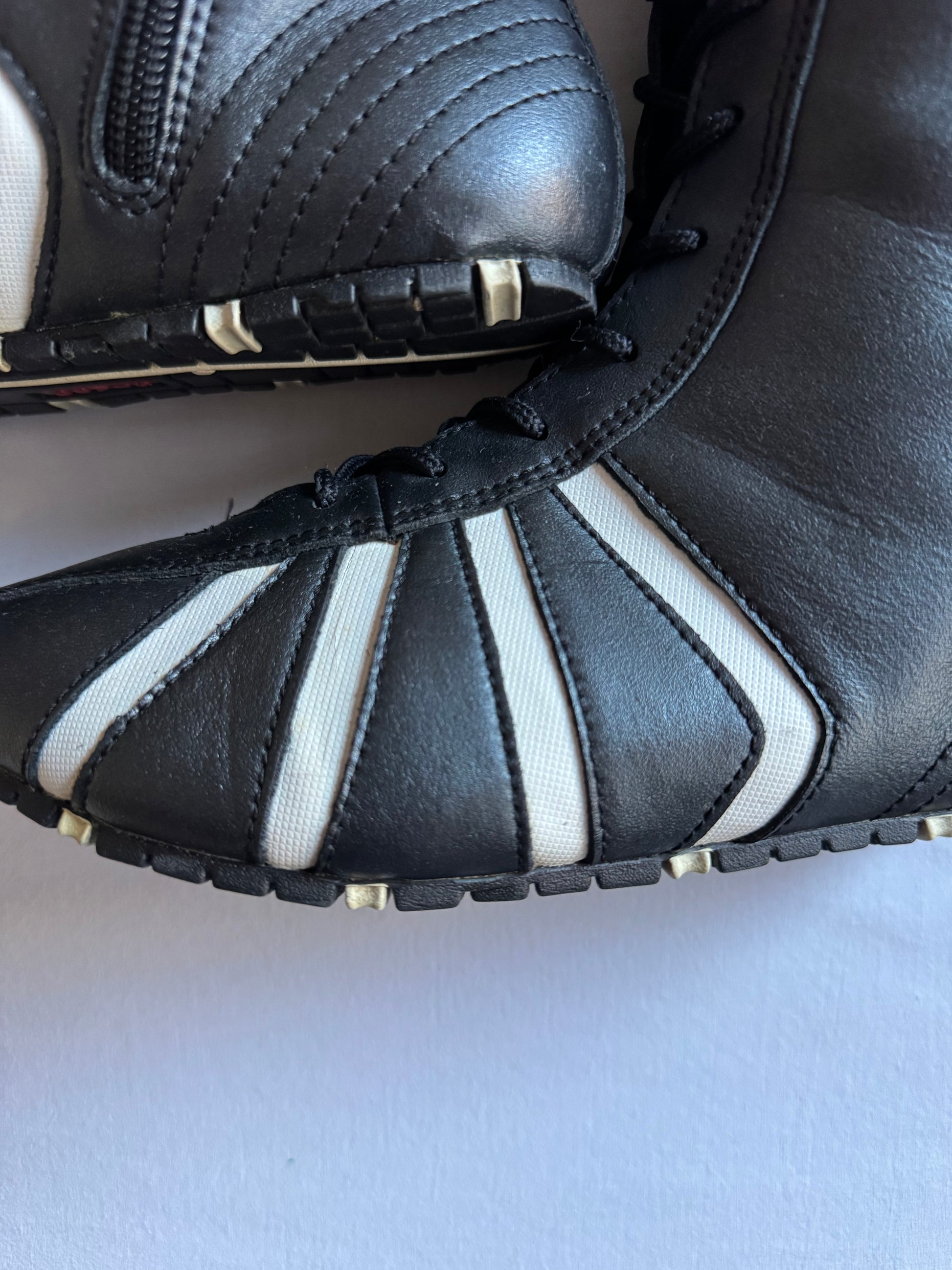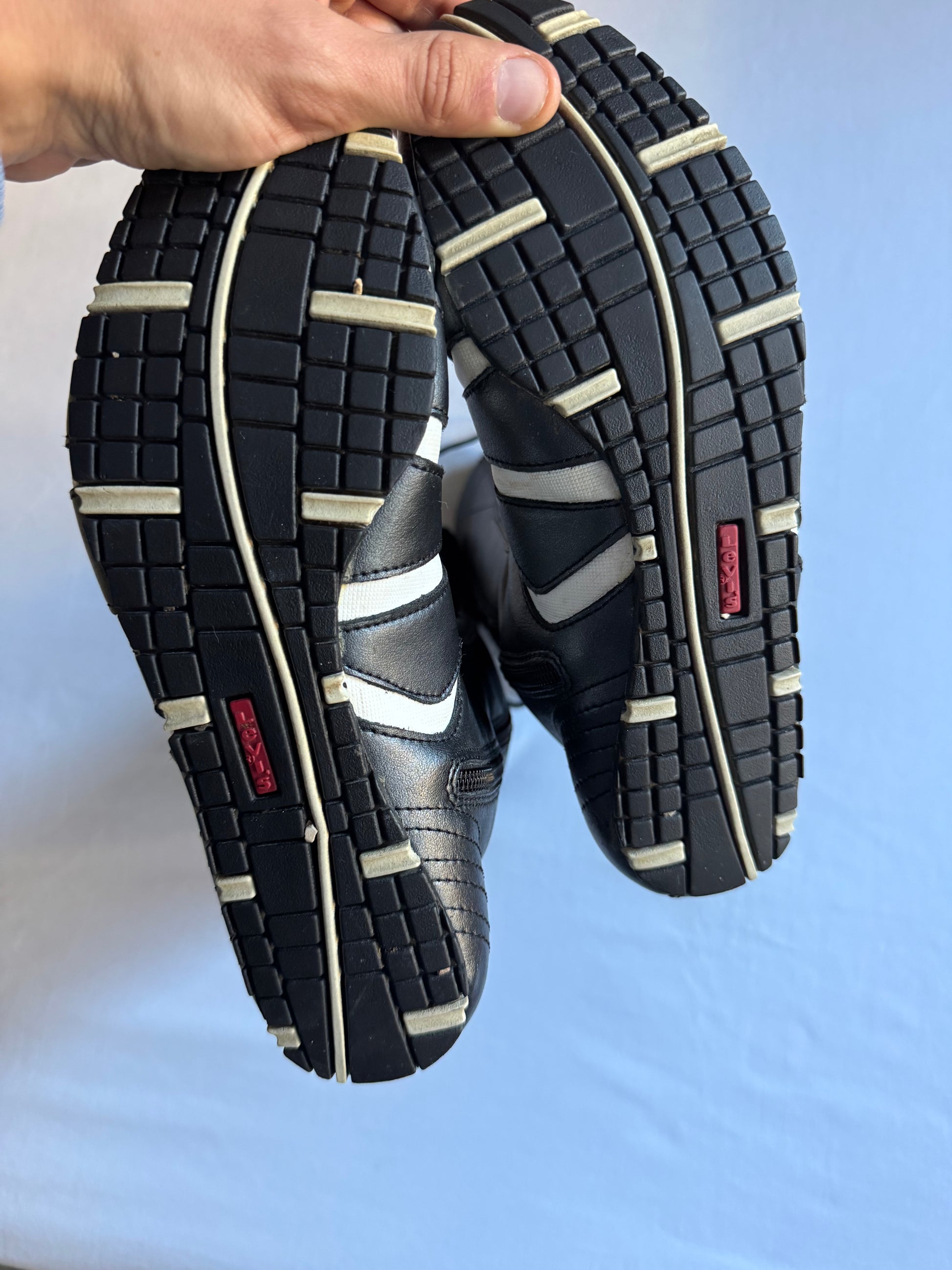 Cizme vintage Levi’s, model boxing, confecționate din piele neagră, cu design clasic și talpă robustă. Prezintă crăpături pe limbă (vizibile în fotografii), dar starea generală este bună. Ideal pentru colecționari sau outfituri statement.