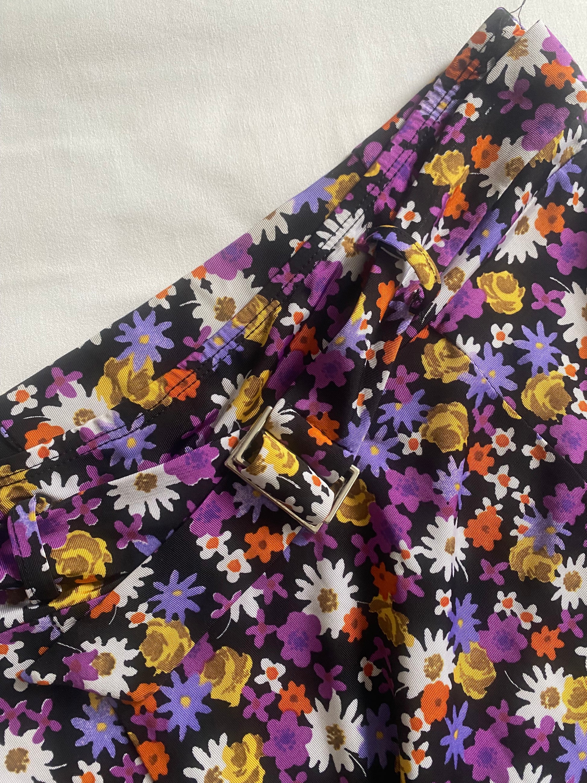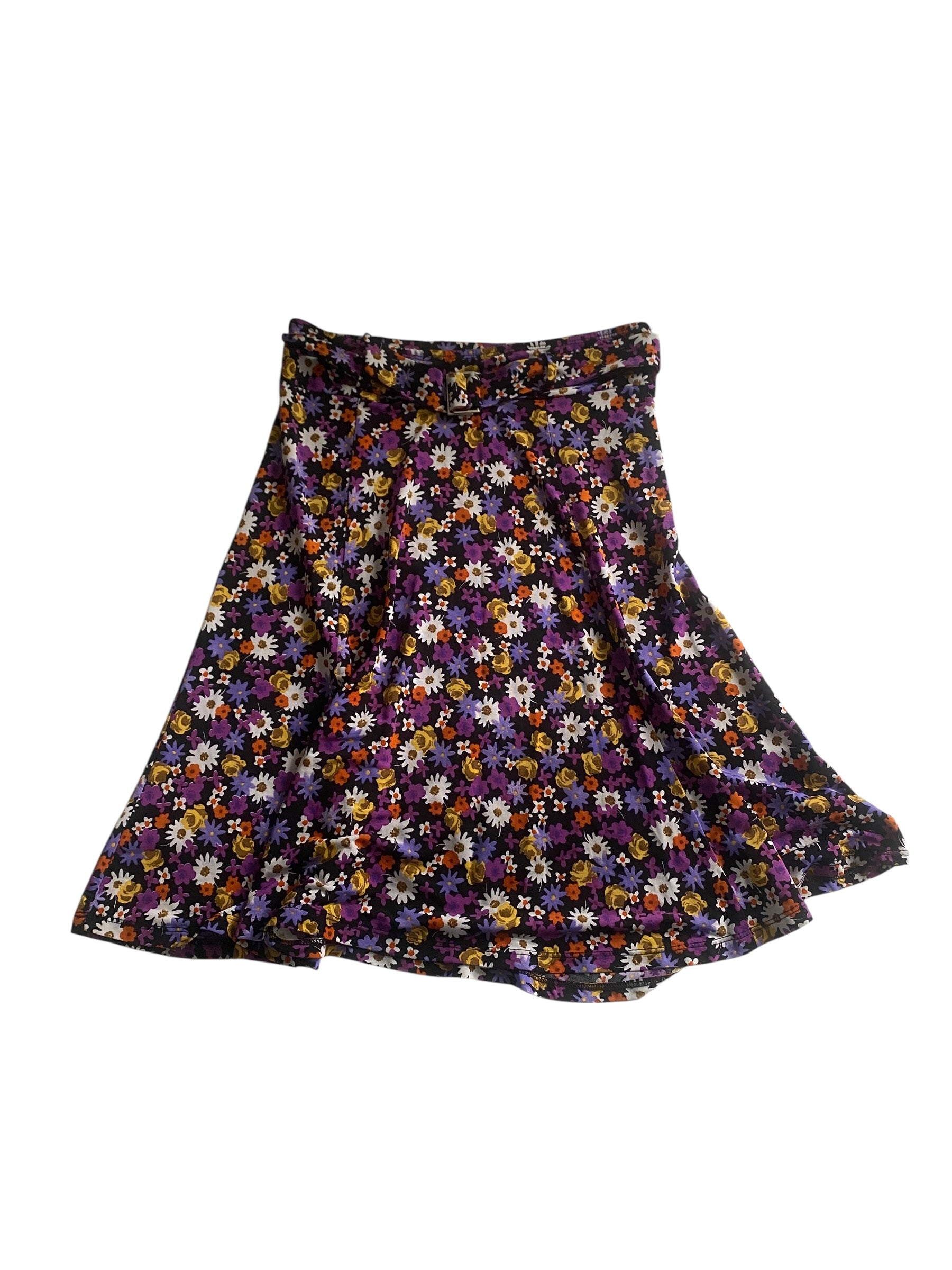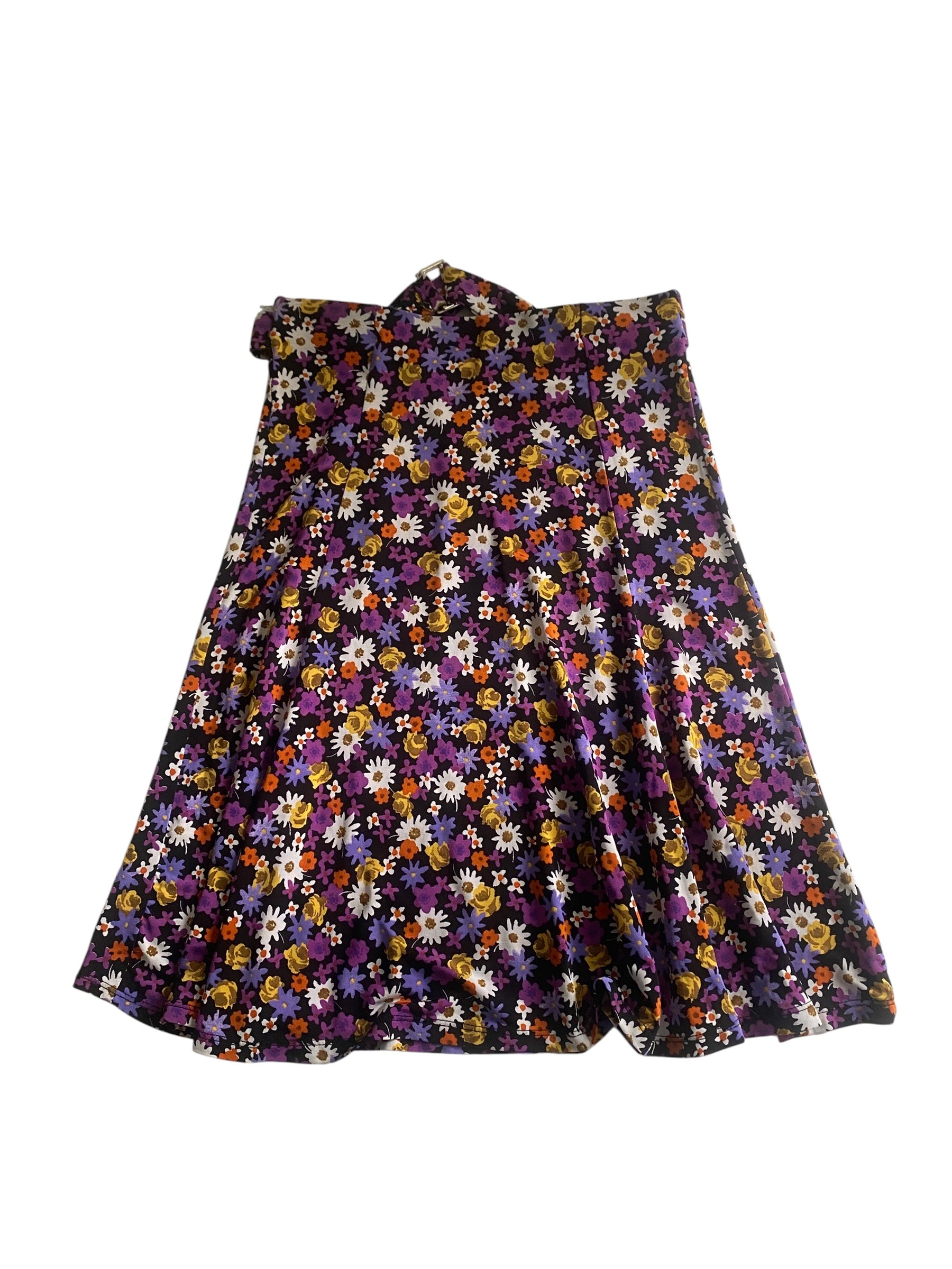 Fustă vintage cu imprimeu floral pe fundal negru, realizată din 100% vâscoză, material ușor și fluid. Talia este elastică și ajustabilă, oferind confort și versatilitate. Lungime midi, ideală pentru zilele de vară sau outfituri boeme.