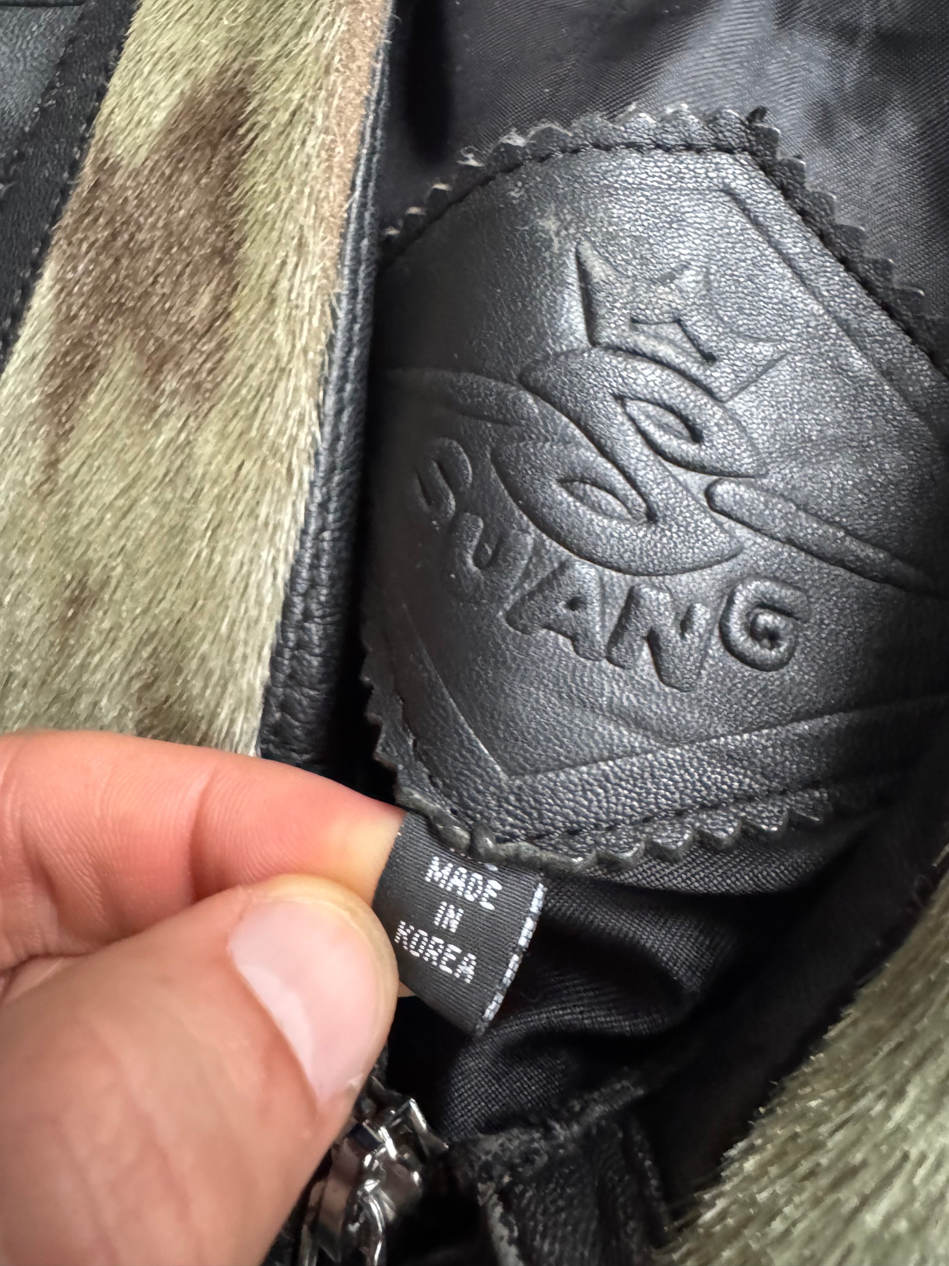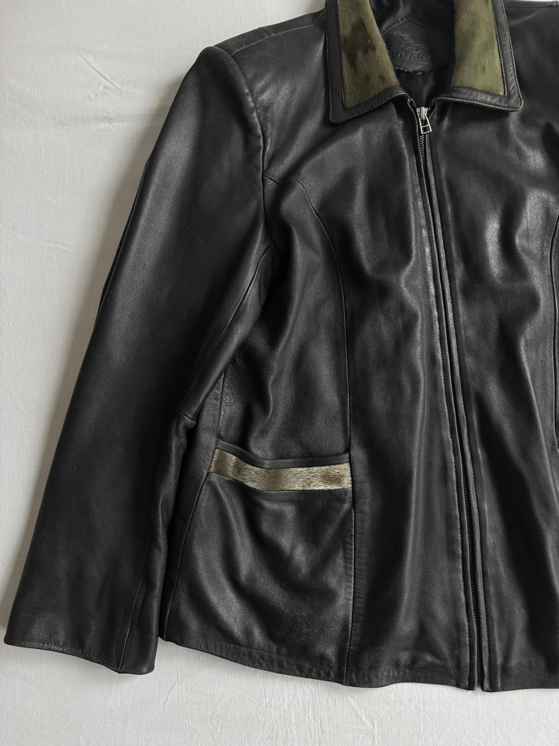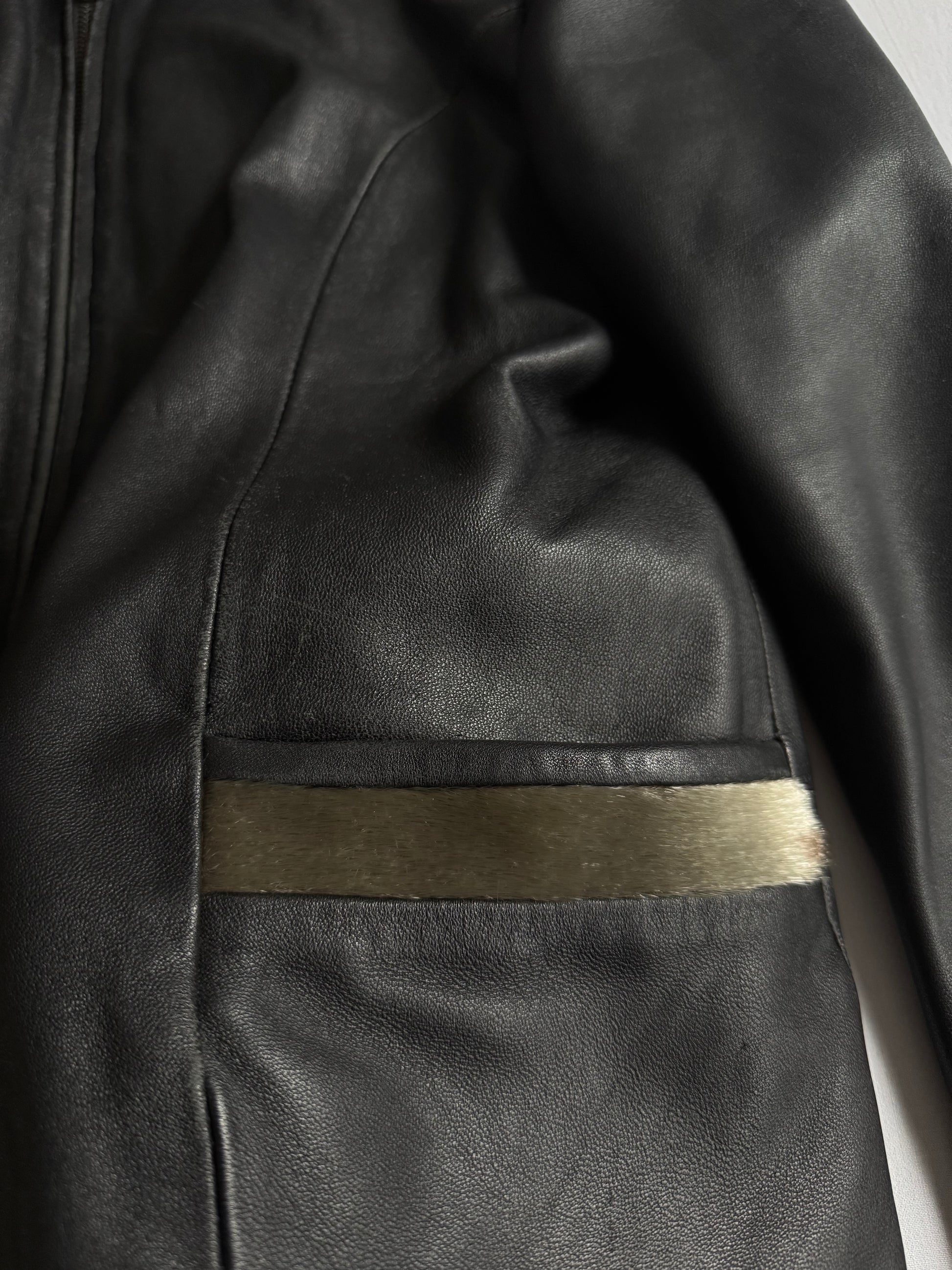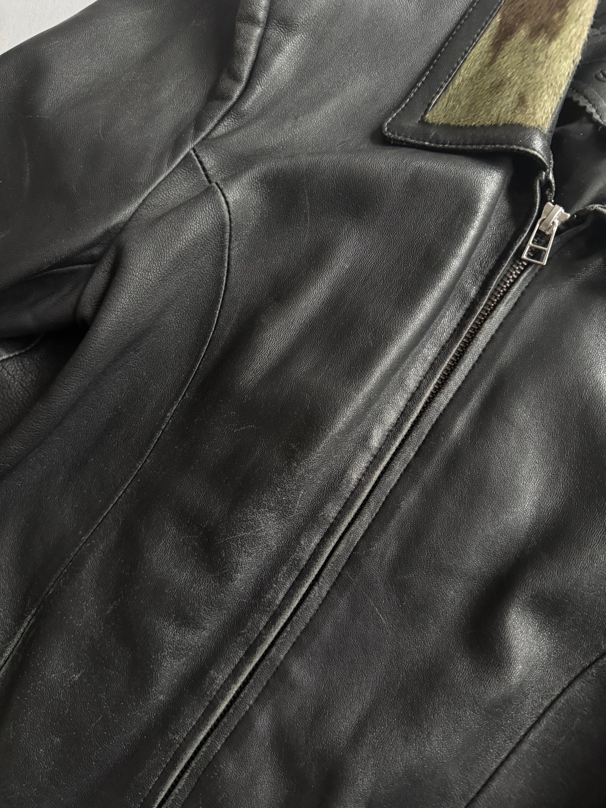 Geacă vintage pentru femei realizată din piele neagră, decorată cu aplicații din păr animal, detaliu statement care oferă un look texturat și distinct. Fabricată în Coreea, etichetată XXL damă. Piesă în stare bună per total – pielea prezintă urme de purtare (vizibile în poze), iar căptușeala are uzură minoră.
