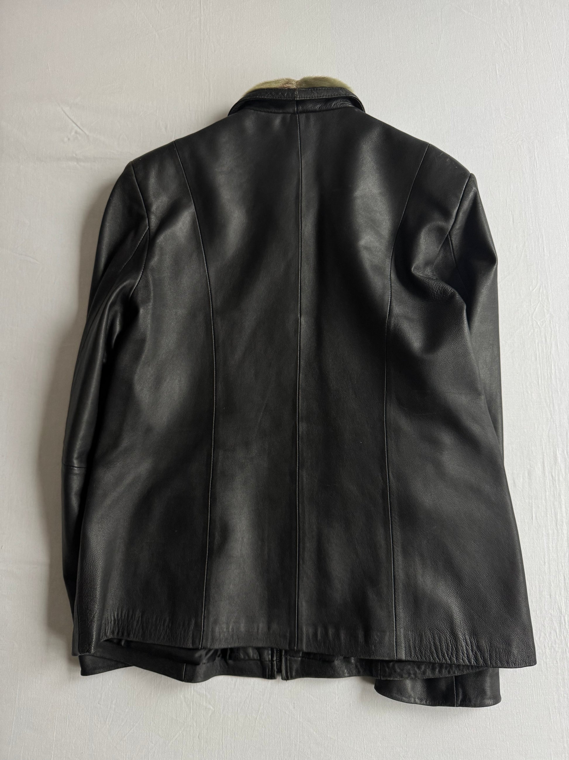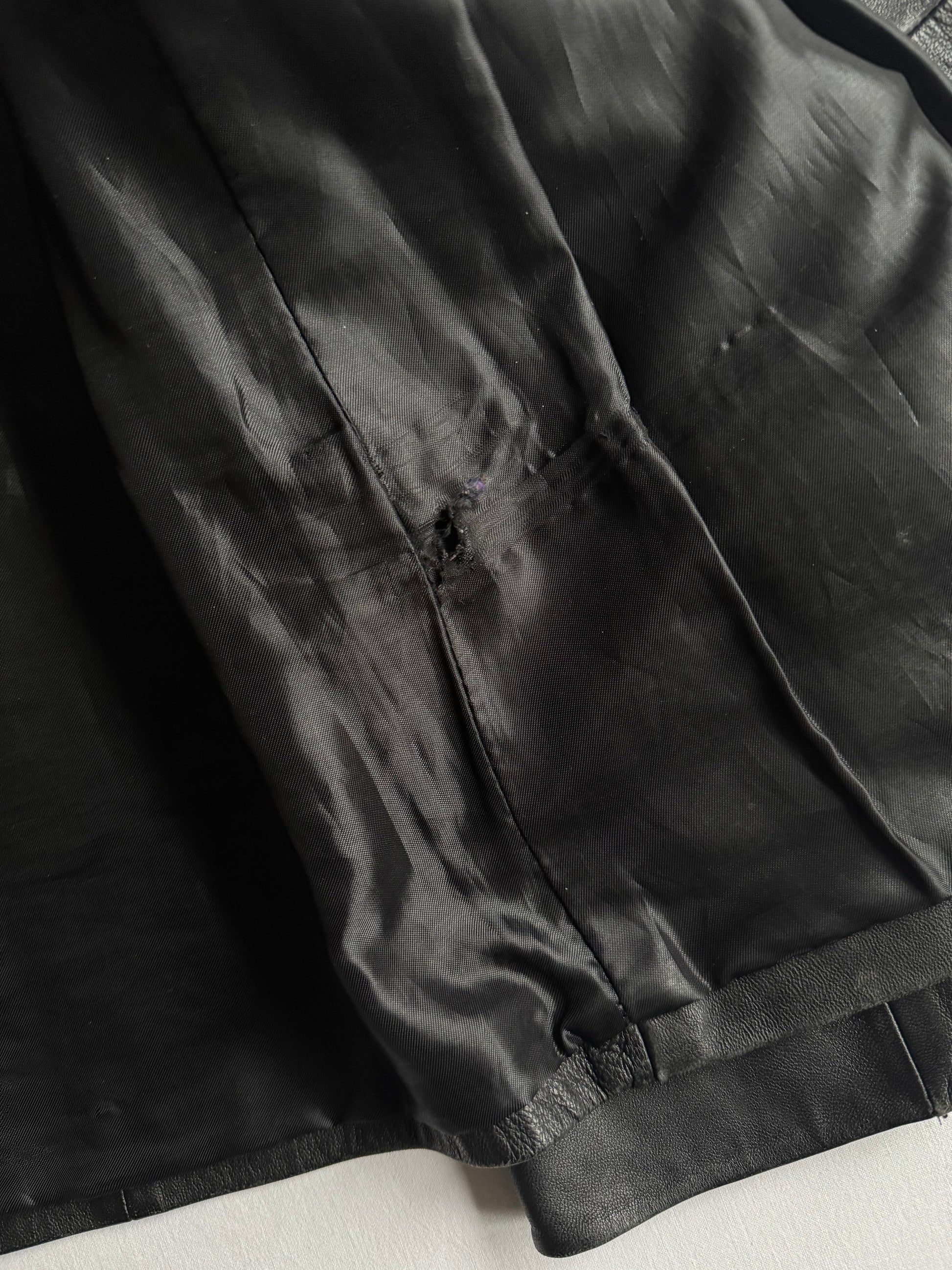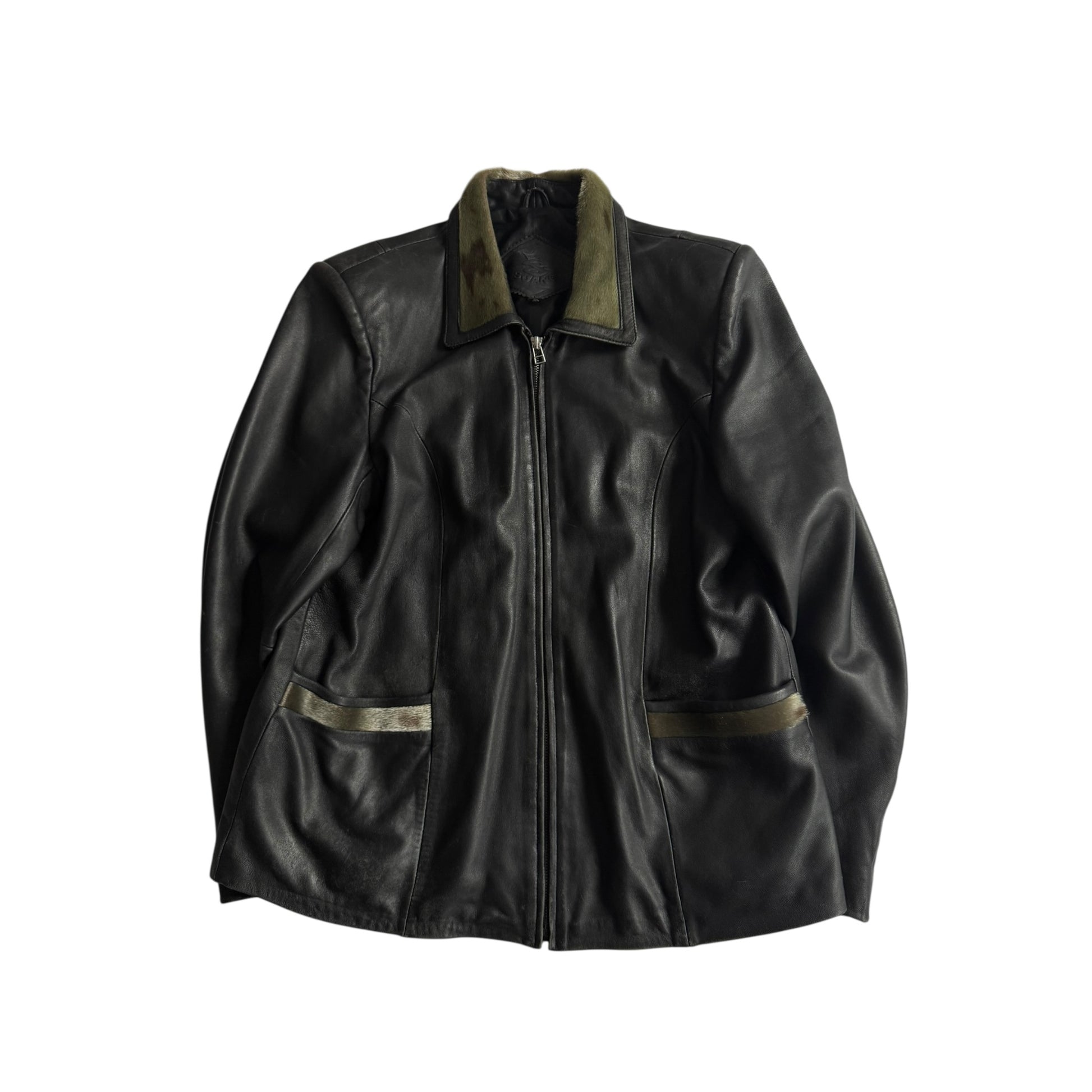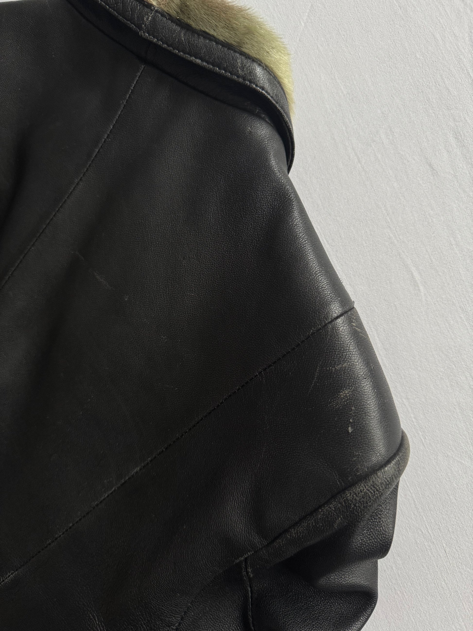 Geacă vintage pentru femei realizată din piele neagră, decorată cu aplicații din păr animal, detaliu statement care oferă un look texturat și distinct. Fabricată în Coreea, etichetată XXL damă. Piesă în stare bună per total – pielea prezintă urme de purtare (vizibile în poze), iar căptușeala are uzură minoră.