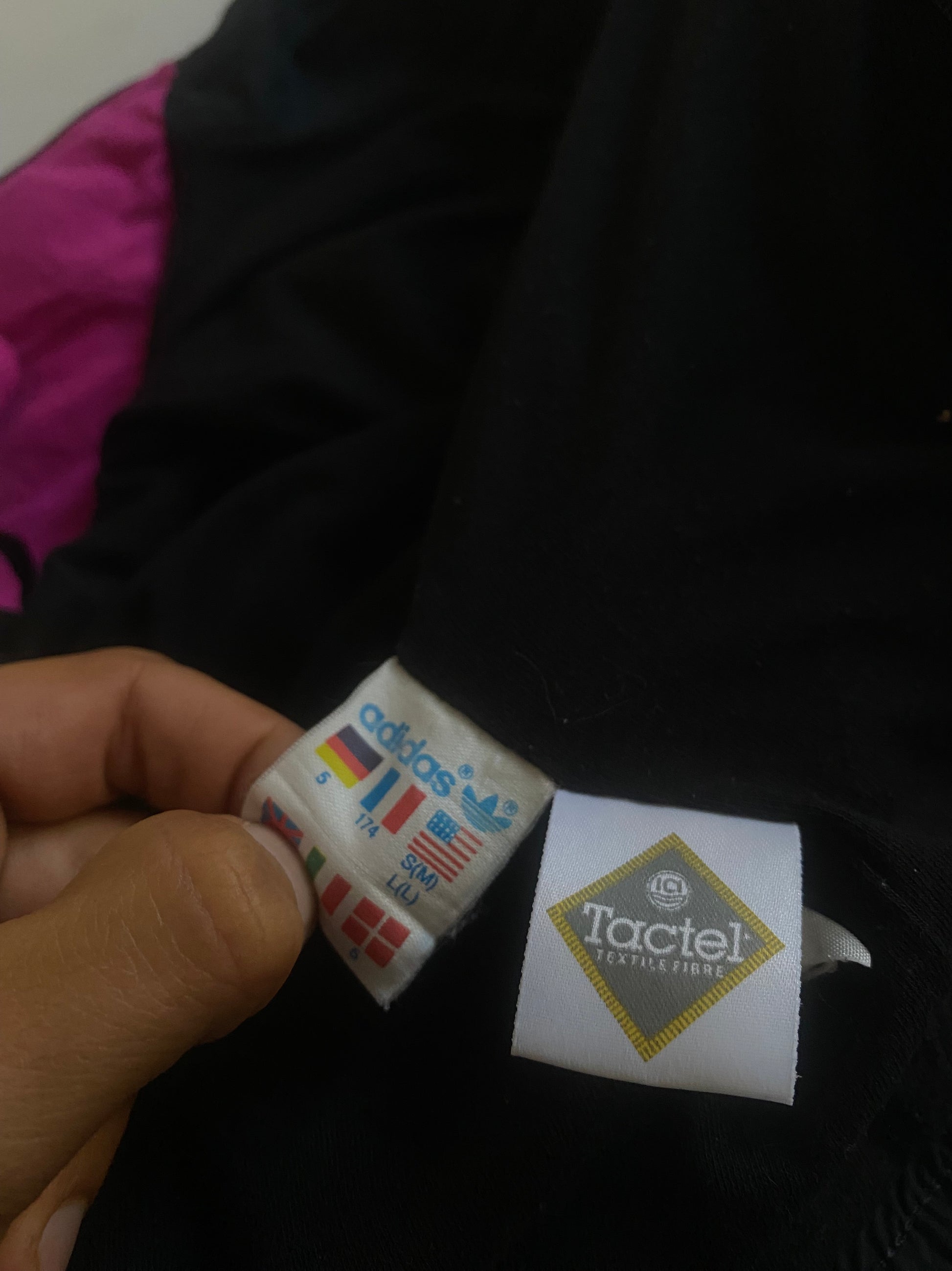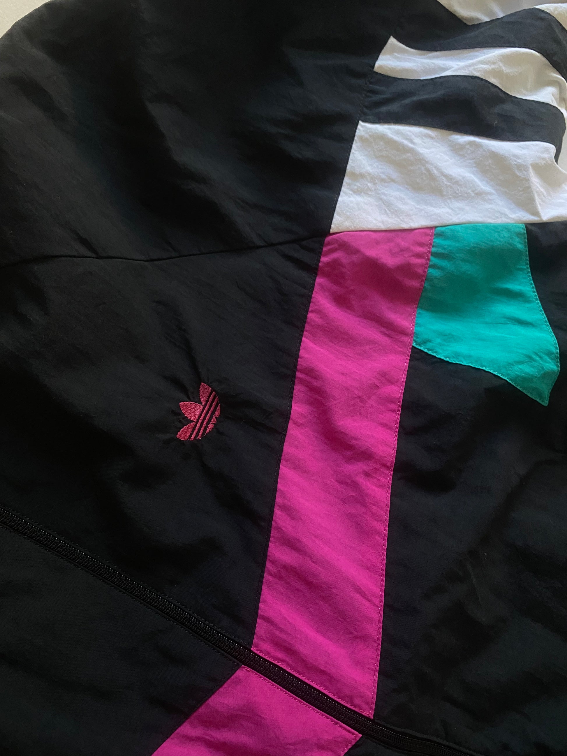 Geacă Adidas vintage din anii ’80, model windbreaker, în combinație de culori negru, alb și roz. Croiala boxy și detaliile grafice tipice perioadei oferă un look sport-retro autentic. O piesă iconică pentru colecționari și outfituri cu vibe oldschool.