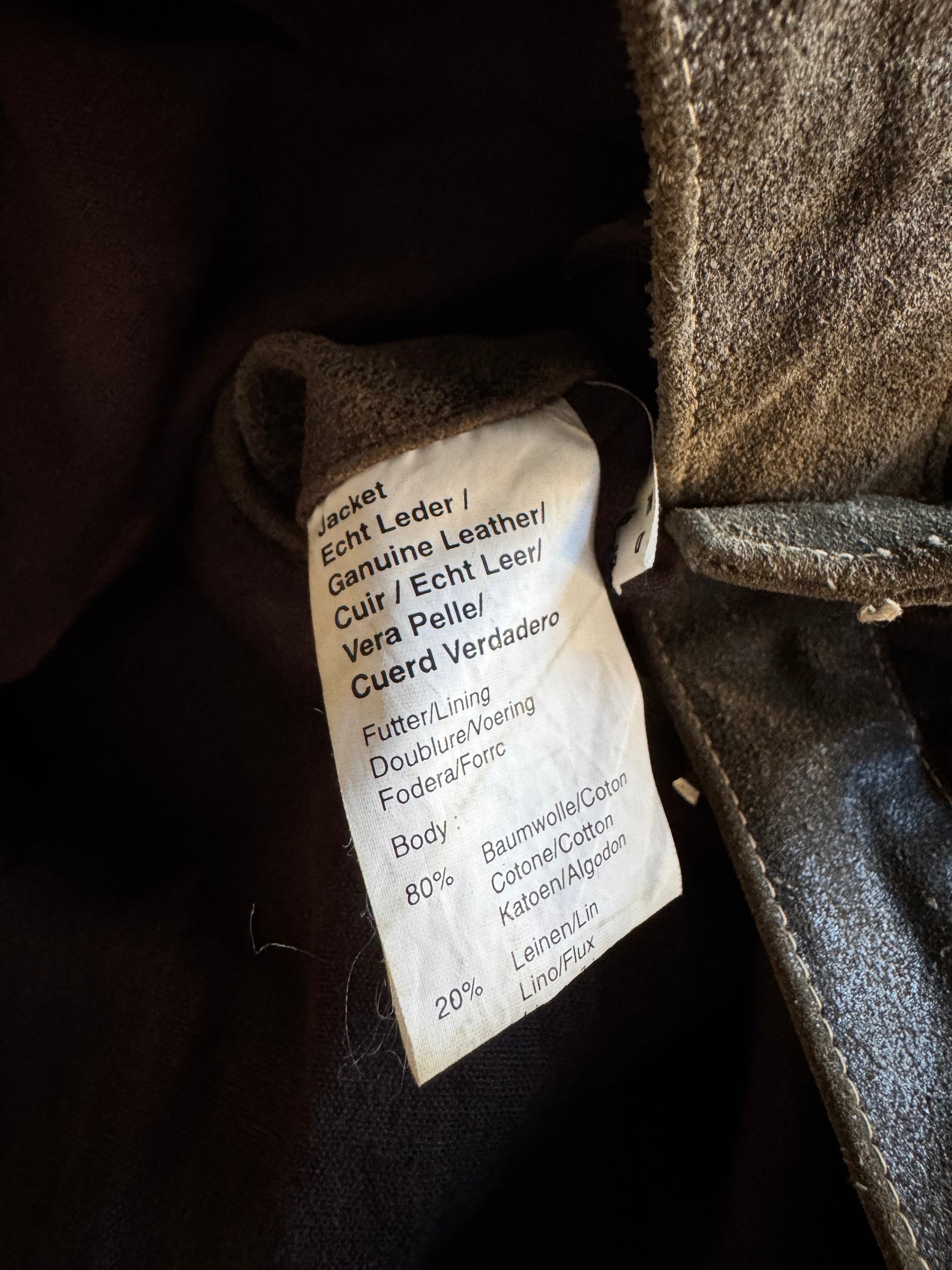 Jachetă vintage din piele întoarsă, cu un look autentic și o patină superbă, dobândită natural în timp. Modelul are croială tip trucker, cu o căptușeală din bumbac și in, ideală pentru confort și respirabilitate. Piesa prezintă ușoare urme de purtare sub brațul drept, însă starea generală este foarte bună — un item cu personalitate și caracter.