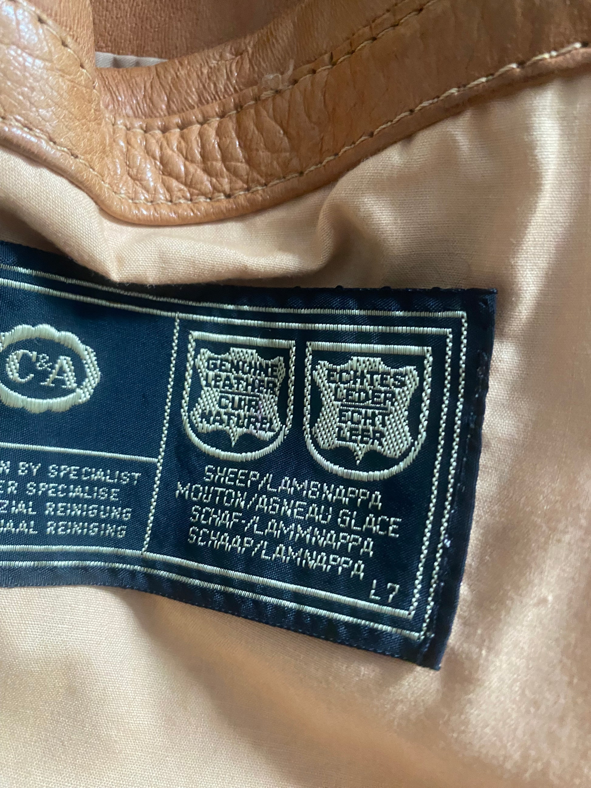 Jachetă vintage din piele naturală de oaie și miel, într-o nuanță clasică de maro. Prezintă un aspect autentic, cu patină și urme de purtare specifice vârstei, ceea ce îi conferă un caracter unic. Toate micile defecte sunt vizibile în fotografii. Croiala se potrivește aproximativ cu un L de bărbați.