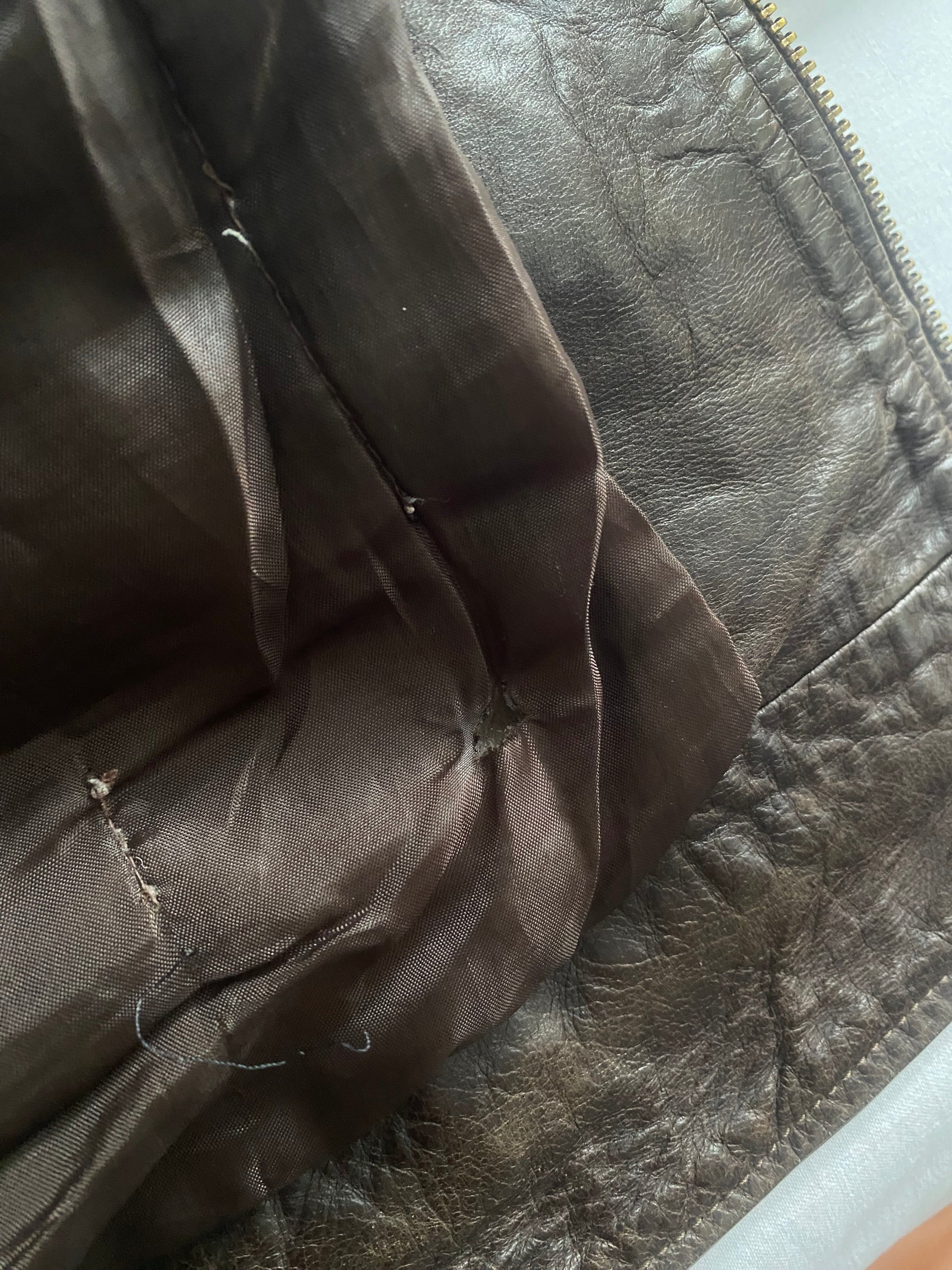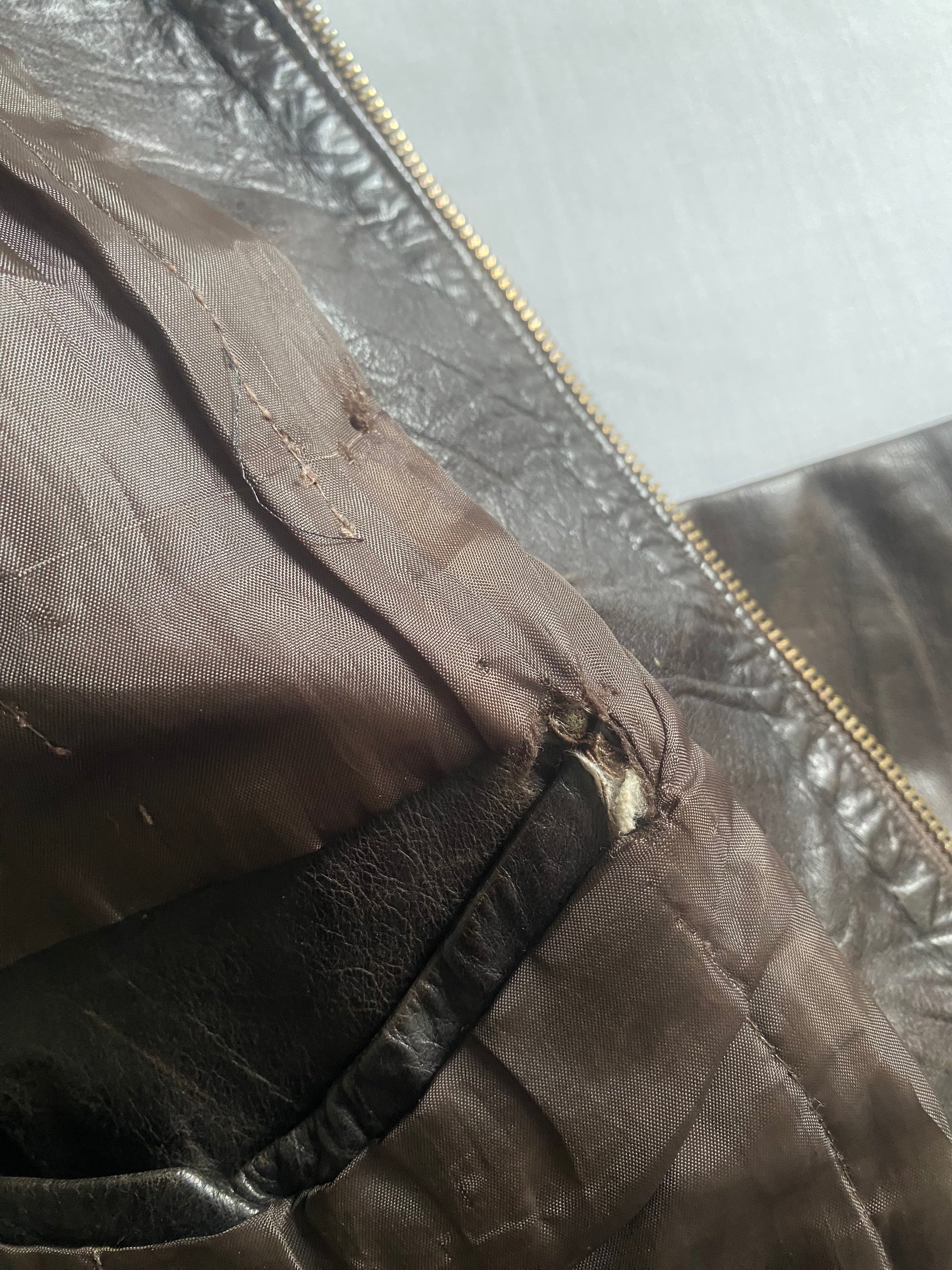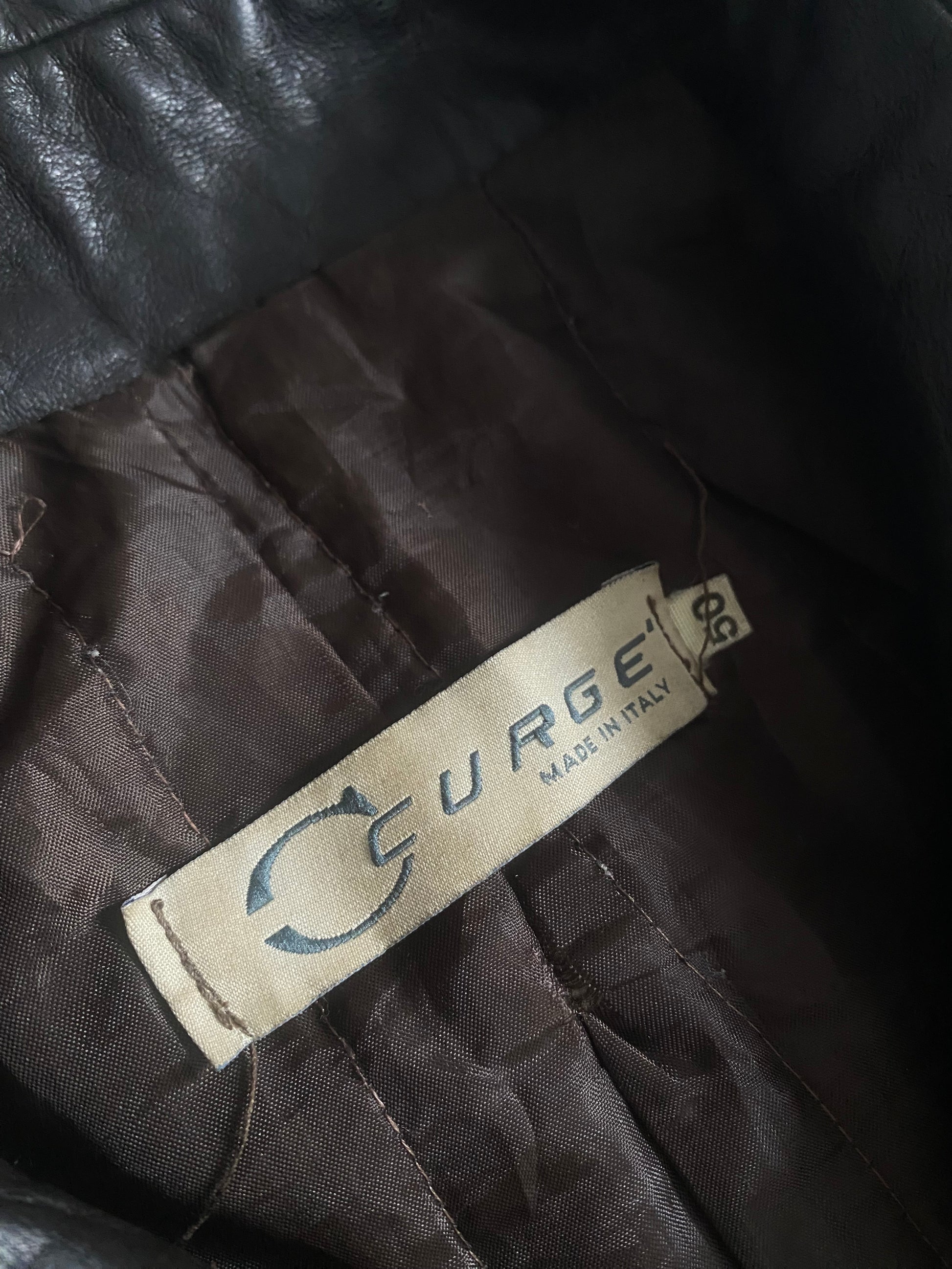 Jachetă vintage din piele naturală, de culoare maro închis, fabricată în Italia. Croiala clasică și pielea de calitate îi conferă un look elegant și versatil, potrivit atât pentru outfituri casual, cât și pentru stiluri retro smart. Prezintă doar o mică deteriorare la căptușeala interioară (vizibilă în poze), însă per total se află în stare foarte bună.