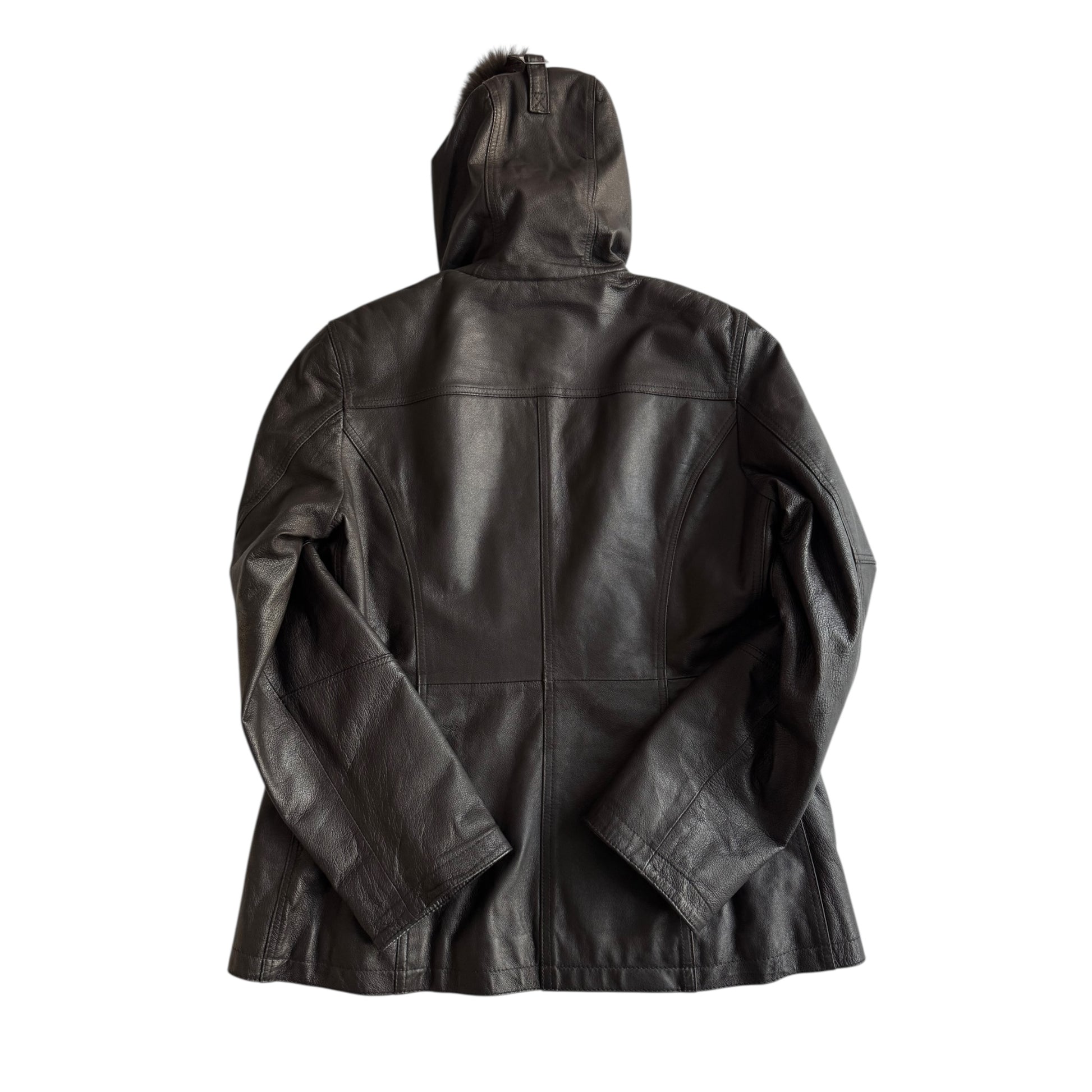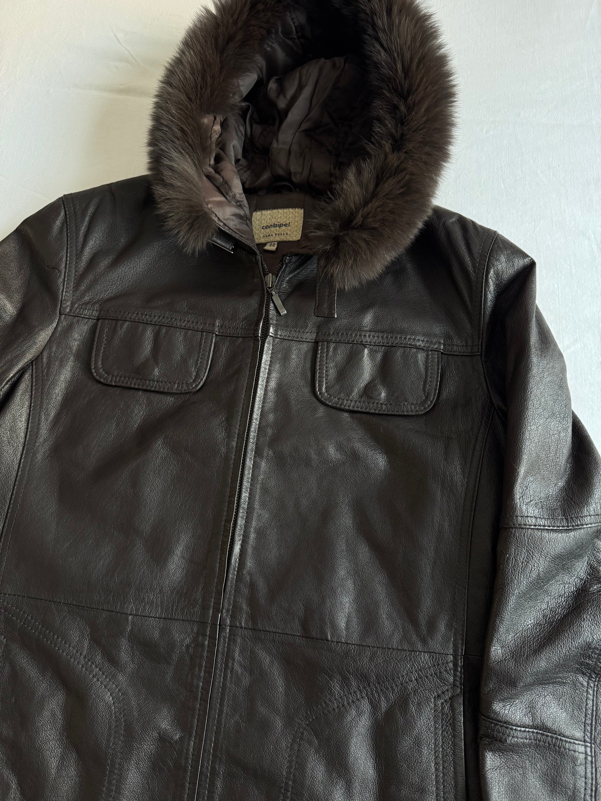 🦊 Jachetă Y2K din Piele Maro Închis cu Glugă Bordată cu Blană de Vulpe – IT 44 (M/L Damă)