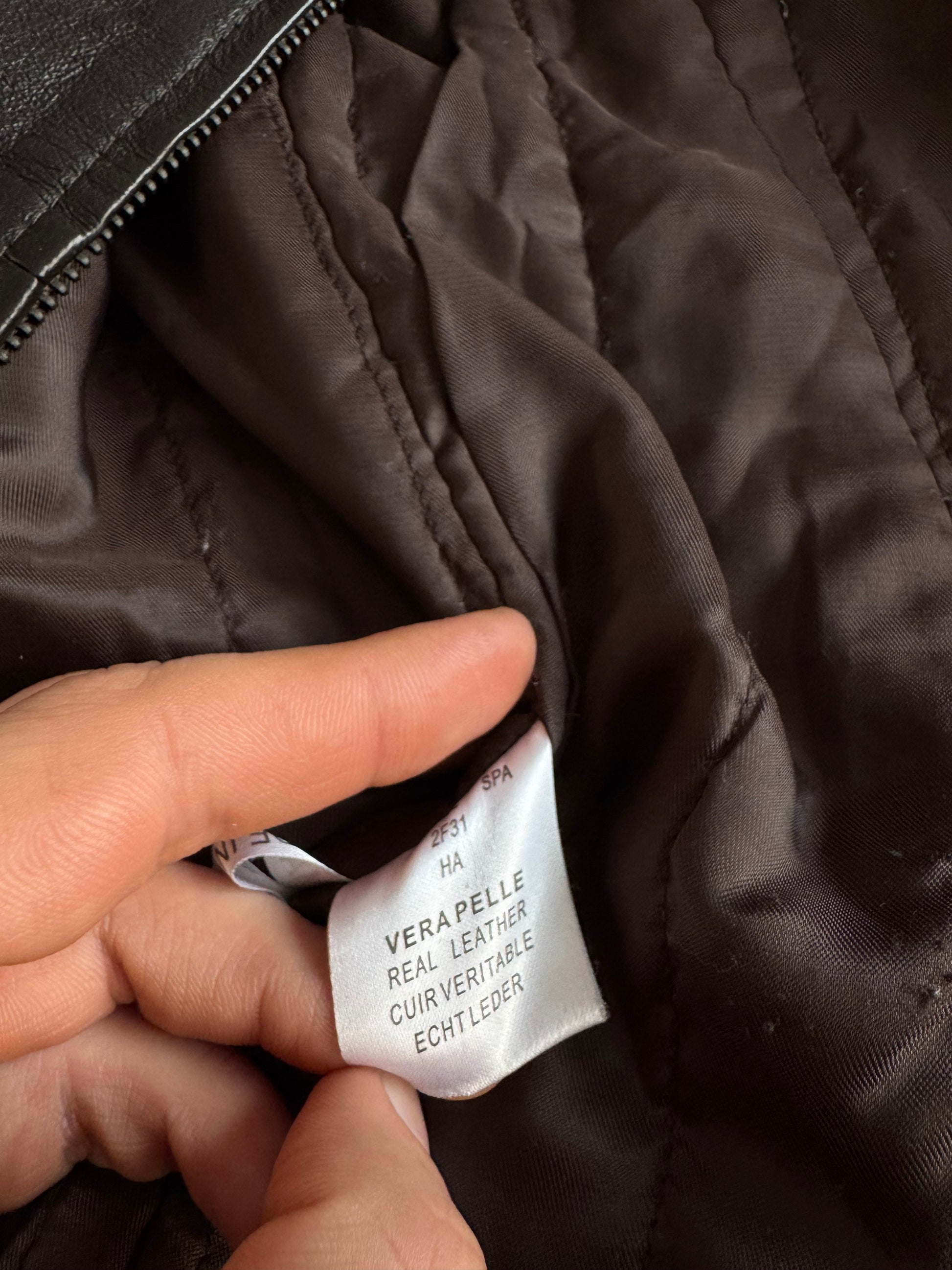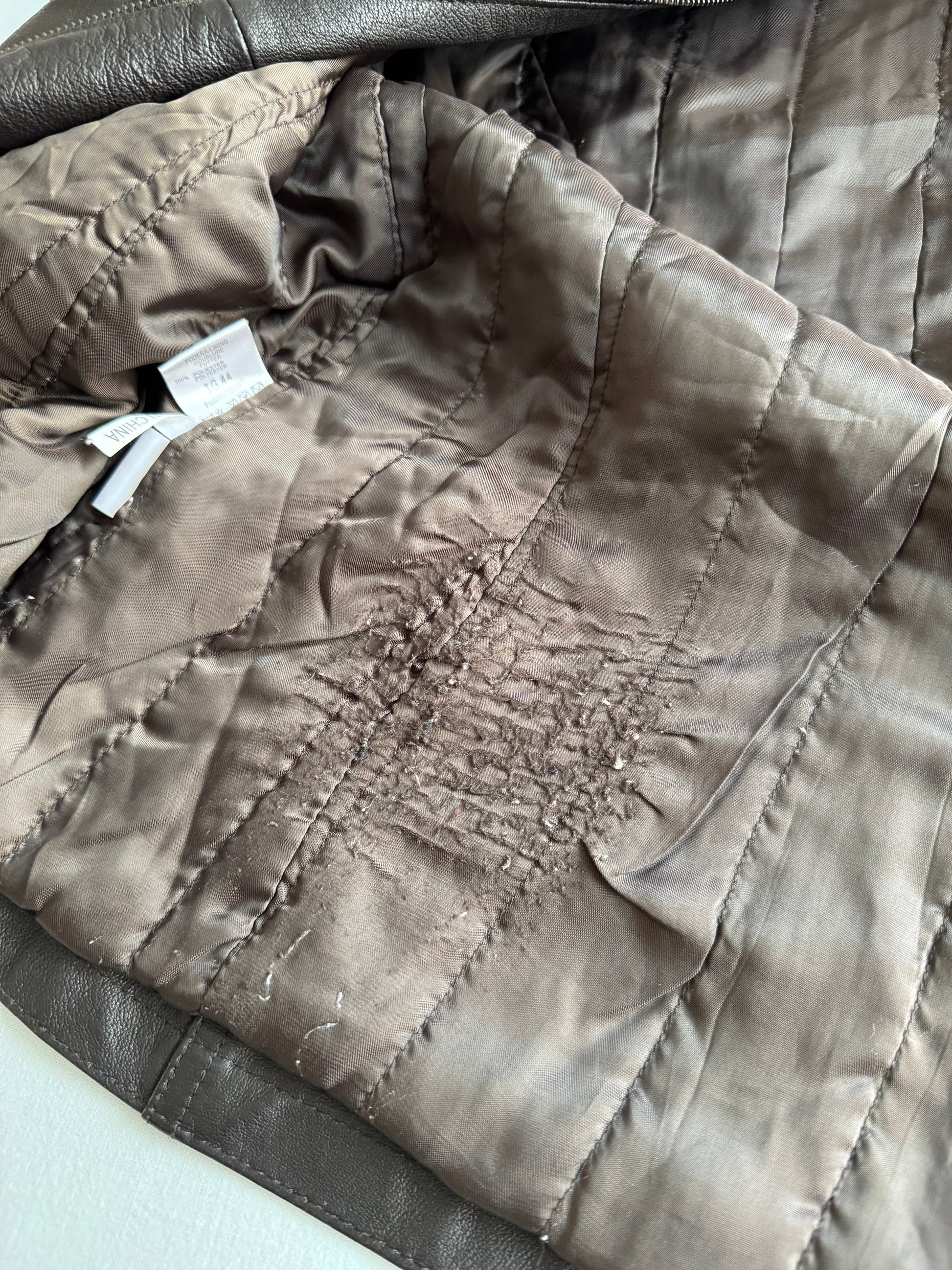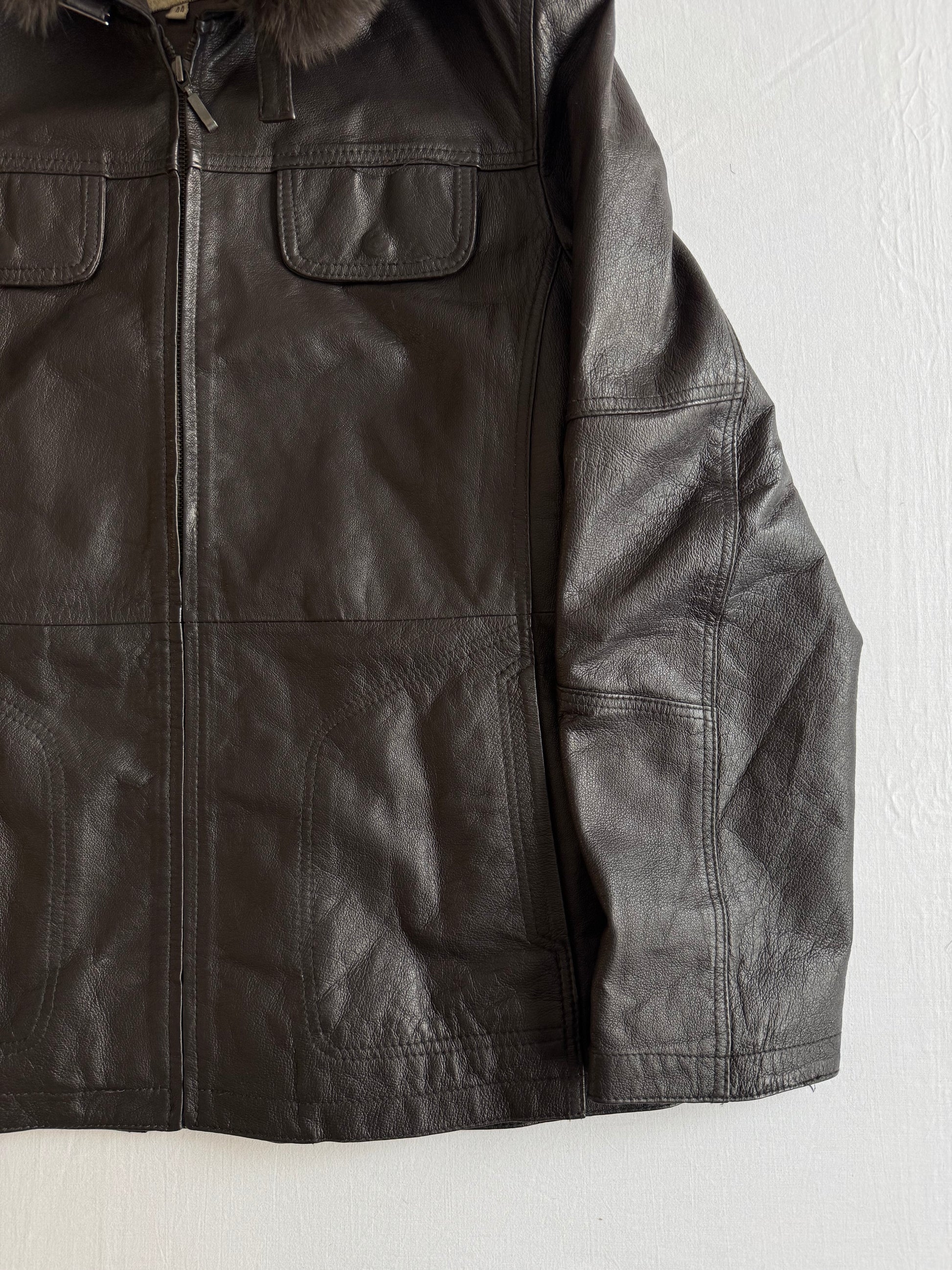 Jachetă Y2K din piele naturală, într-o nuanță de maro închis, cu glugă finisată cu blană naturală de vulpe vopsită. Siluetă feminină, specifică anilor 2000, cu un look statement și construcție solidă. Stare foarte bună per total; căptușeala prezintă unele urme de uzură / mici deteriorări, vizibile.