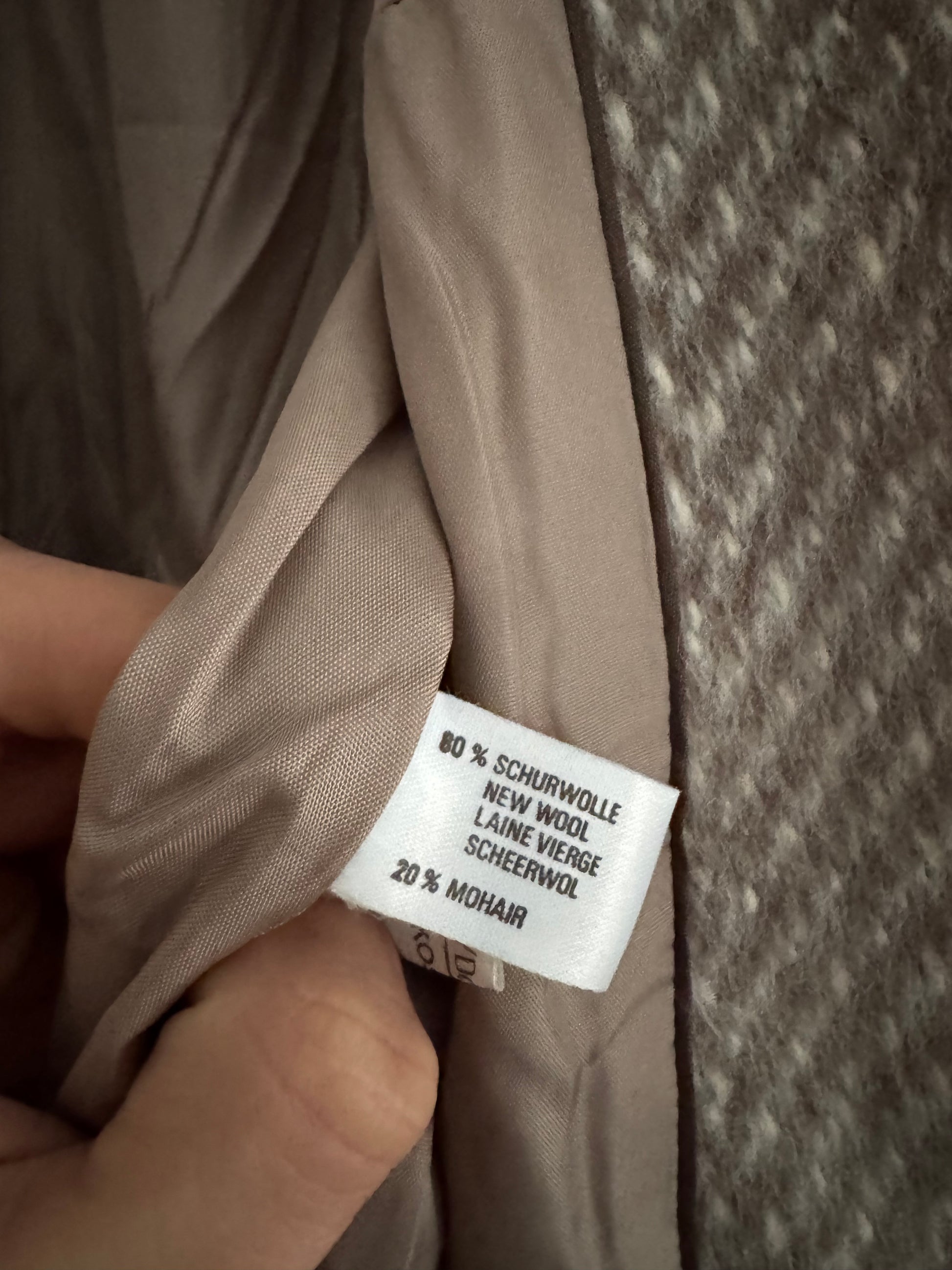 Palton vintage realizat dintr-un amestec de lână virgină și mohair, cu textură plăcută și structură frumoasă. Croială clasică, ușor de integrat în garderobe atemporale. Se află în stare foarte bună; un singur buzunar necesită o mică re-cusătură pe interior, fără a afecta purtarea sau aspectul exterior.