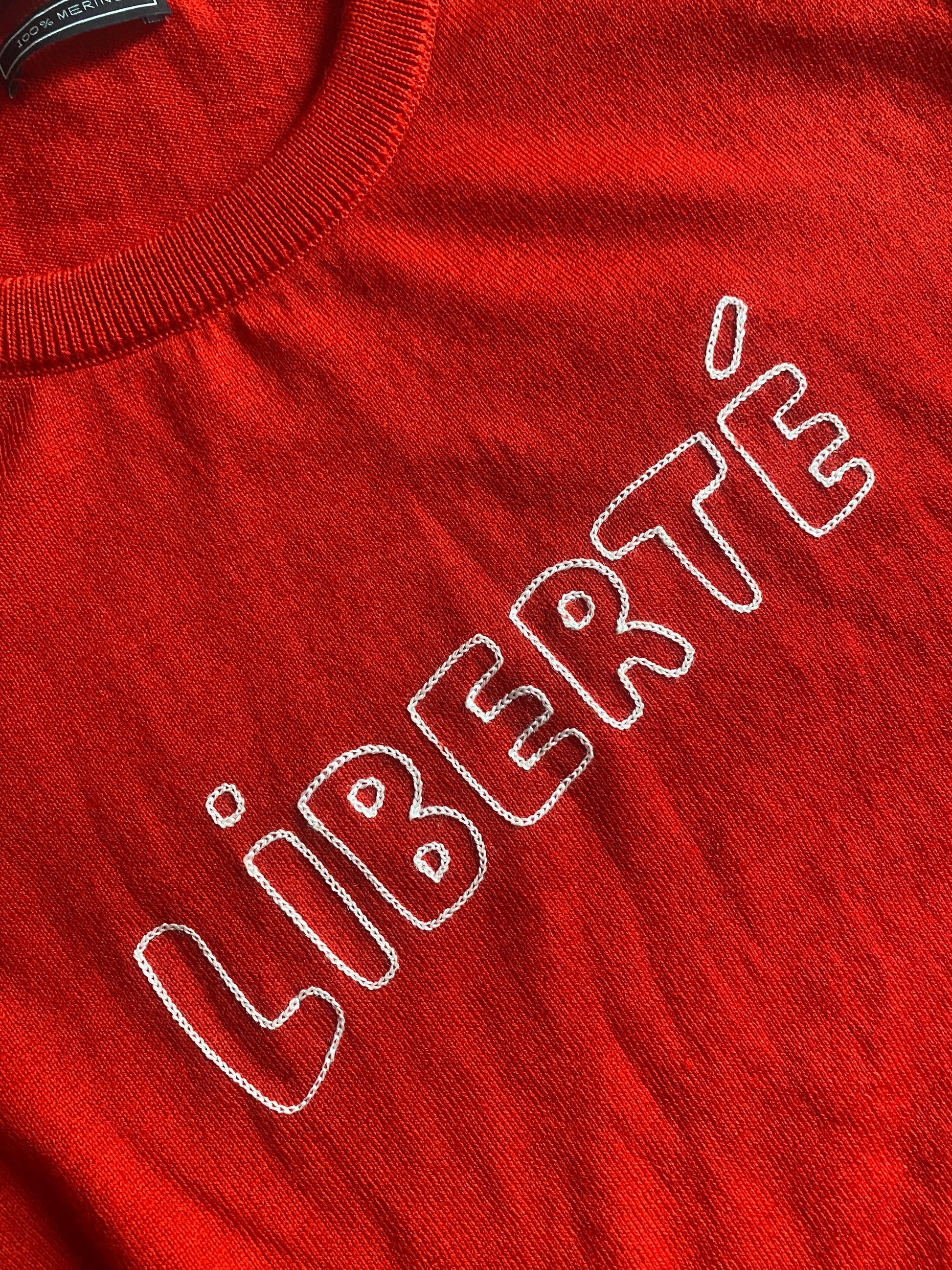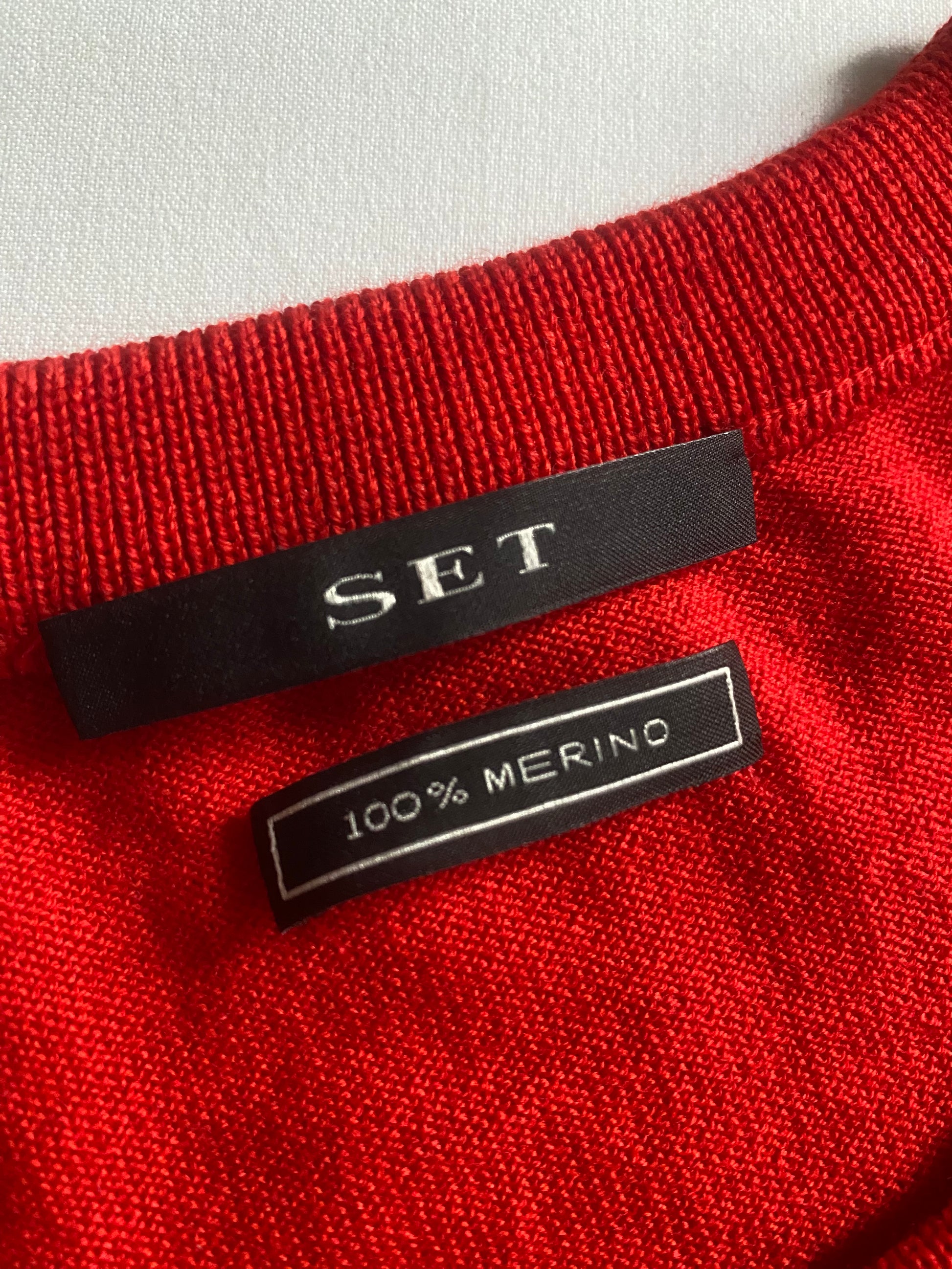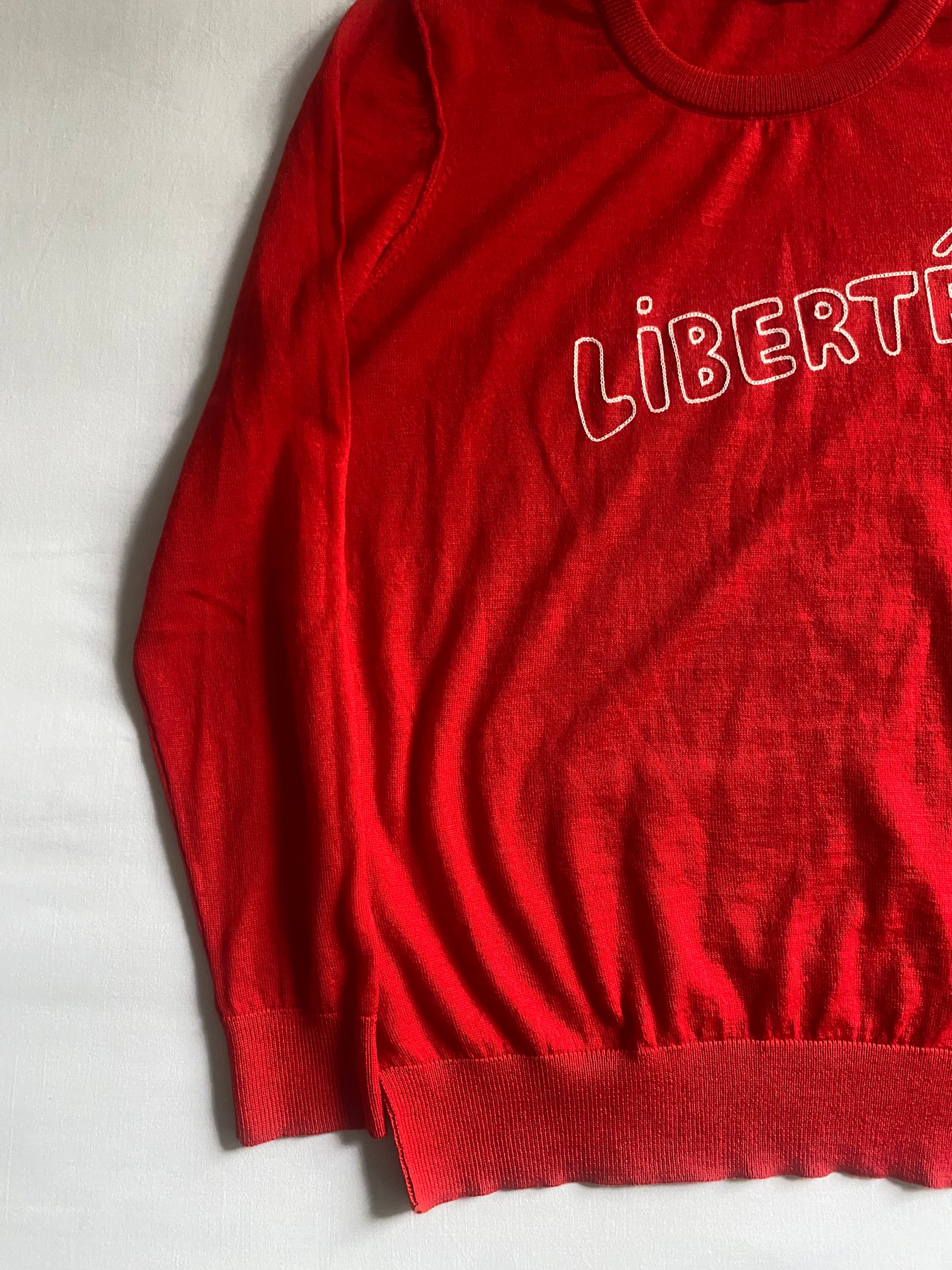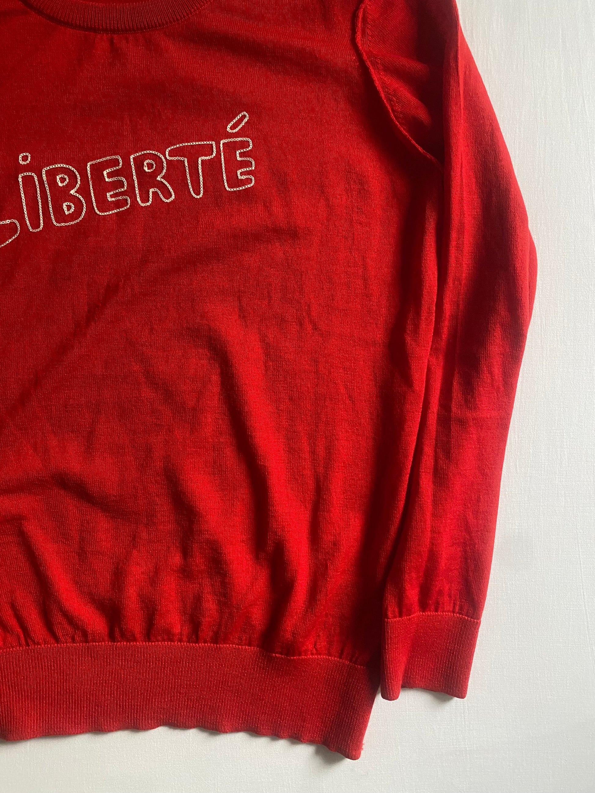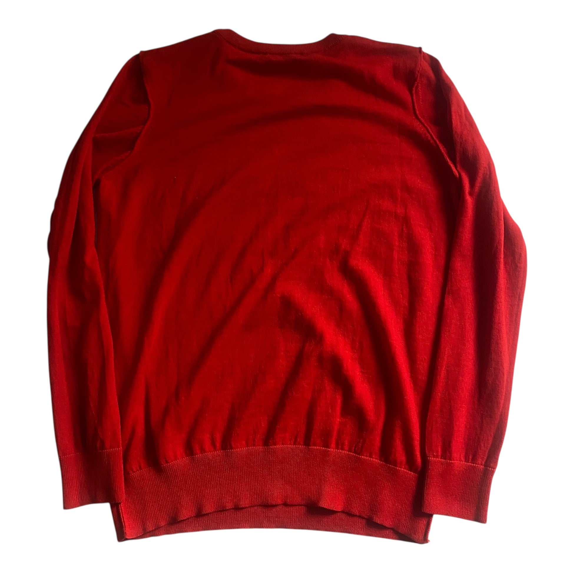 Pulover feminin din lână merinos, într-o nuanță intensă de roșu aprins, cu detalii scrise (scripted) ce îi oferă un look deosebit. Croială clasică și material premium, moale și confortabil. Piesa este în stare foarte bună, fără defecte majore.