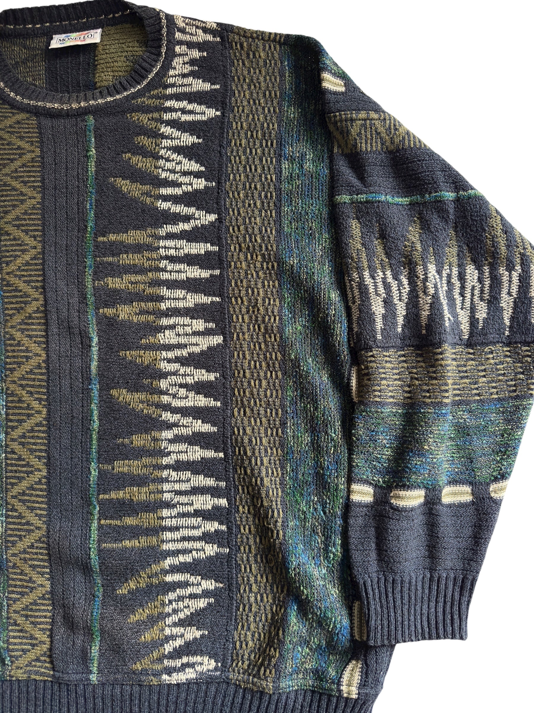 Pulover vintage Monelli, confecționat în Italia dintr-un mix de bumbac și acrilic, cu textură moale și confortabilă. Croială clasică, lejeră, etichetat mărimea 50 (Men’s L). Piesa se află în stare foarte bună, ideală pentru ținute casual cu aer retro.