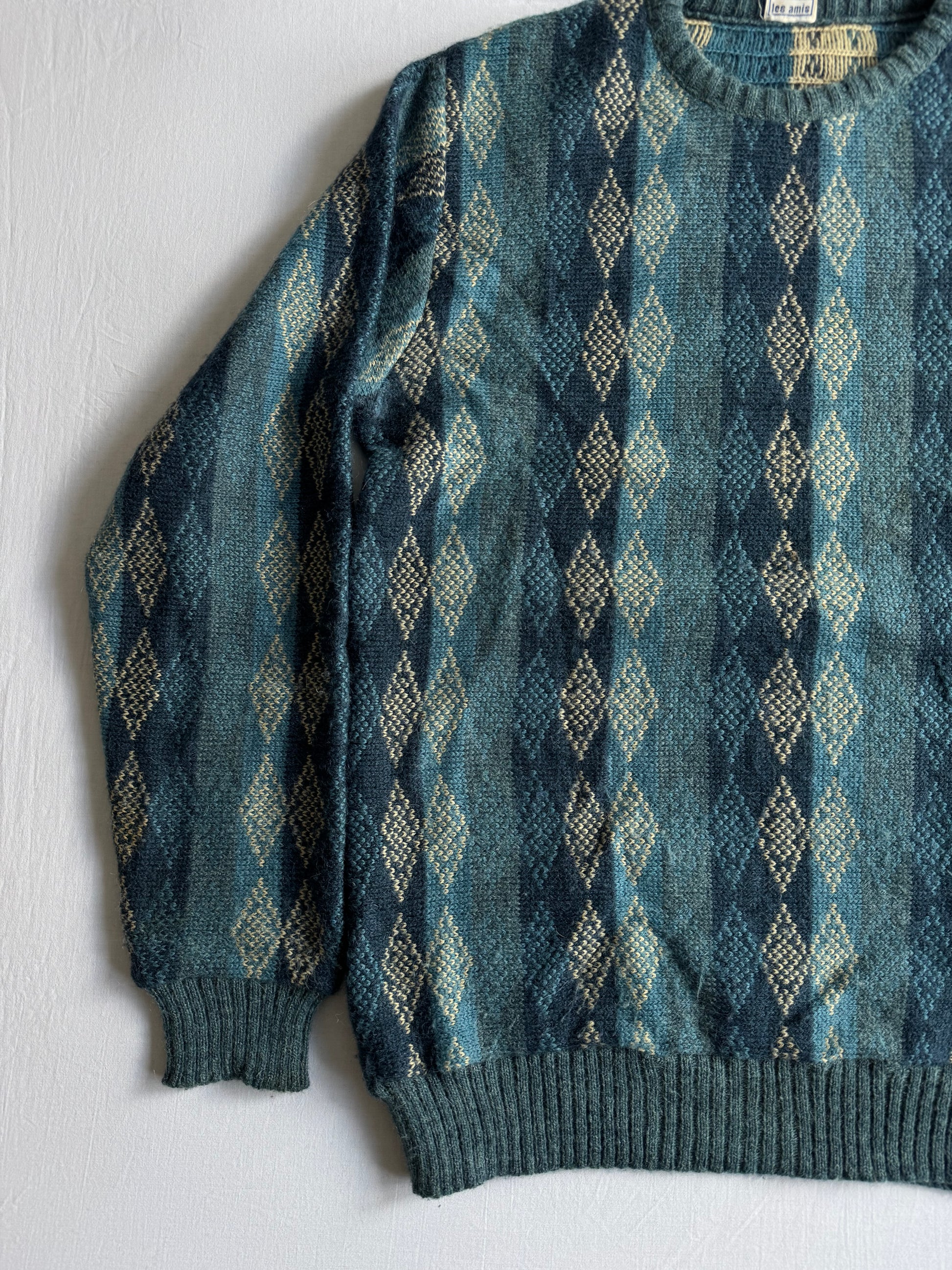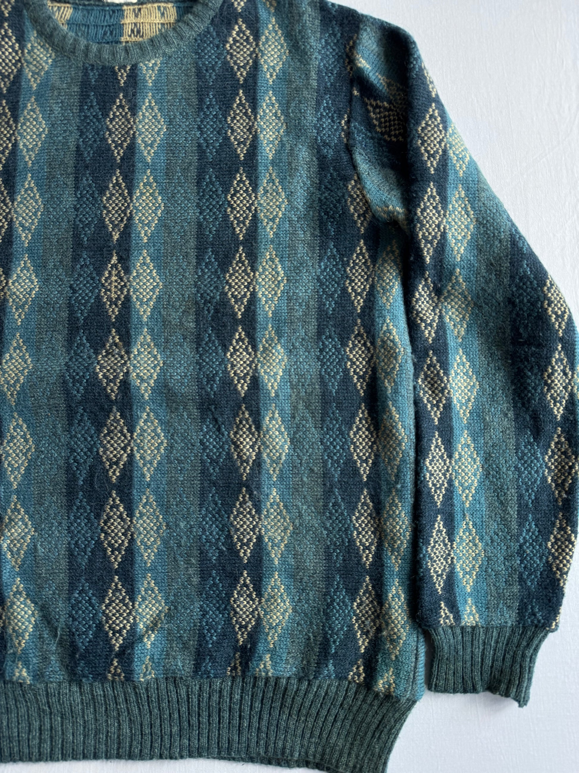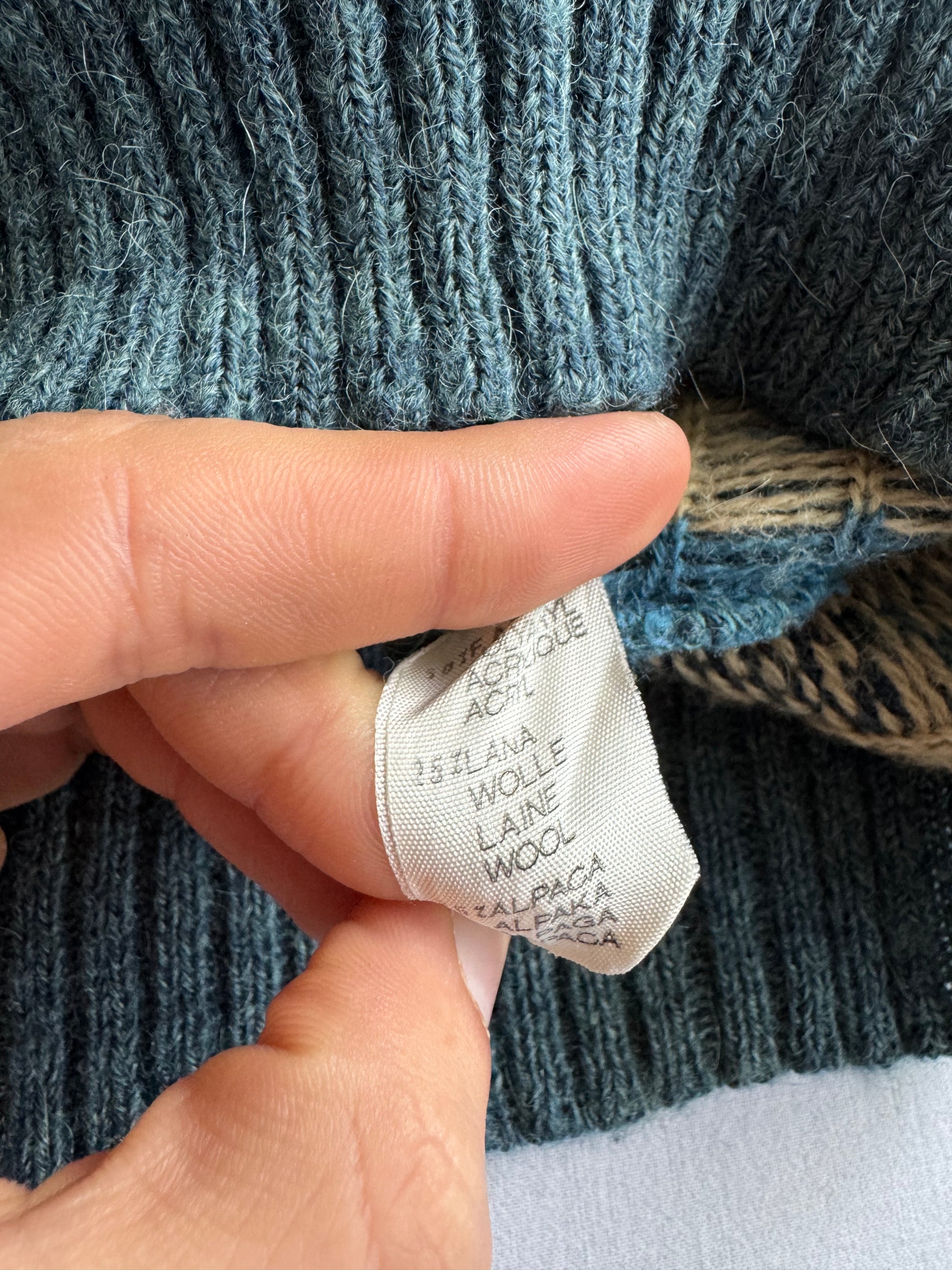 Pulover vintage realizat din blend călduros de fibre (25% lână, 25% alpaca, 50% acrilic), în nuanță albastru cu model decorativ, oferind textură plăcută și confort. Etichetat 52, potrivire pentru un L bărbați. Piesă păstrată în stare foarte bună.