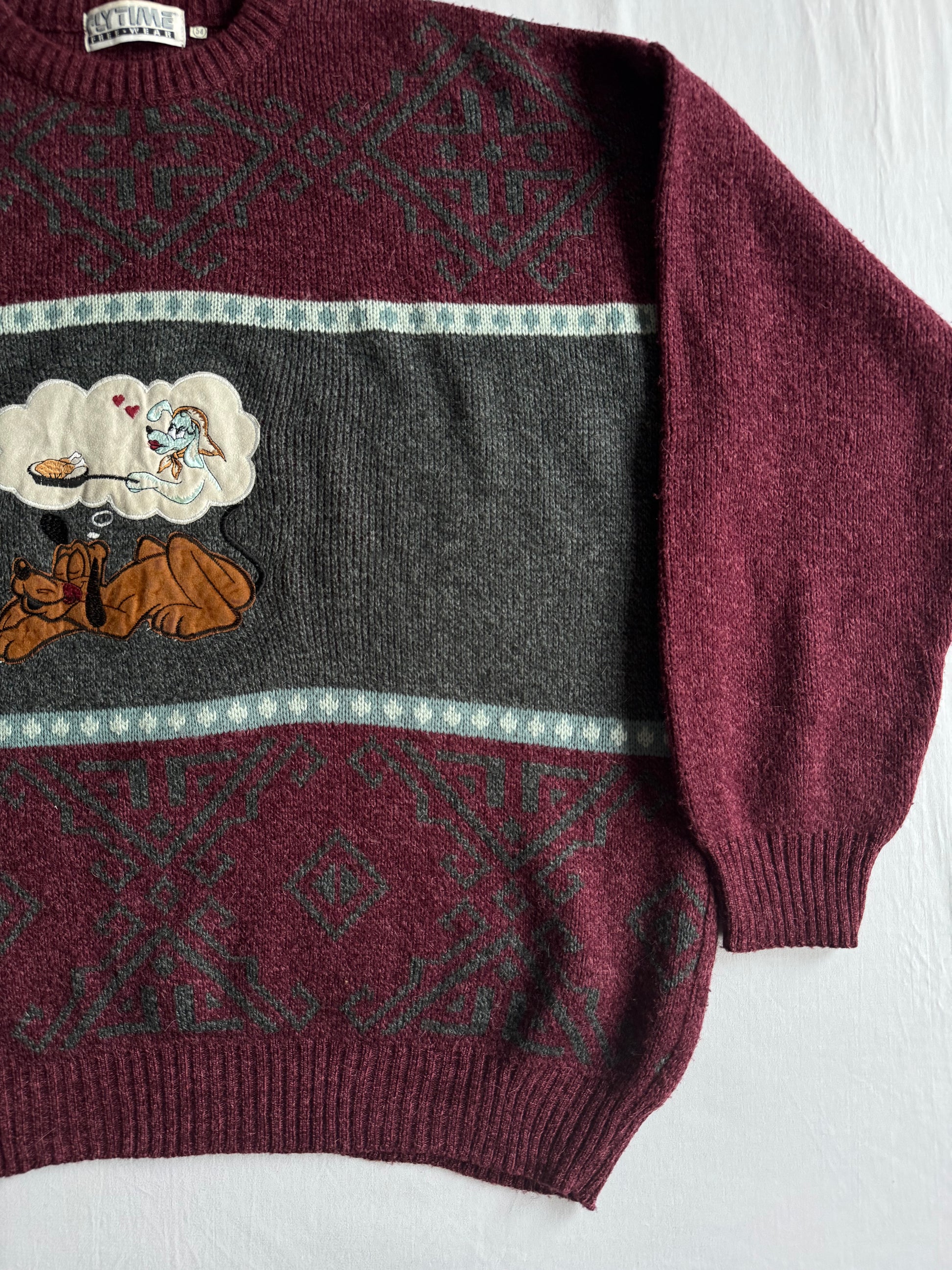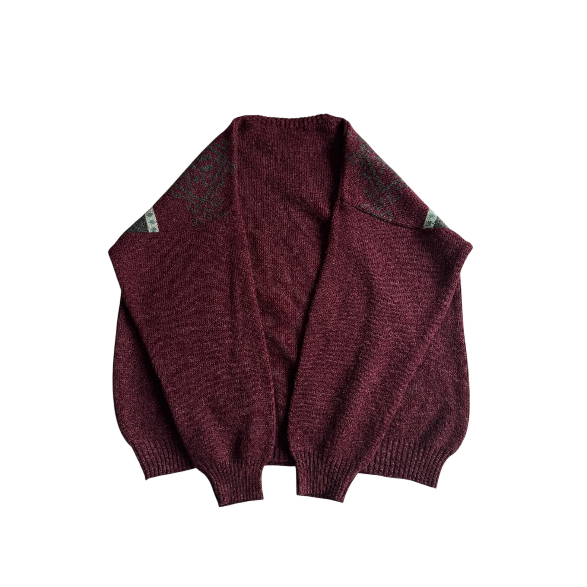 Pulover vintage pentru bărbați, în nuanță burgundy, cu broderie câine, detaliu statement cu aer playful. Realizat dintr-un amestec de 70% acril și 30% lână, oferă confort și căldură. Croială lejeră, potrivită pentru un XL bărbați. Fabricat în Italia și păstrat în stare foarte bună.