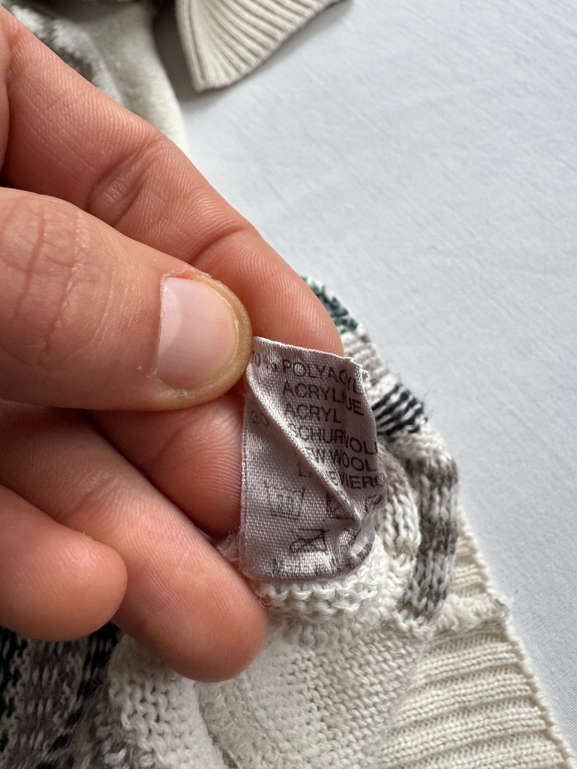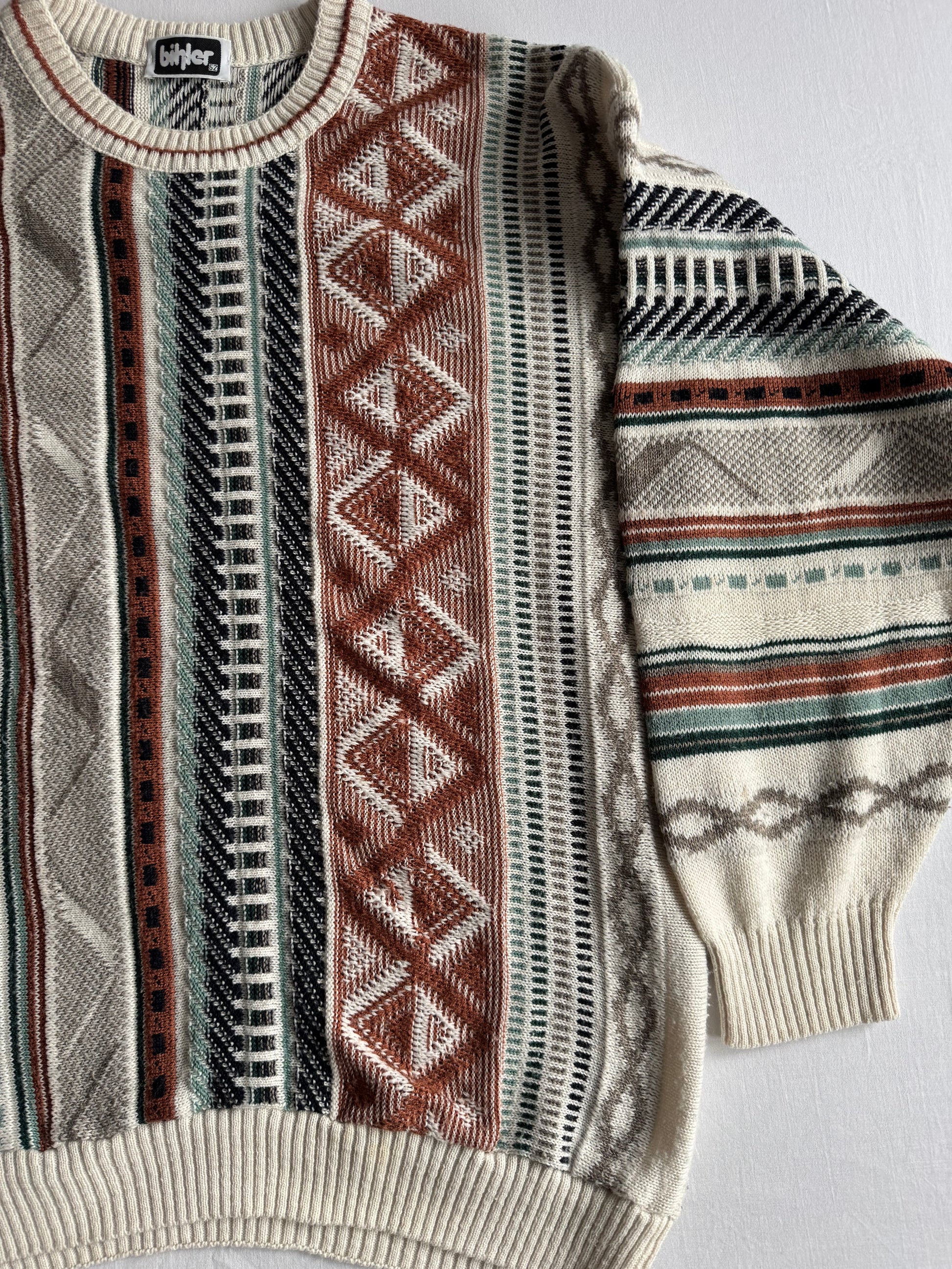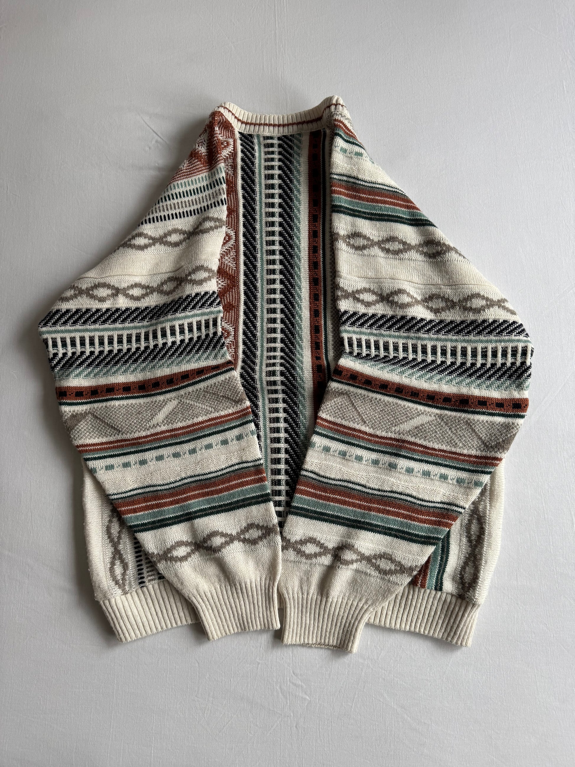 Pulover vintage cu model abstract, design statement specific esteticii retro. Realizat dintr-un mix de 30% lână pură nouă și 70% acrilic, oferă căldură și durabilitate. Fabricat în Germania de Vest, piesă autentică vintage, păstrată în stare foarte bună. Etichetat 52 – L bărbați.