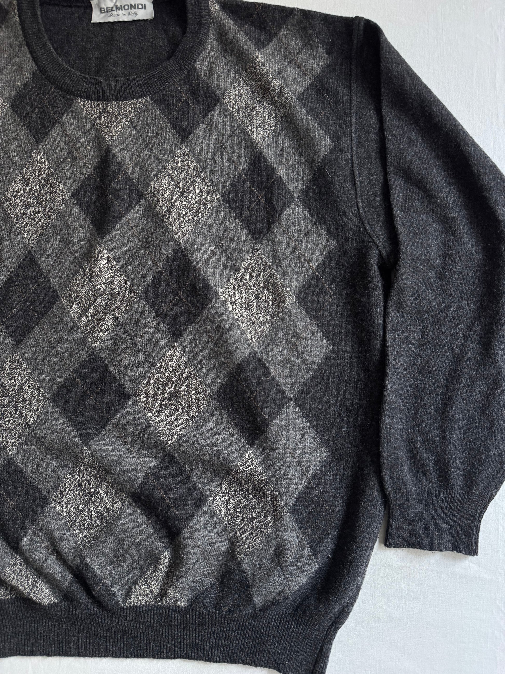 Pulover vintage elegant, fabricat în Italia din 90% lână merinos fină (lambswool extra fine), într-o nuanță de gri închis cu un subtil model argyle clasic. Țesătură moale și călduroasă, perfectă pentru sezonul rece. Prezintă uzură ușoară la manșete, însă se află în stare generală foarte bună.