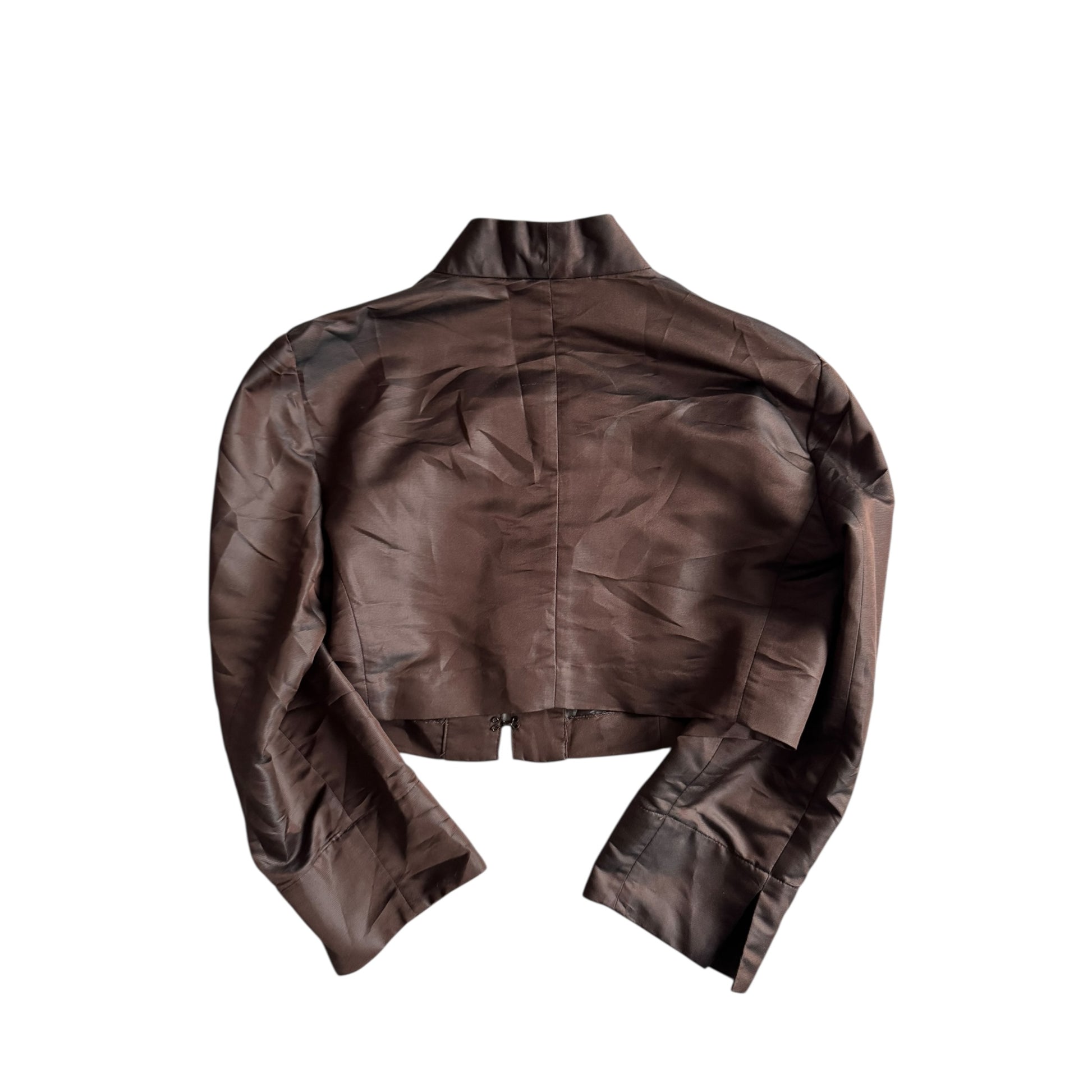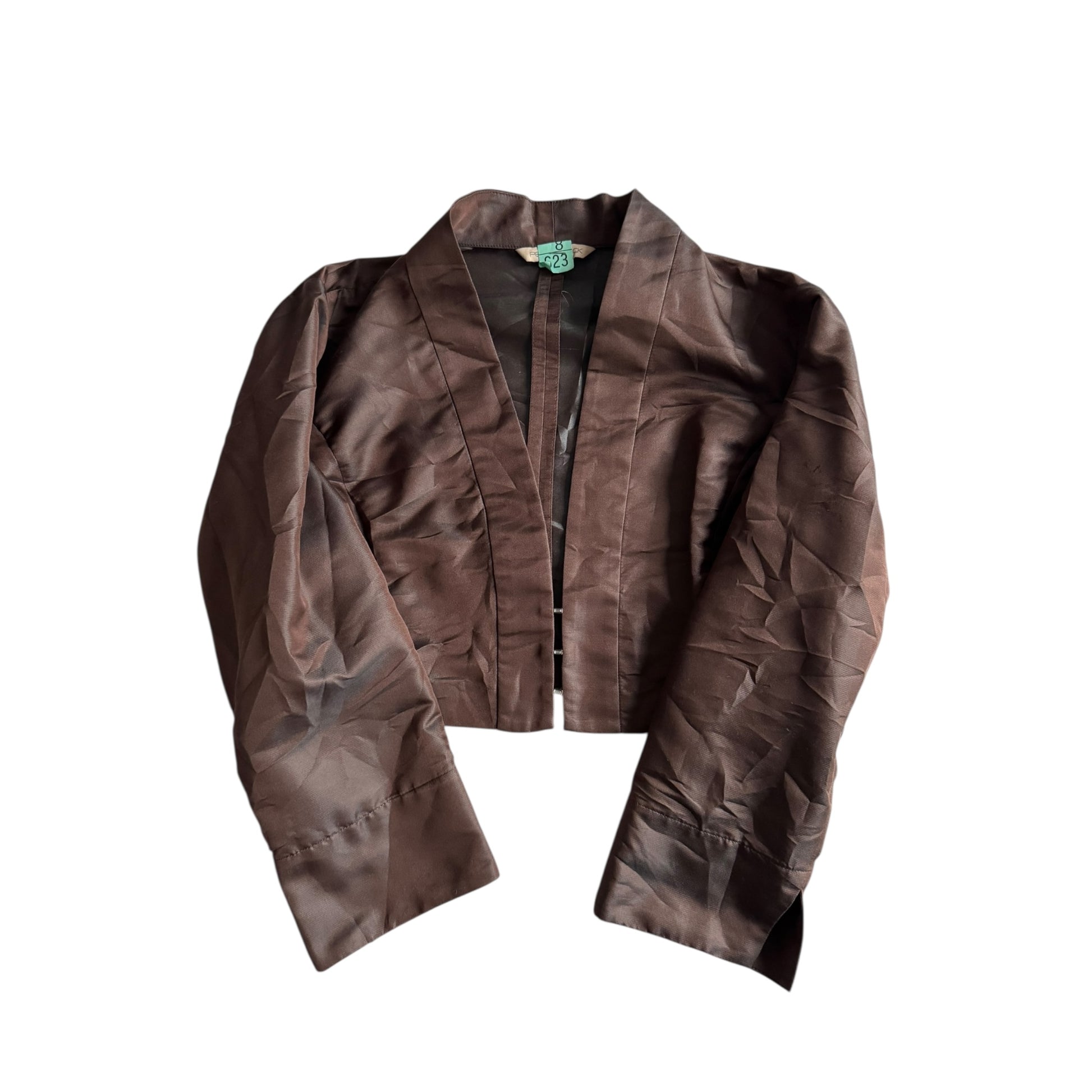 Sacou cropped Pennyblack din perioada Y2K, într-o nuanță elegantă de maro închis. Fabricat din 100% mătase, cu un luciu discret și o textură luxoasă. Croială scurtă, feminină, perfectă pentru ținute classy sau minimaliste. Stare excelentă.