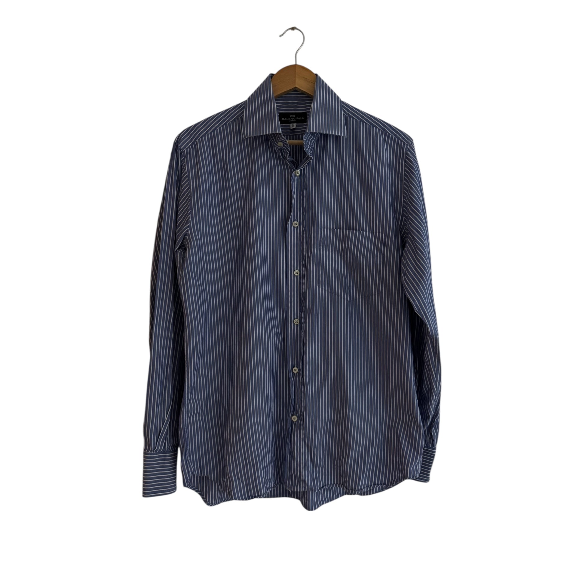 Cămașă vintage Balenciaga cu dungi verticale albastre, croială clasică pentru bărbați. Prezintă logo-ul vechi brodat discret pe manșetă și se află în stare foarte bună, fără defecte vizibile.