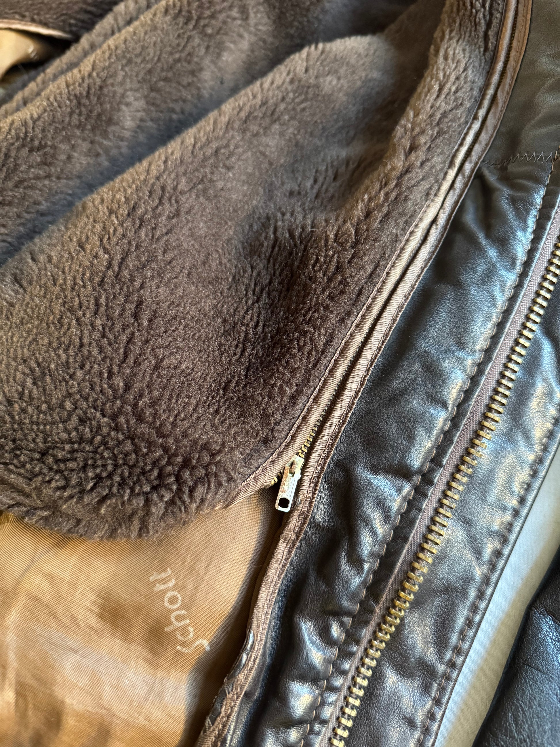 Geacă vintage autentică Schott NYC 184SM A-2, confecționată în SUA din 100% piele de vacă (cowhide leather), cu design clasic de flight jacket. Model iconic, extrem de rezistent și confortabil, cu căptușeală detașabilă din imitație de shearling, perfect pentru toate sezoanele.