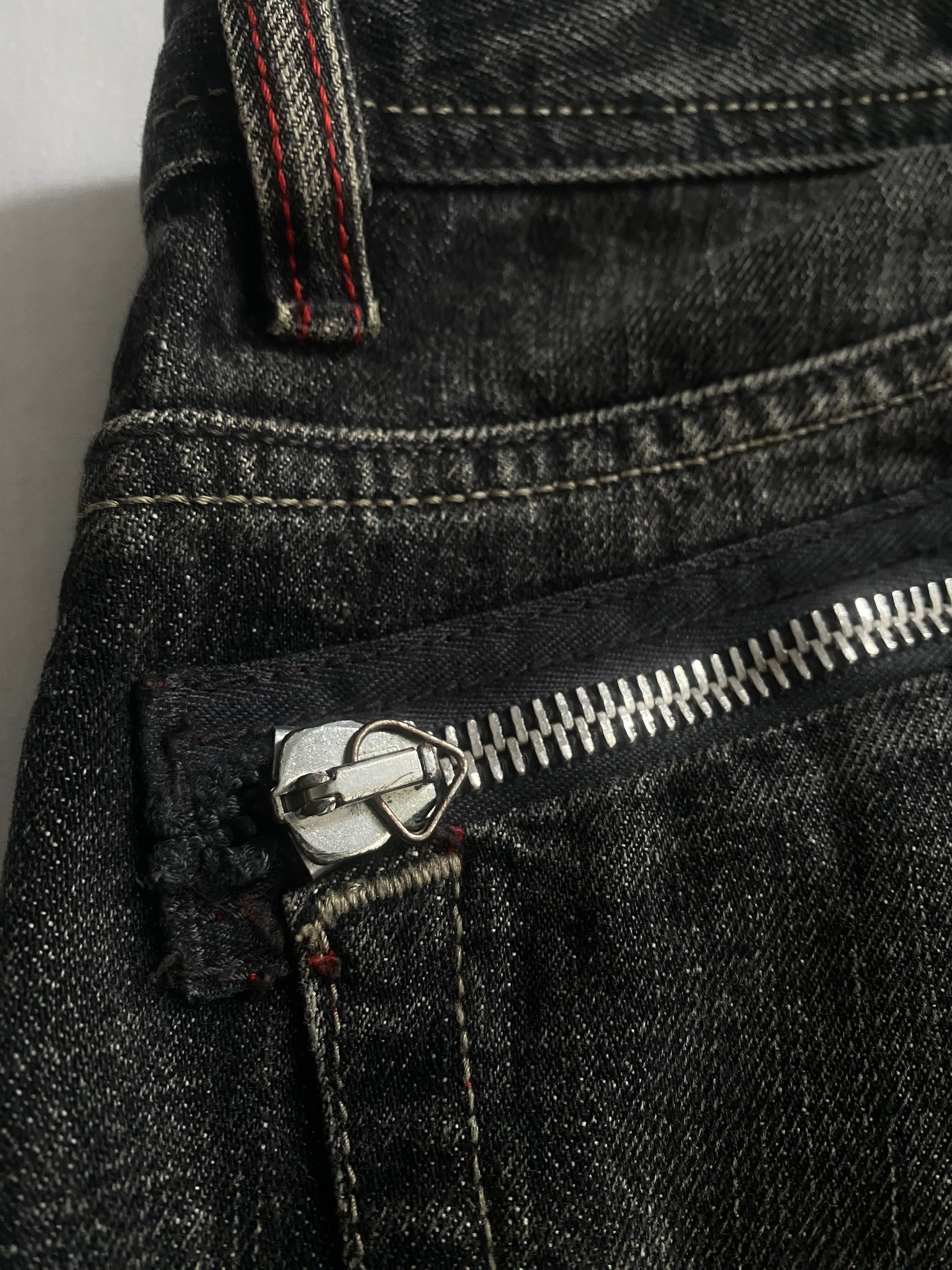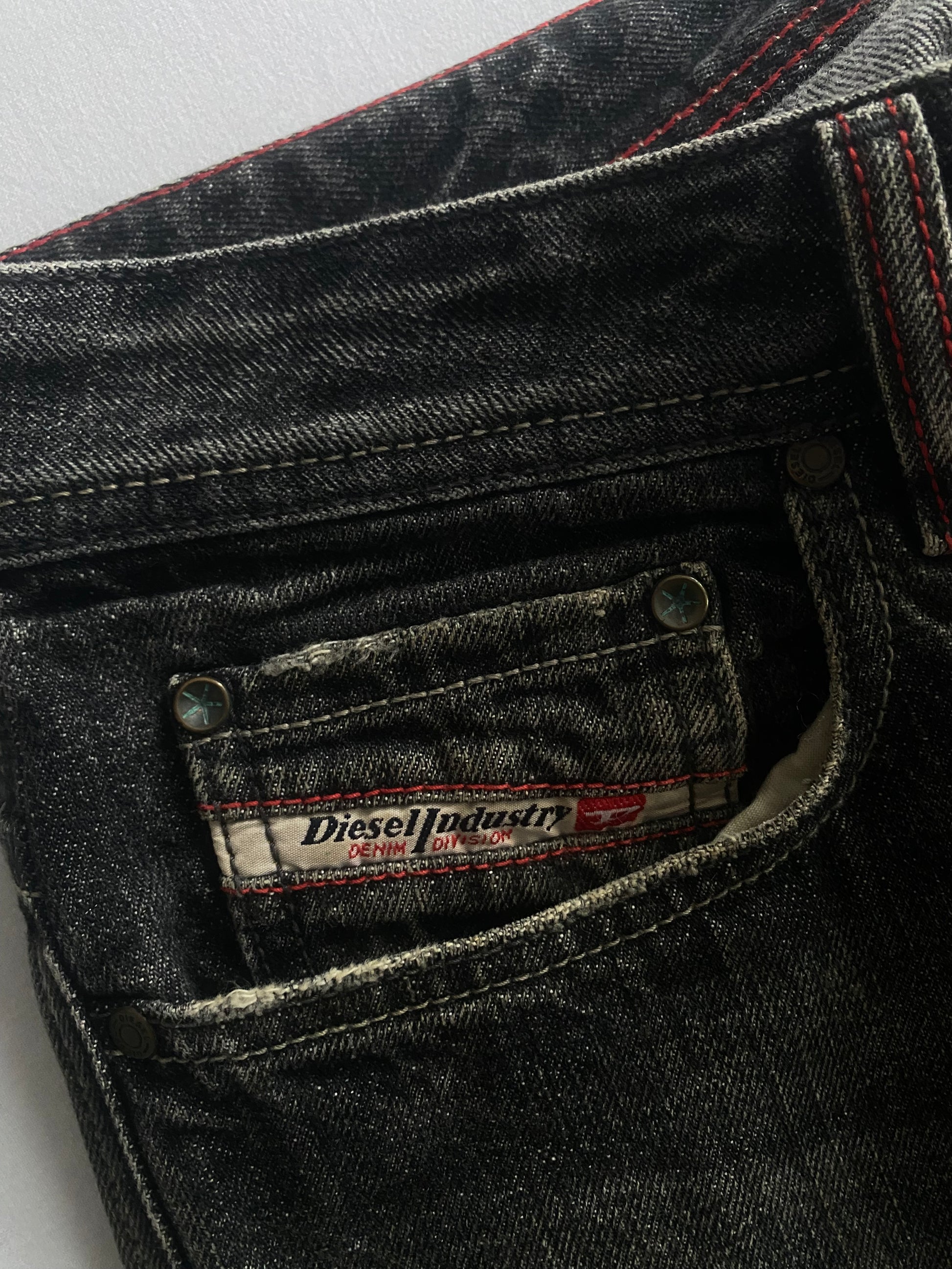 Blugi negri baggy Diesel din era Y2K, cu broderie distinctivă pe buzunarele din spate. Made in Italy.