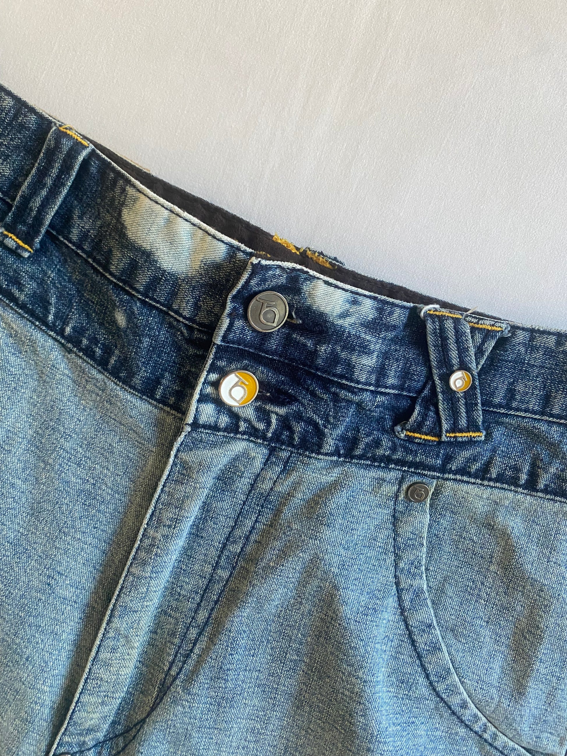 Jeanși Y2K Two Angle cu croială baggy, imprimeuri și broderii unice, specific stilului early 2000s. Piesă statement, perfectă pentru outfituri retro sau streetwear. În stare foarte bună, fără defecte majore.